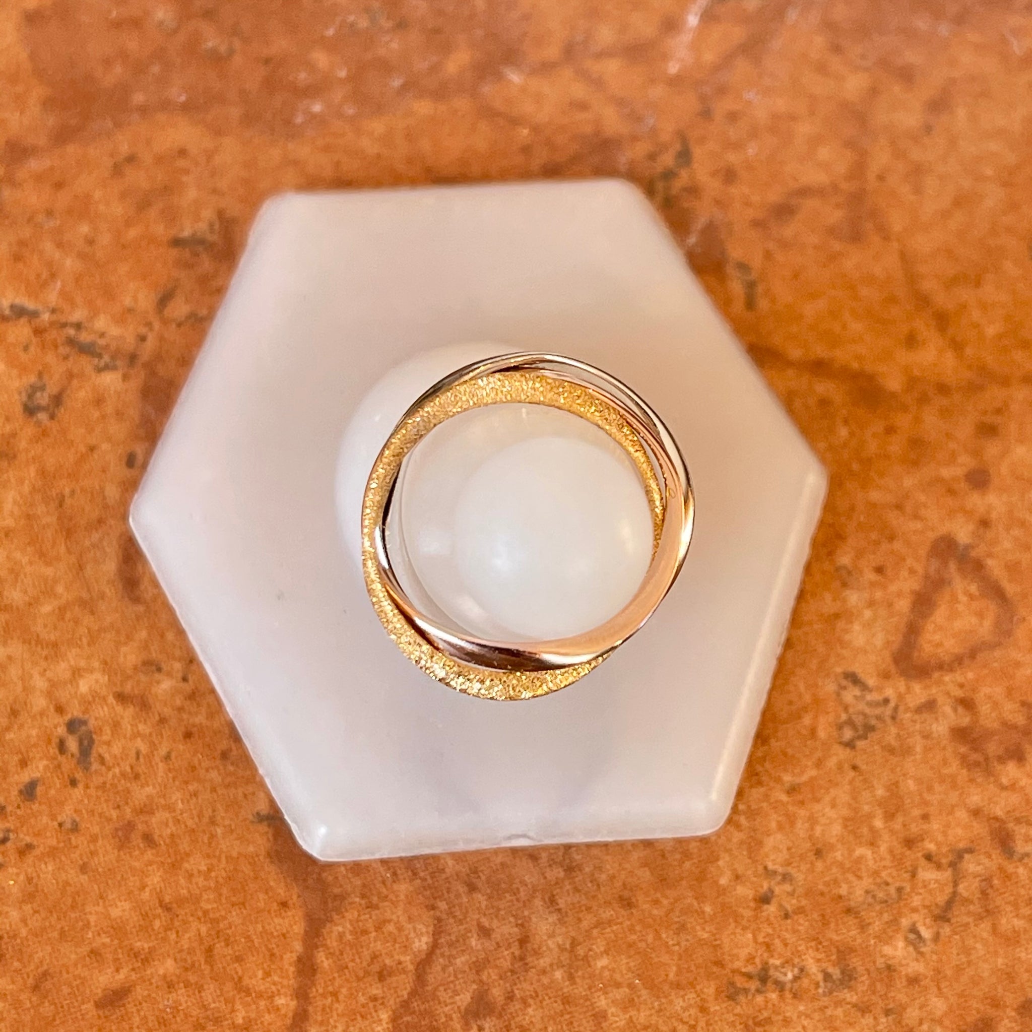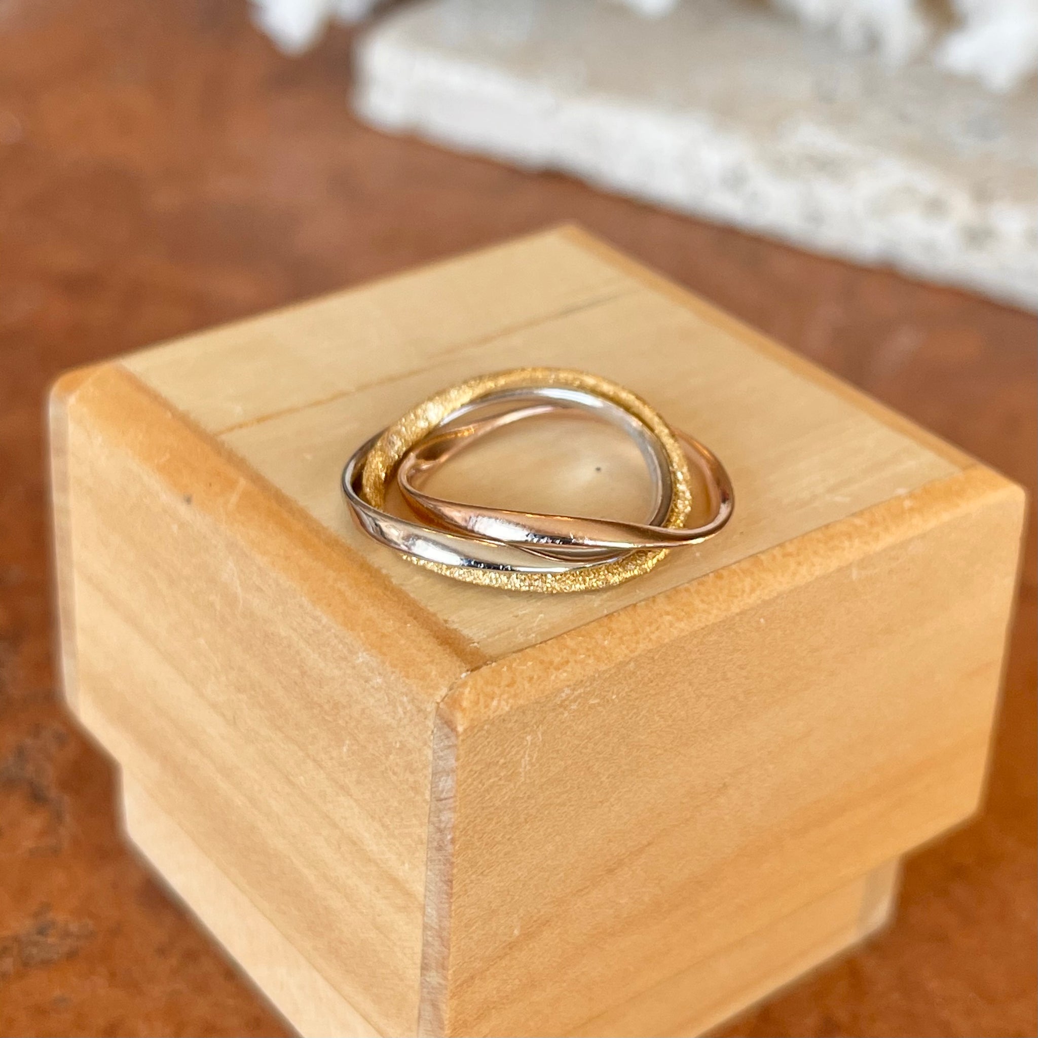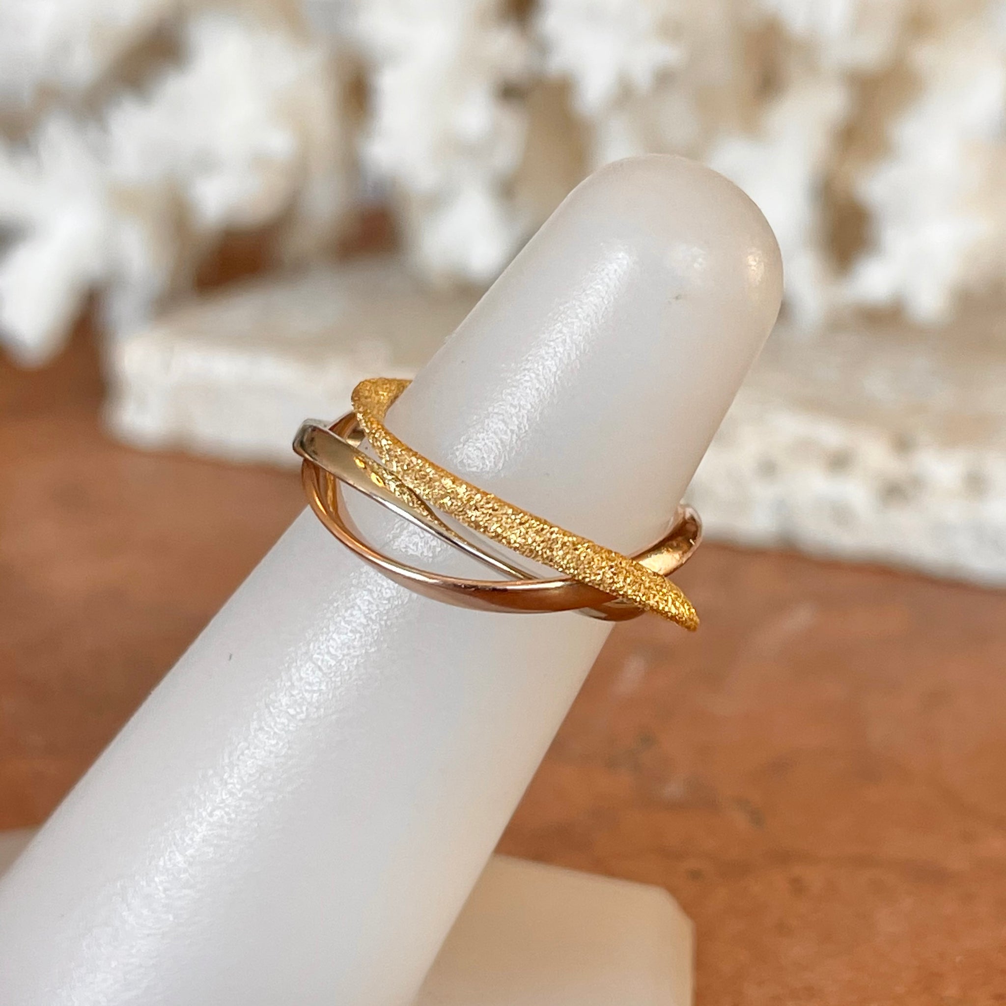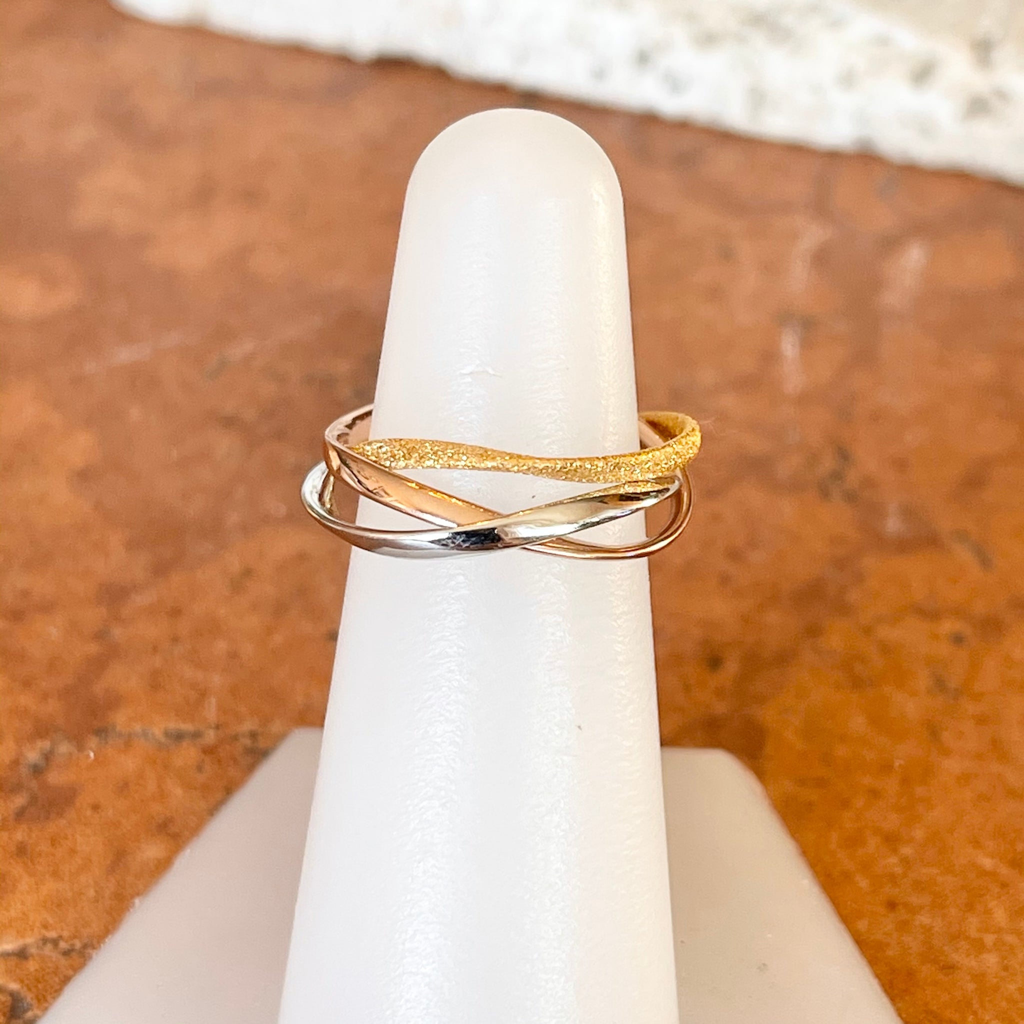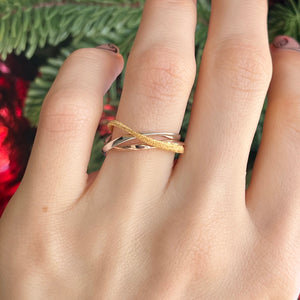 Intertwining sterling silver, rhodium rose + gold plated bands create this one of a kind ring. Wear this unique piece with a mixture of gold colors!