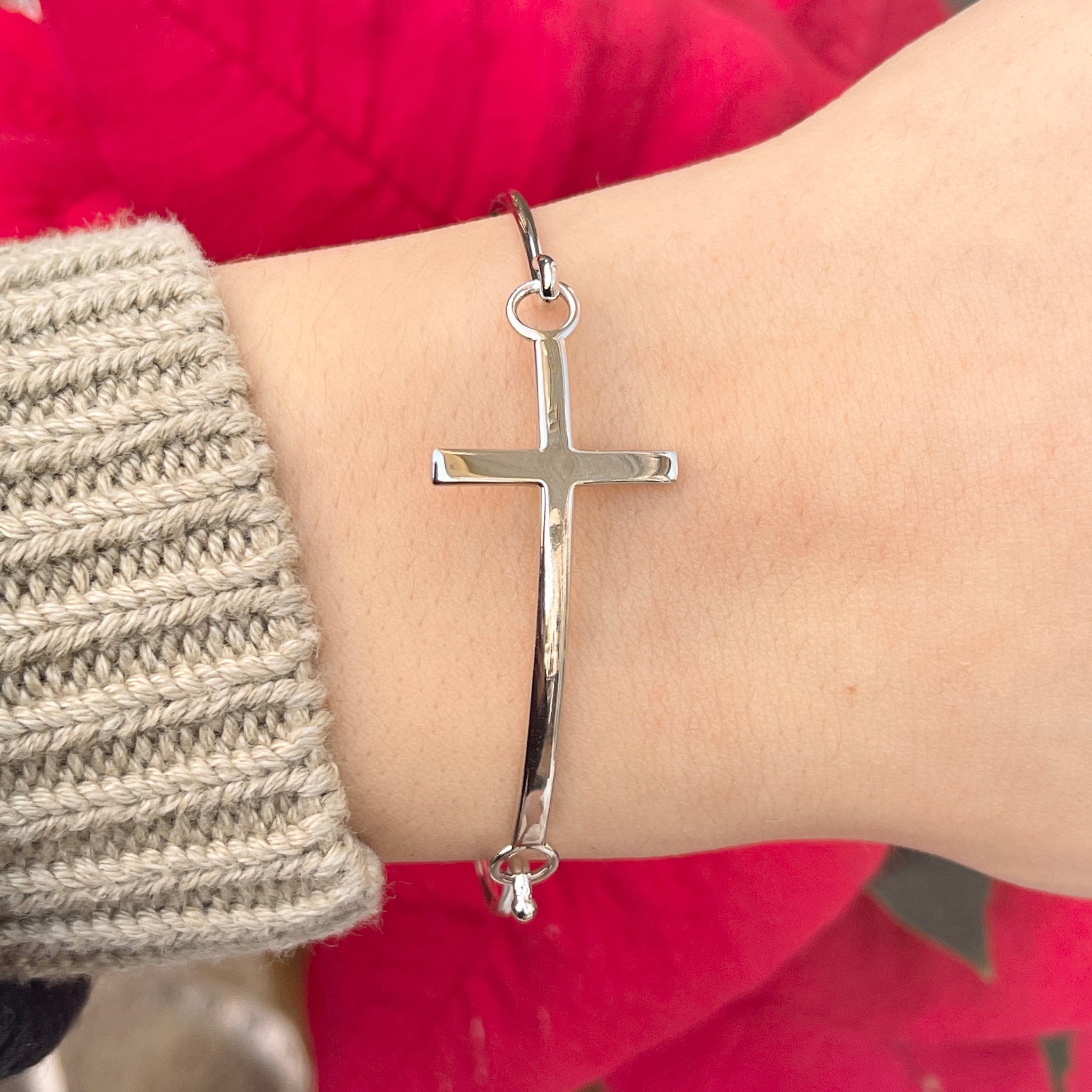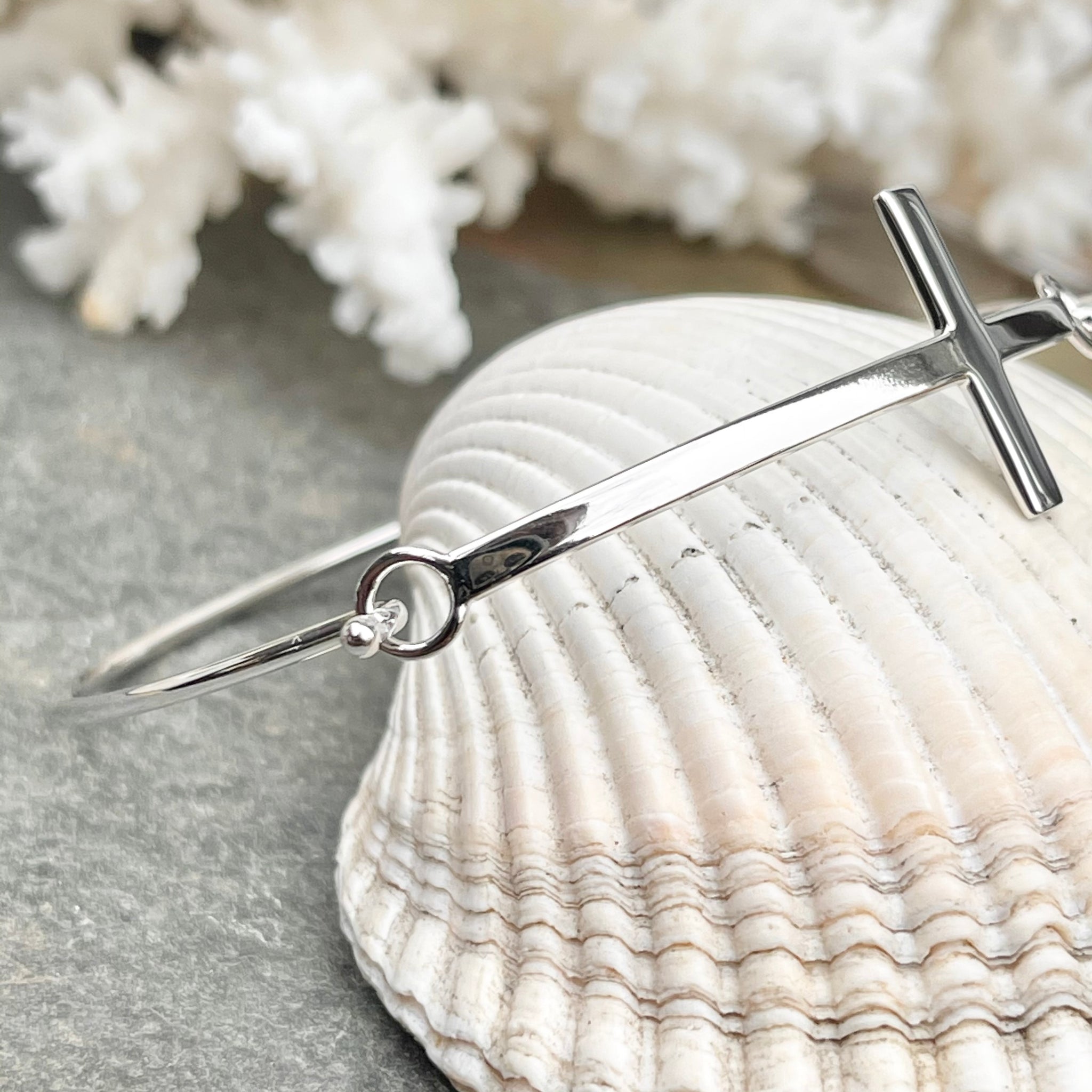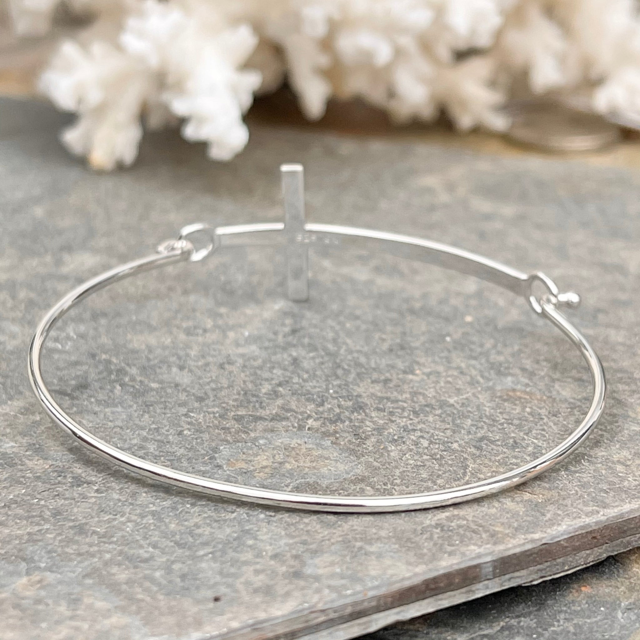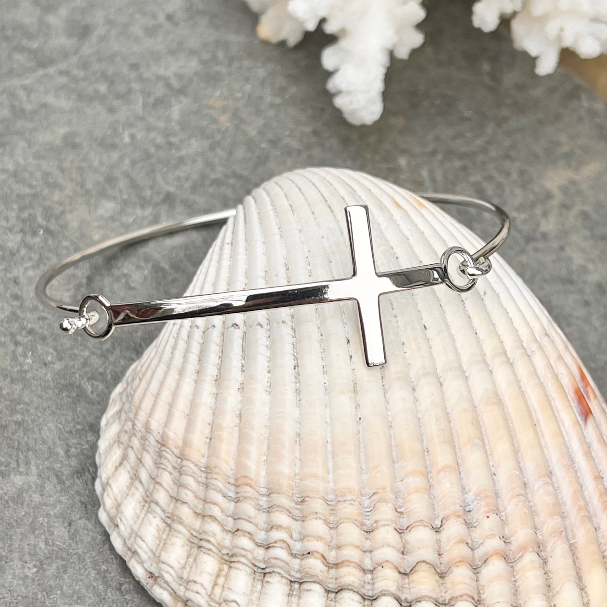 Polished sterling silver thin bangle bracelet with sideways cross design. Great stacking bracelet! Cross is curved concave to fit nice on the wrist, not flat.