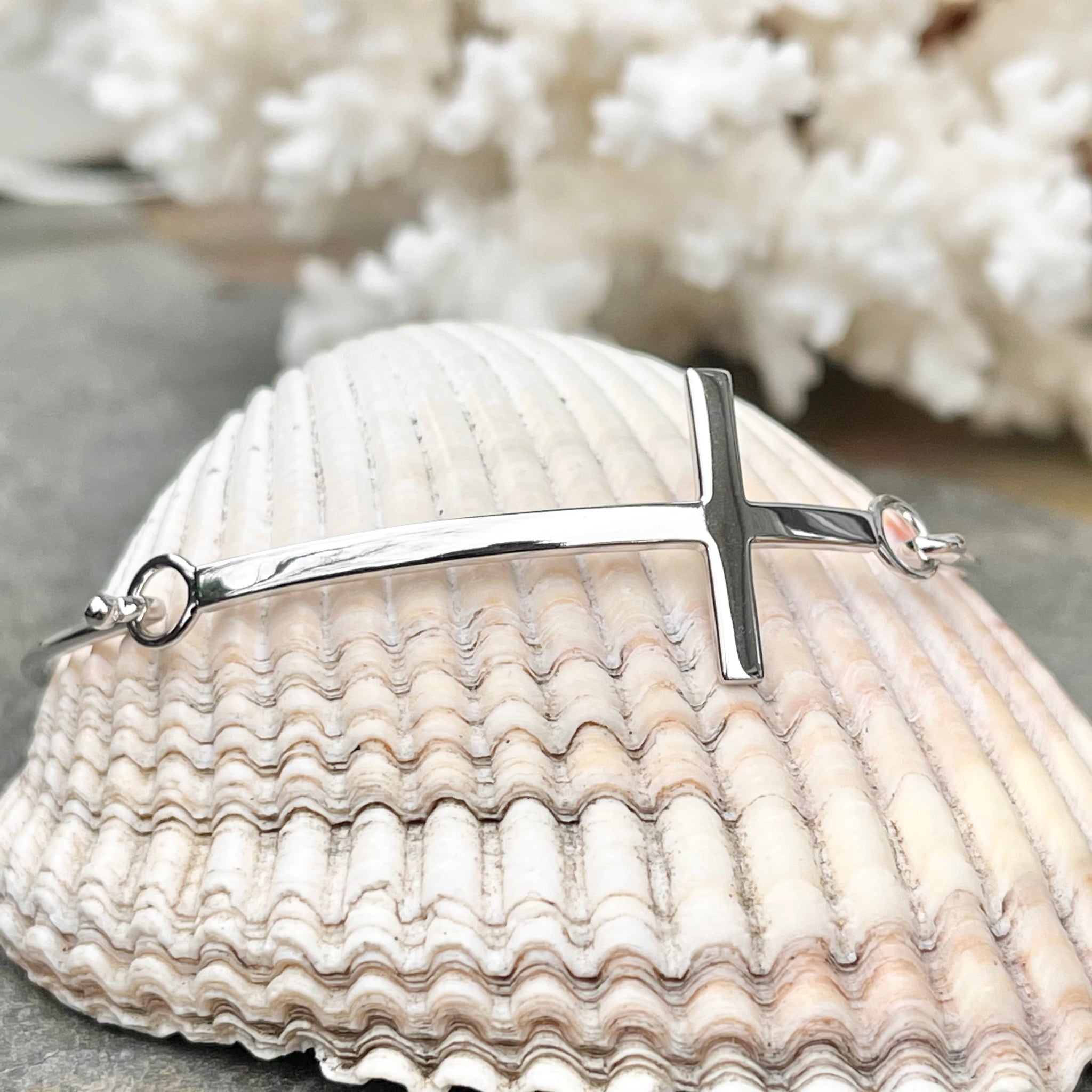 Sterling Silver Sideways Cross Plaque Bangle Bracelet
