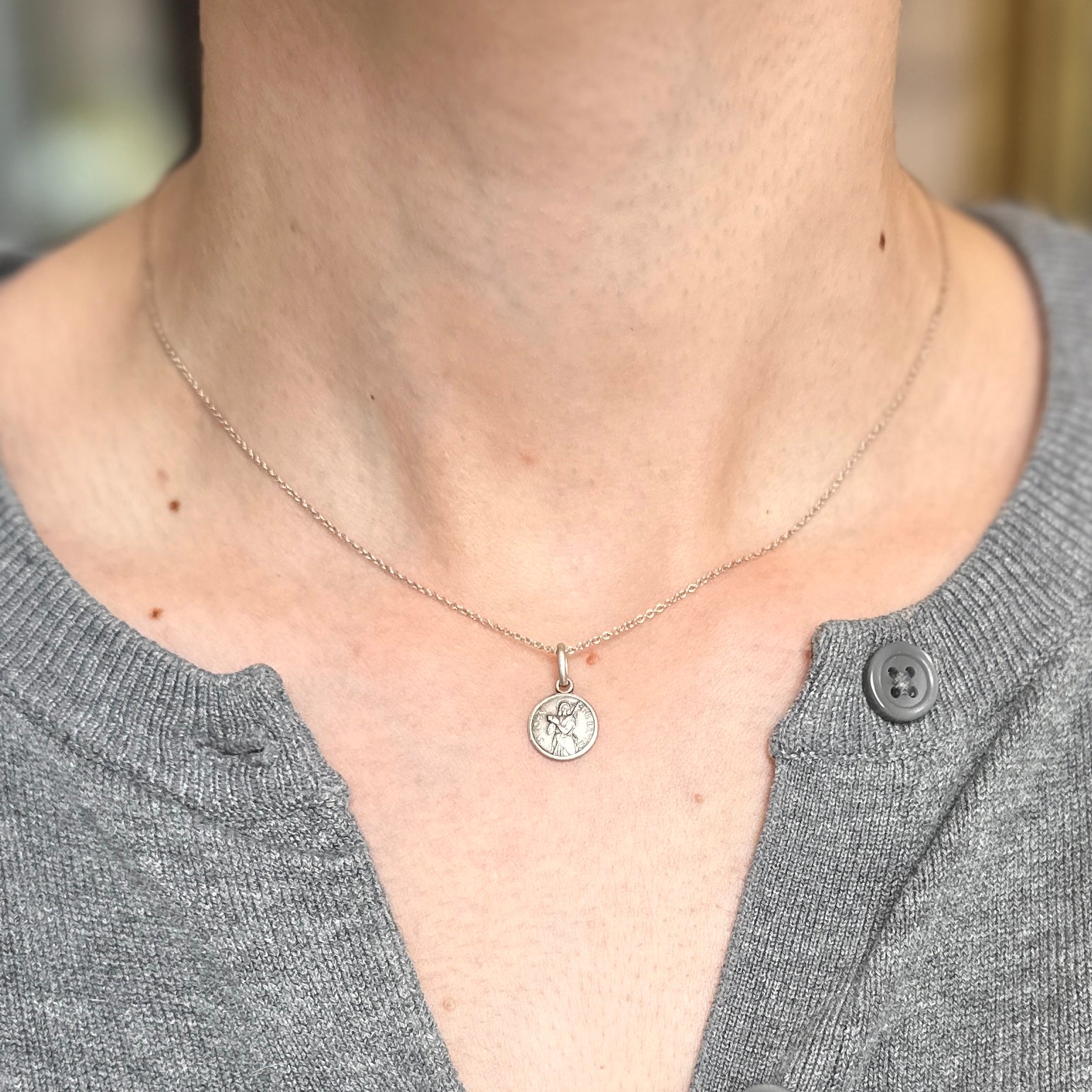 Sterling silver St John the Baptist patron saint small, round medal pendant in a antiqued, matte-finish. Saint John the Baptist is invoked as the patron saint of baptism, monastics, hermits, converts, tailors, prisoners, and many other occupations and causes.