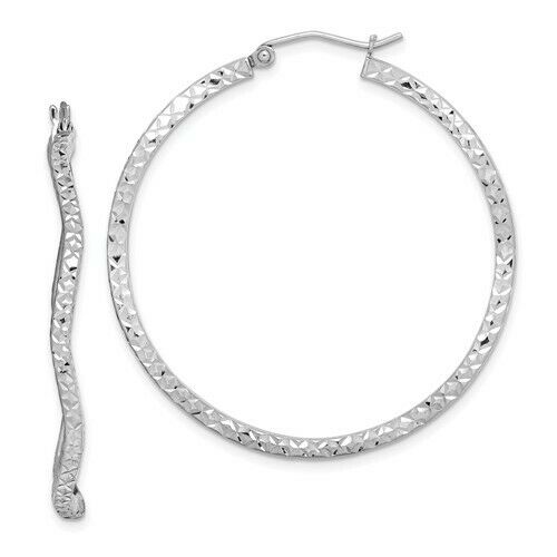 Sterling silver wavy diamond-cut shiny finish hoop earrings. Medium-to-large size hoop earrings with cool, eye-catching texture.