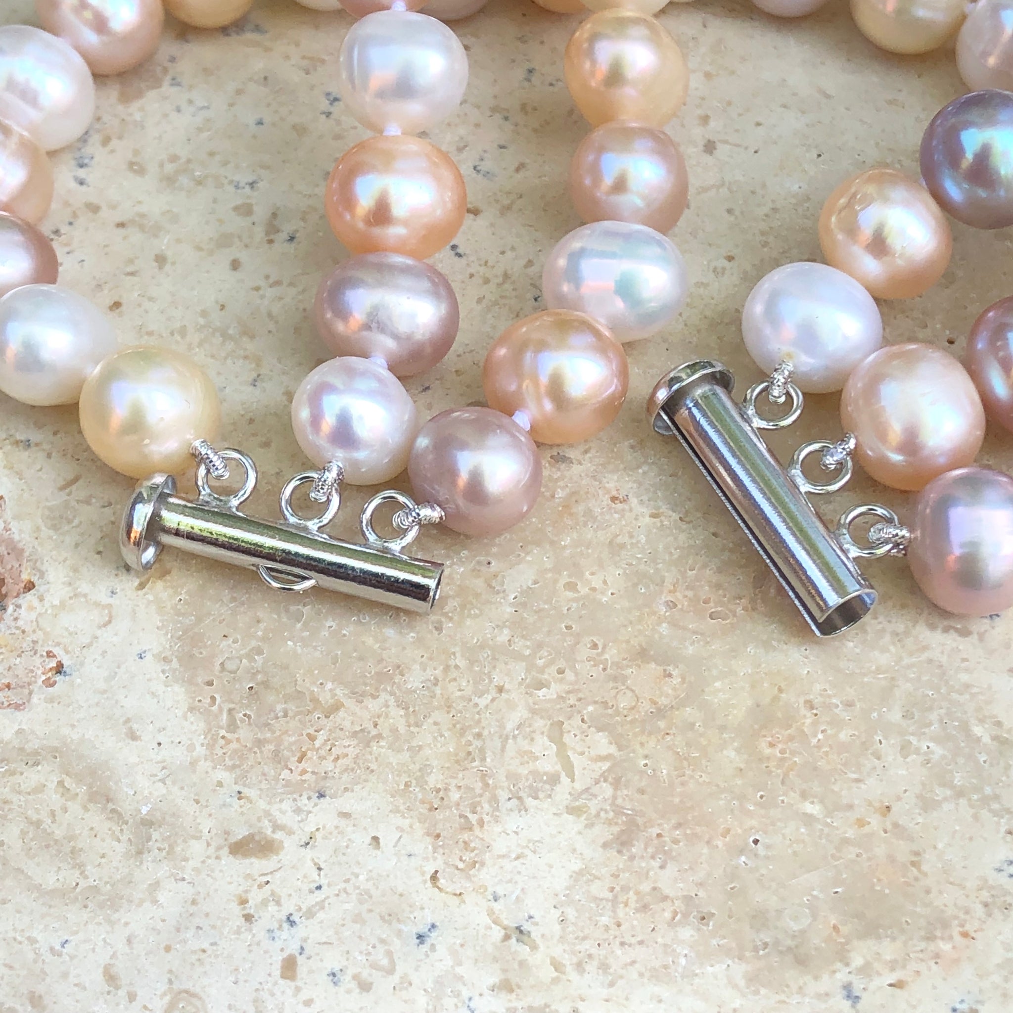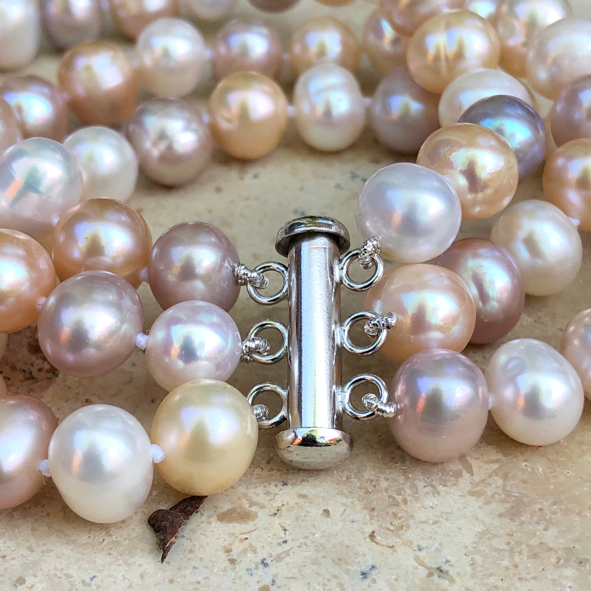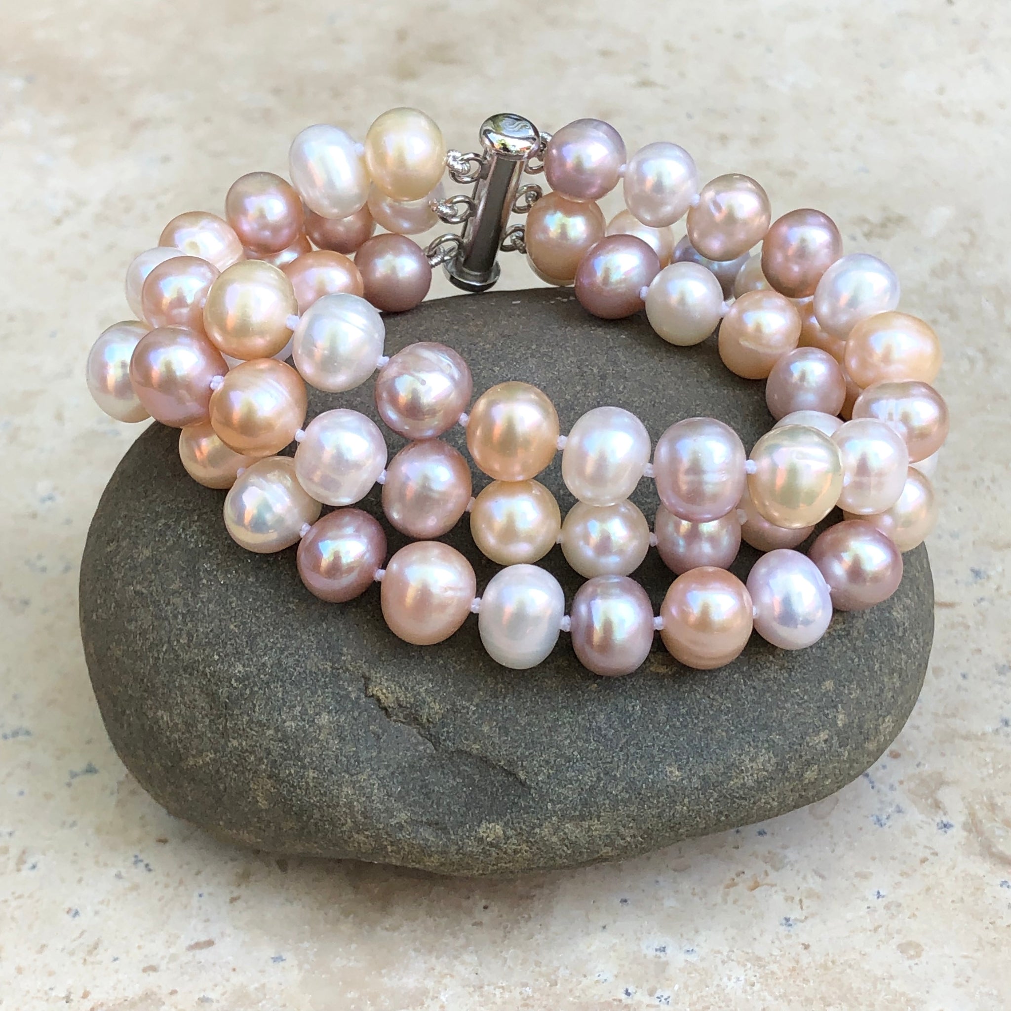 Sterling Silver White + Pink Freshwater Cultured Pearl Triple Strand Bracelet