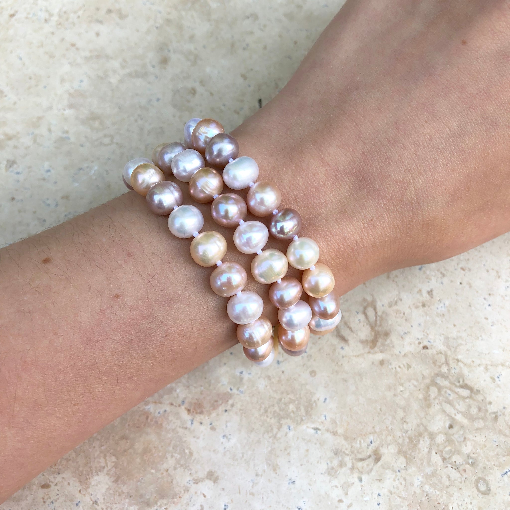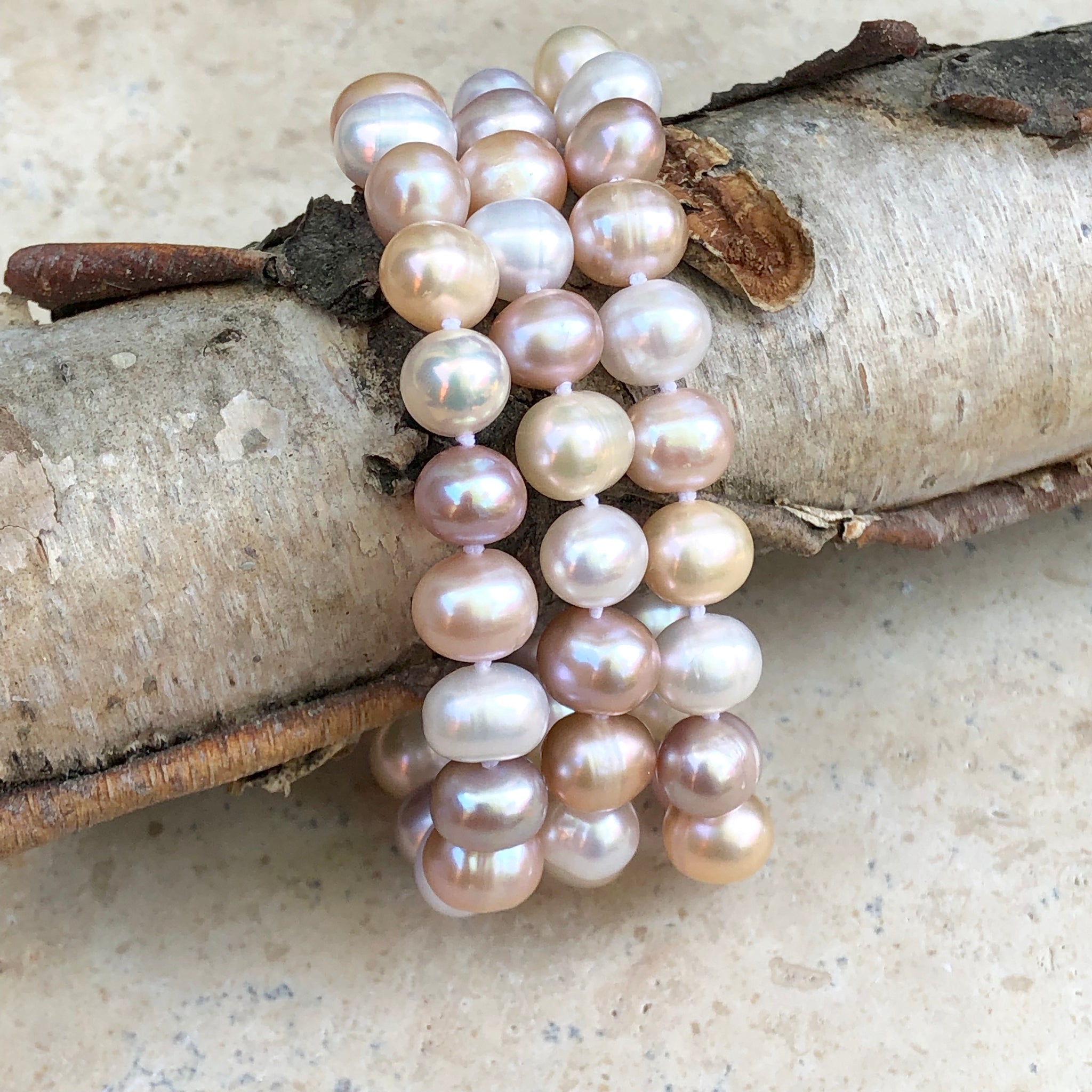 Genuine white, cream + pink freshwater cultured pearl triple-strand stretch bracelet. Bracelet looks like a million bucks + can easily be dressed up or down! Wear this pretty bracelet twisted or clasp it straight!