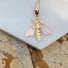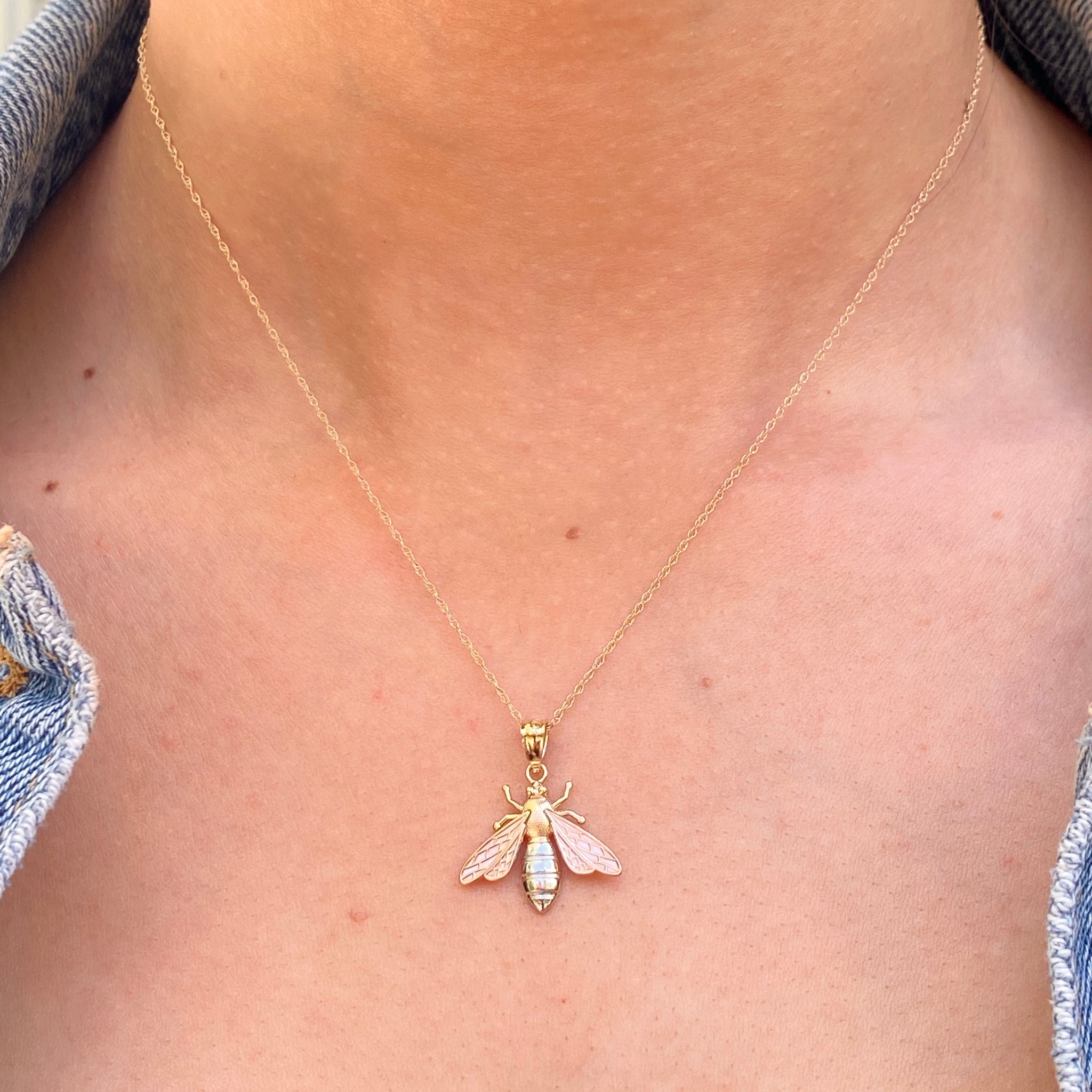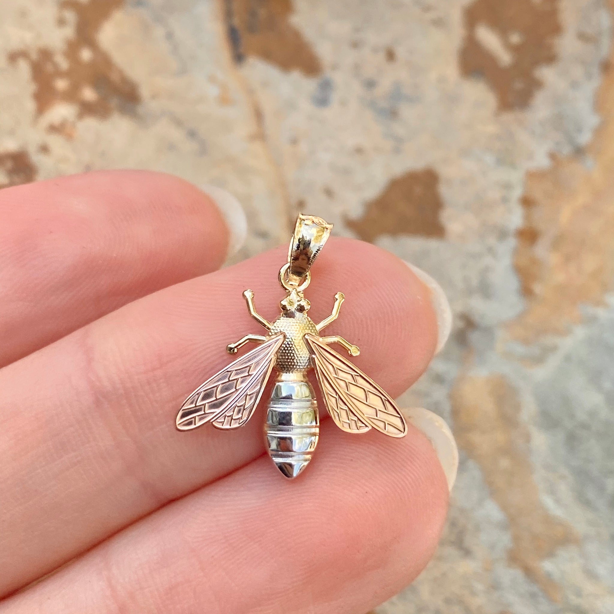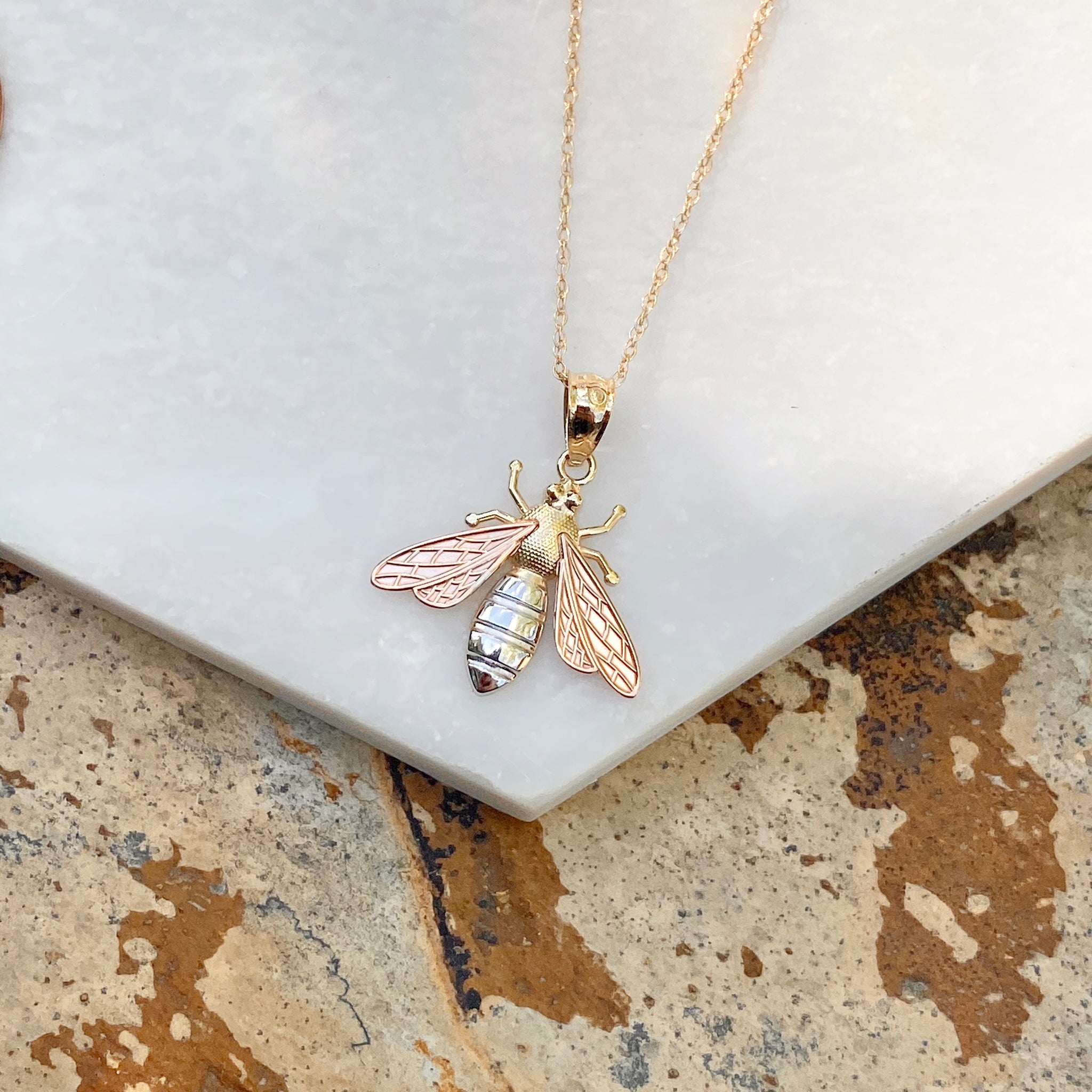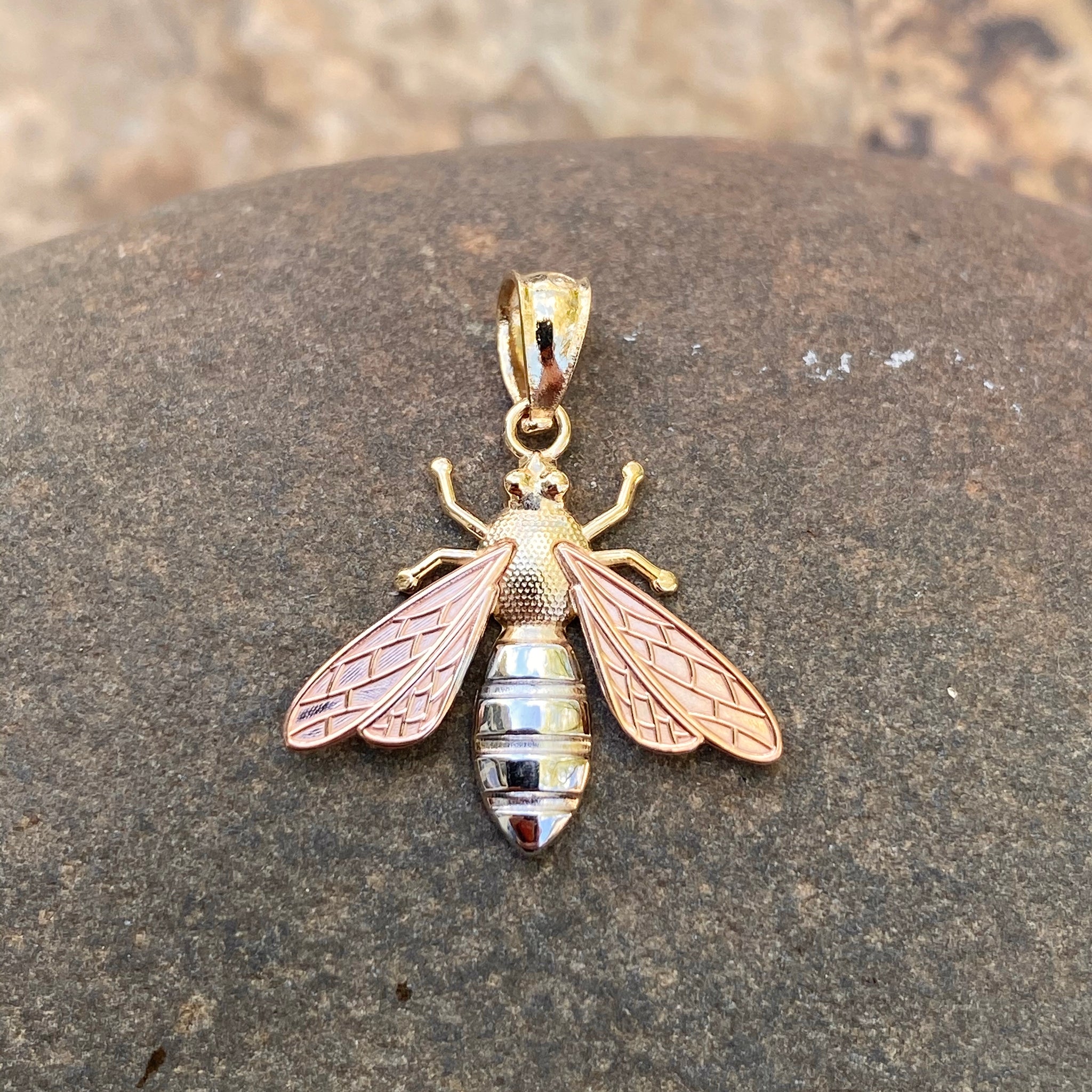Polished, tri-Color 14KT yellow gold, 14KT rose gold, + white rhodium bee pendant charm. Wear with white gold, rose gold and/or yellow gold! Makes the perfect gift and/or accessory for Spring! Chain sold separately.