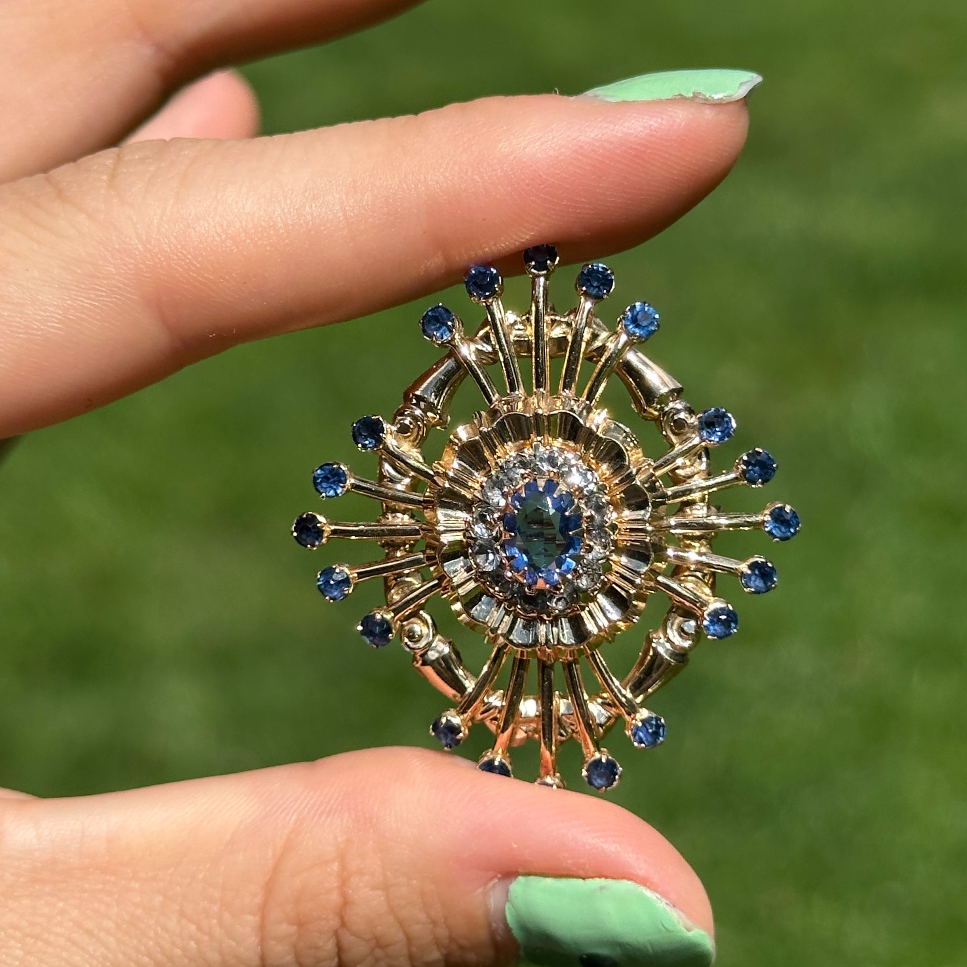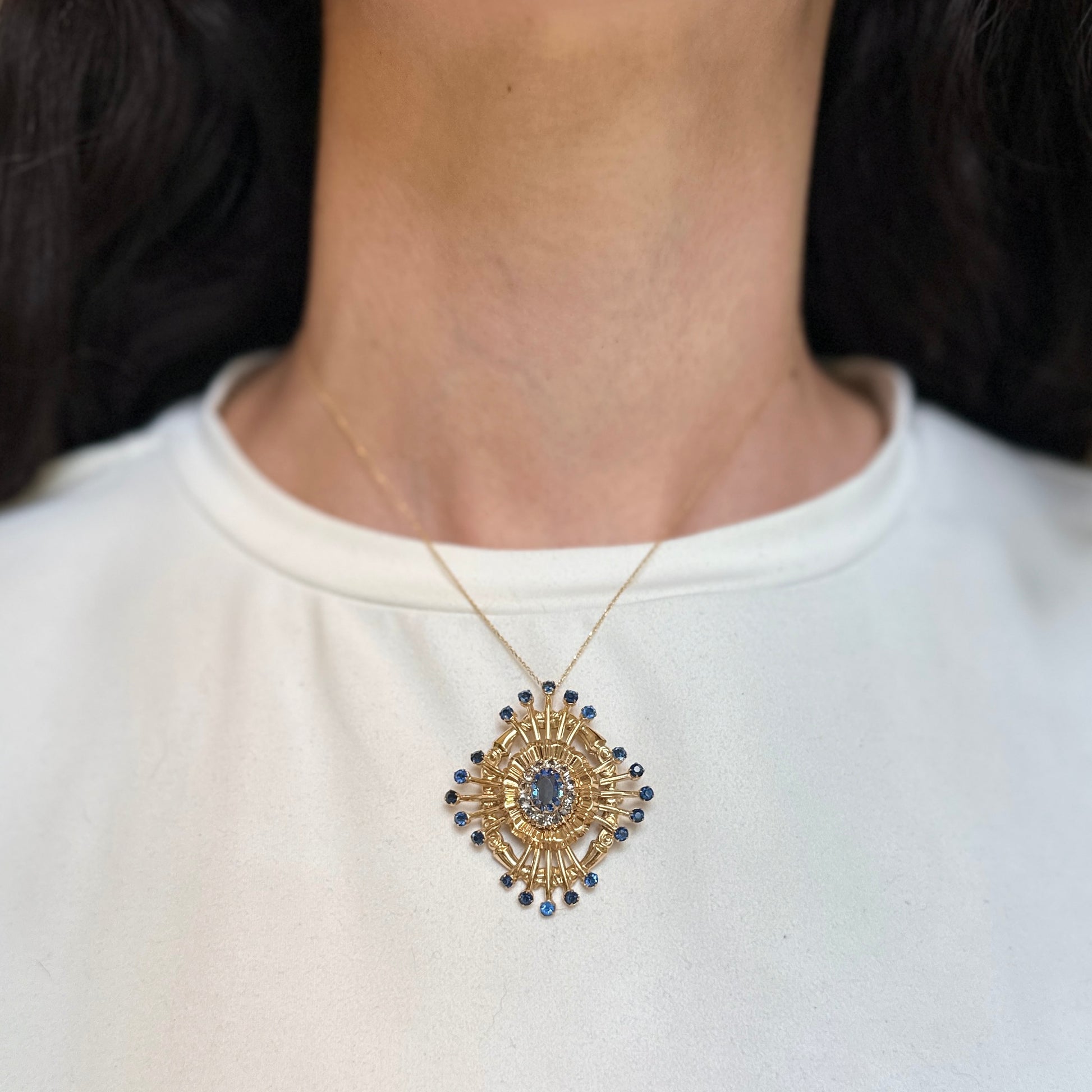 Estate 10KT Yellow Gold Oval and Round Blue Stone Pin + Swivel Bail for Pendant