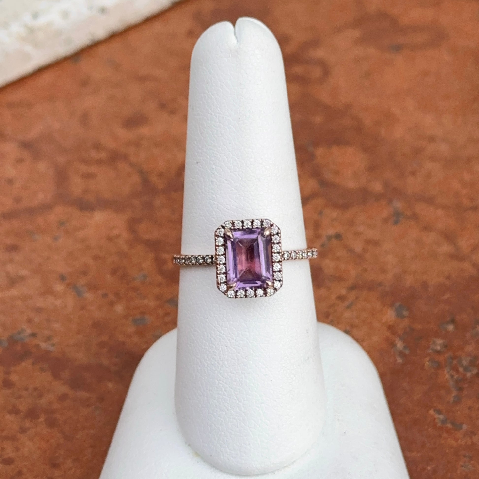 Estate 10KT Rose Gold Emerald Cut Amethyst + Round Diamond Halo Ring