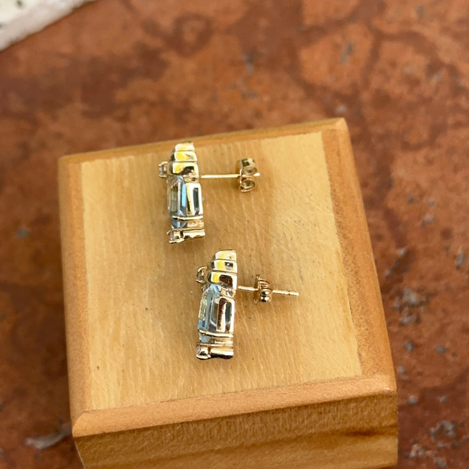 Estate 14KT Yellow Gold Blue Aquamarine + Diamond Earrings