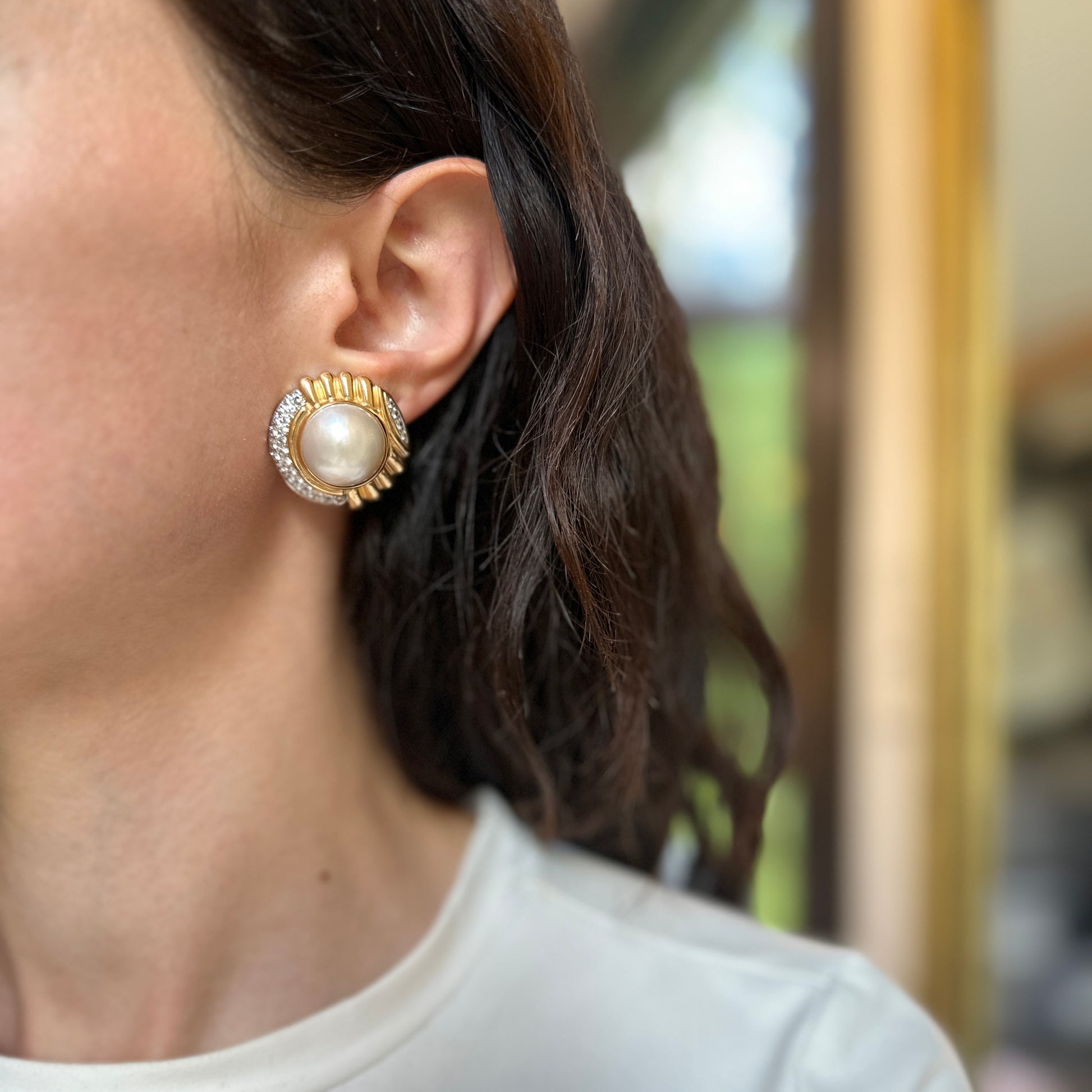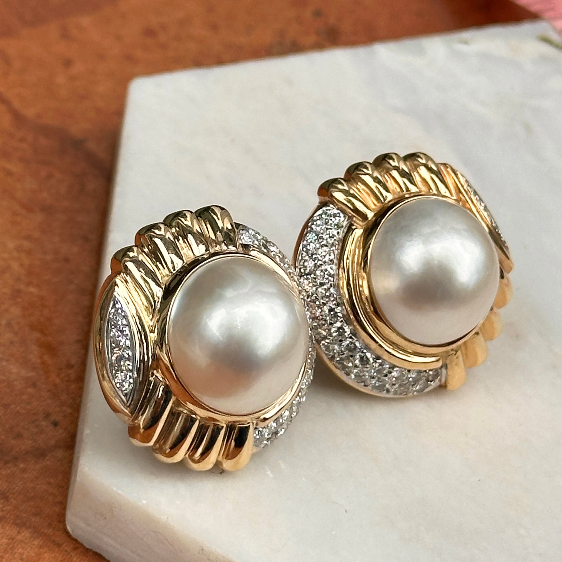 Estate 14KT Yellow Round Mabe Pearl + Pave Diamond Earrings