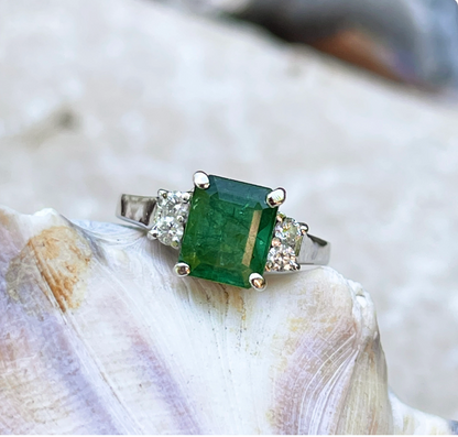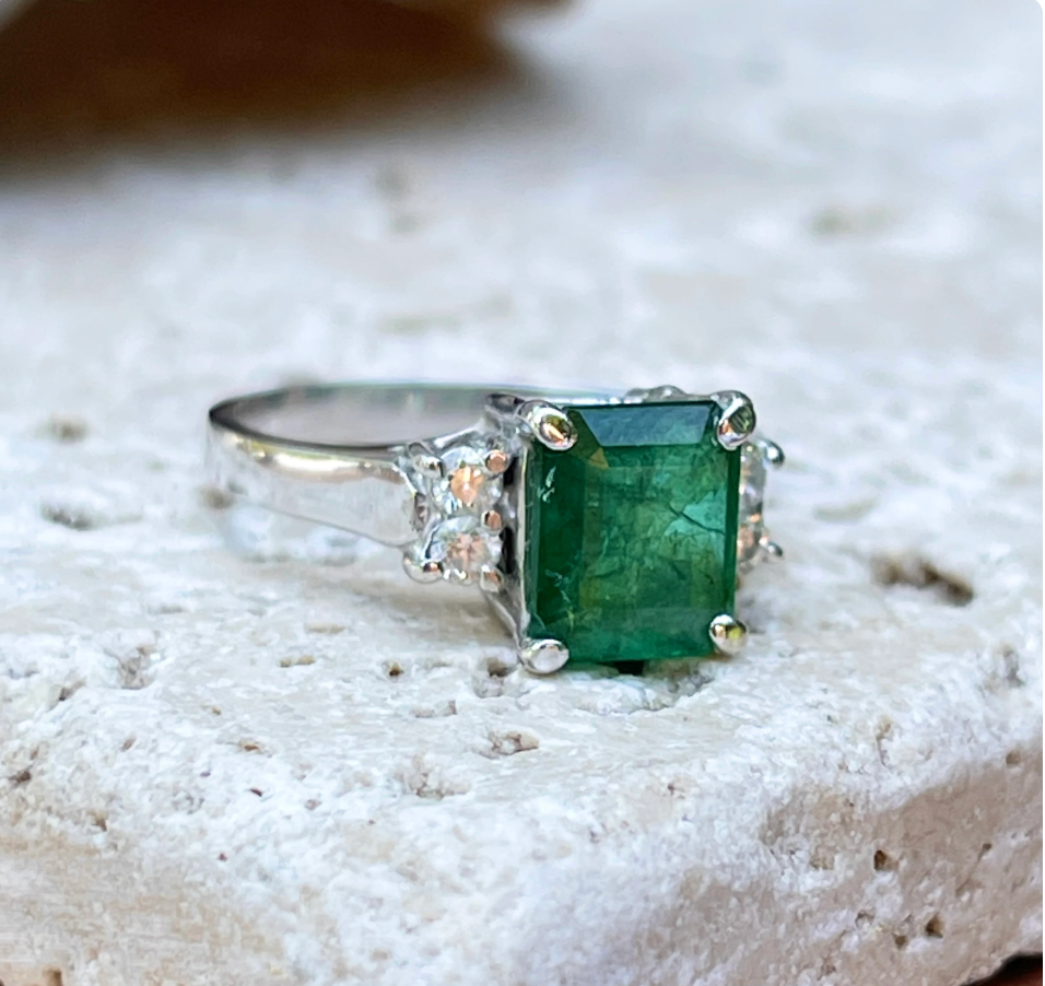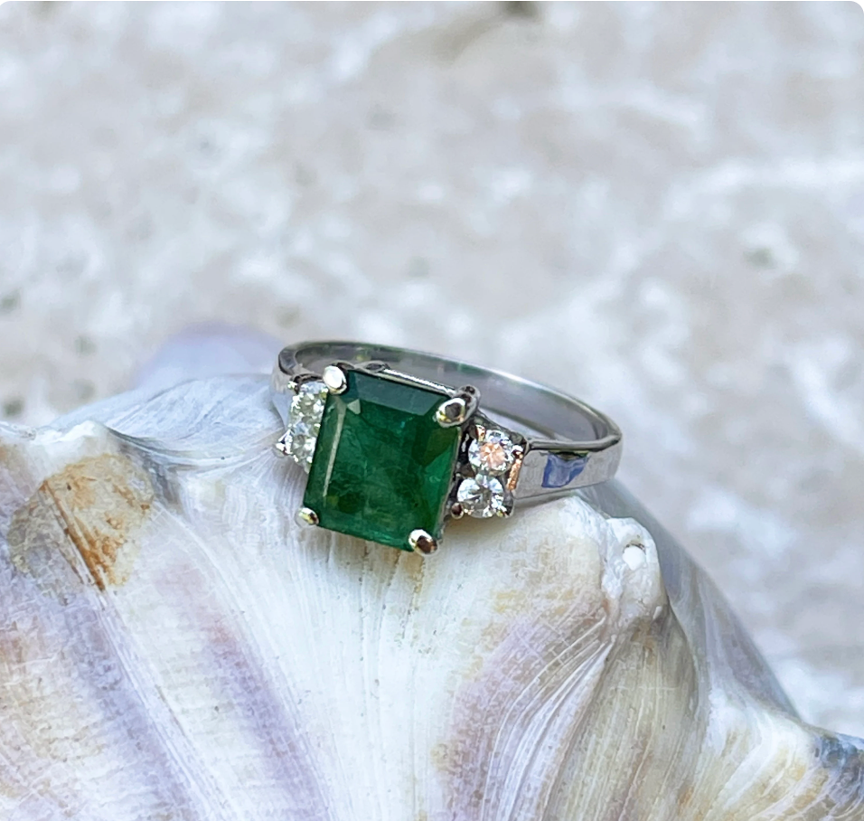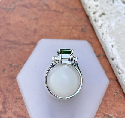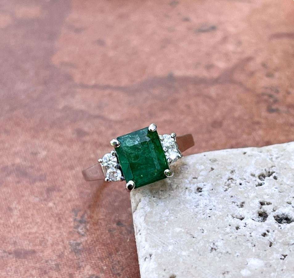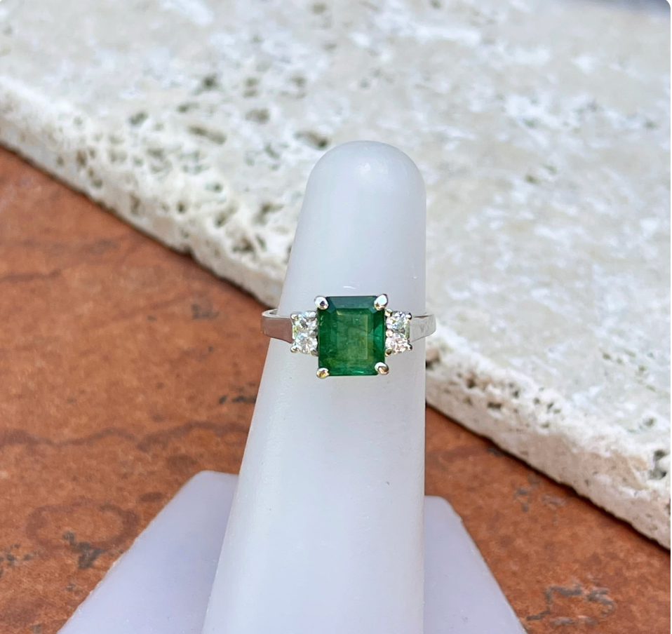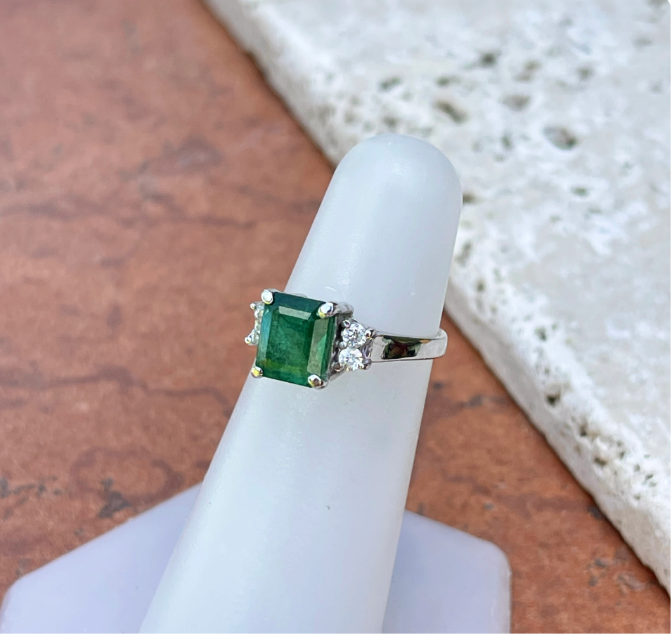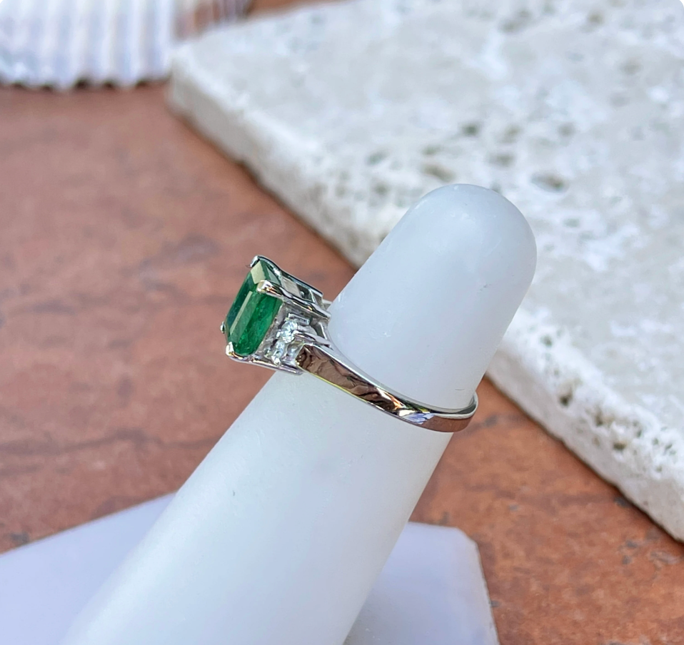 Estate 14KT White Gold Large Emerald-Cut Emerald + Diamond Accent Ring