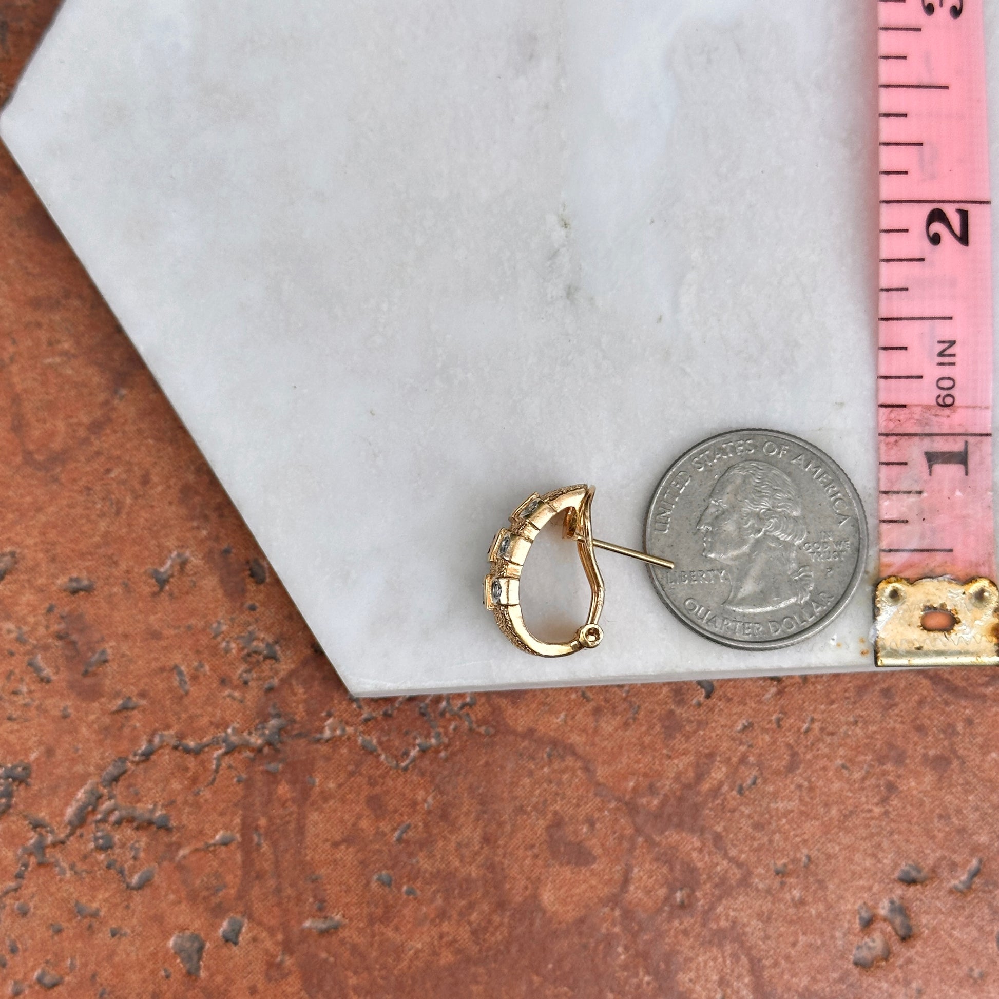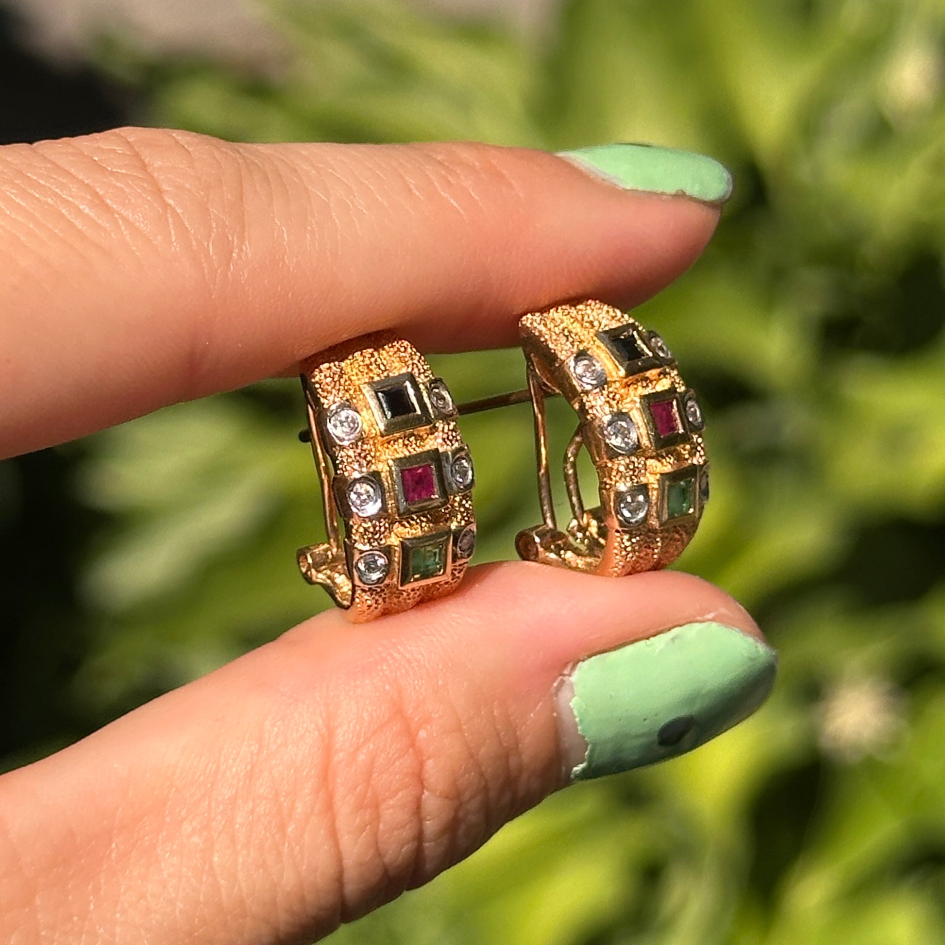Estate/ Vintage 14KT Yellow Gold Diamond + Emerald, Sapphire, Ruby Half Hoop Omega Back Earrings Bezel Set Matte Florentine Finish