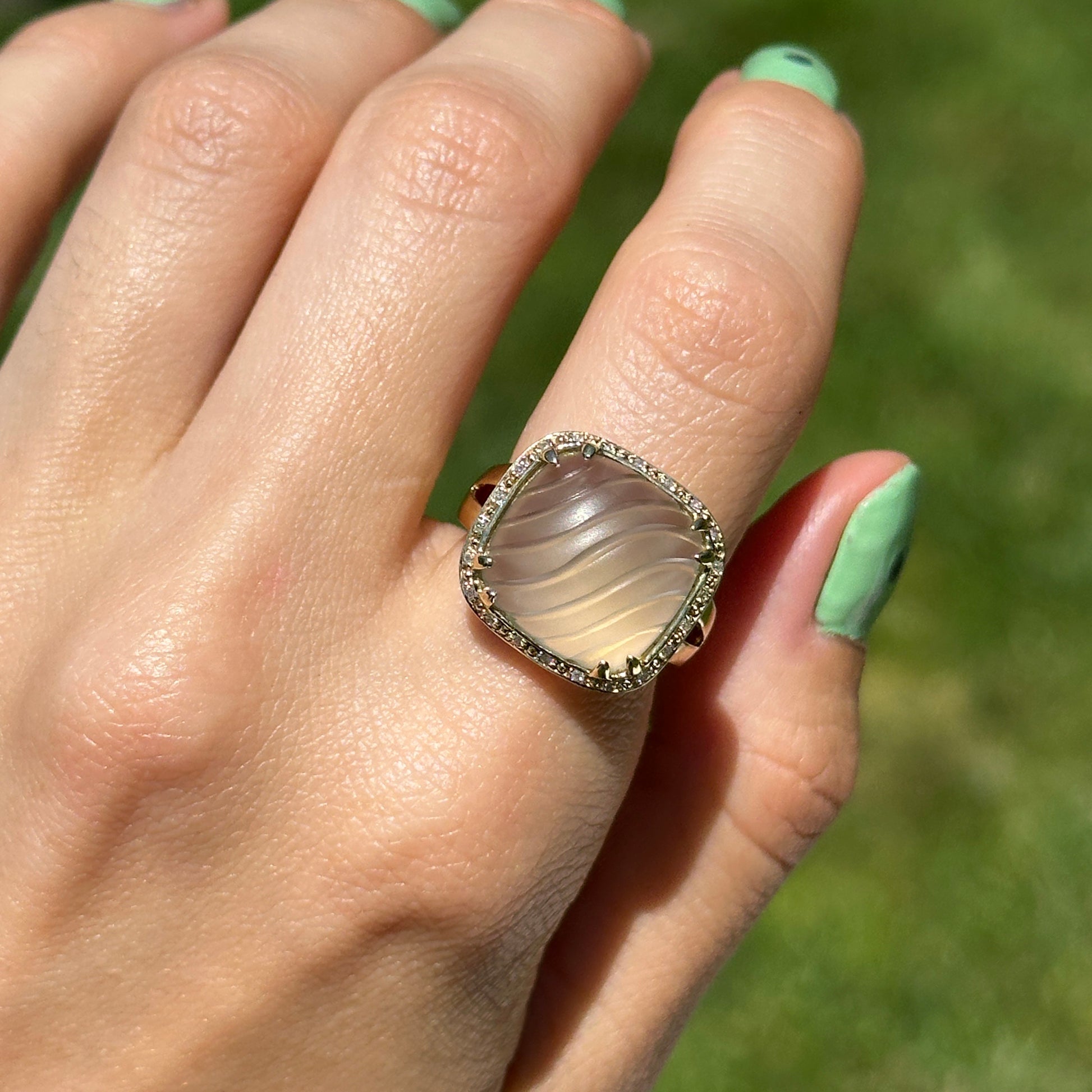 Estate 14KT Yellow Gold Faceted Cushion Cut Frosted Carved Gemstone Green Amethyst and Diamond Ring Halo