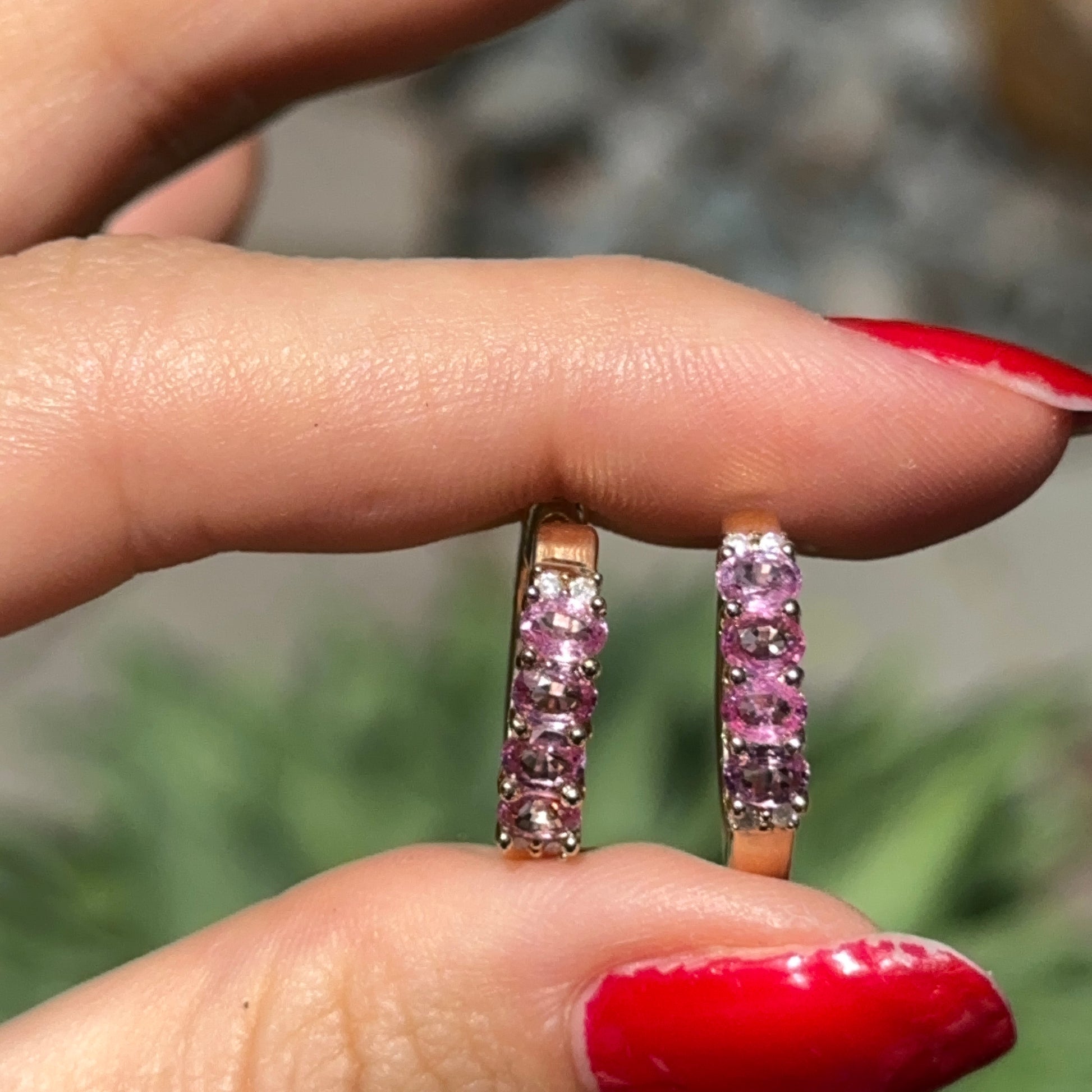 Estate Vintage 14KT Yellow Gold and Pink Sapphires and Diamonds Prong-Set Style Huggie Hoop Earrings