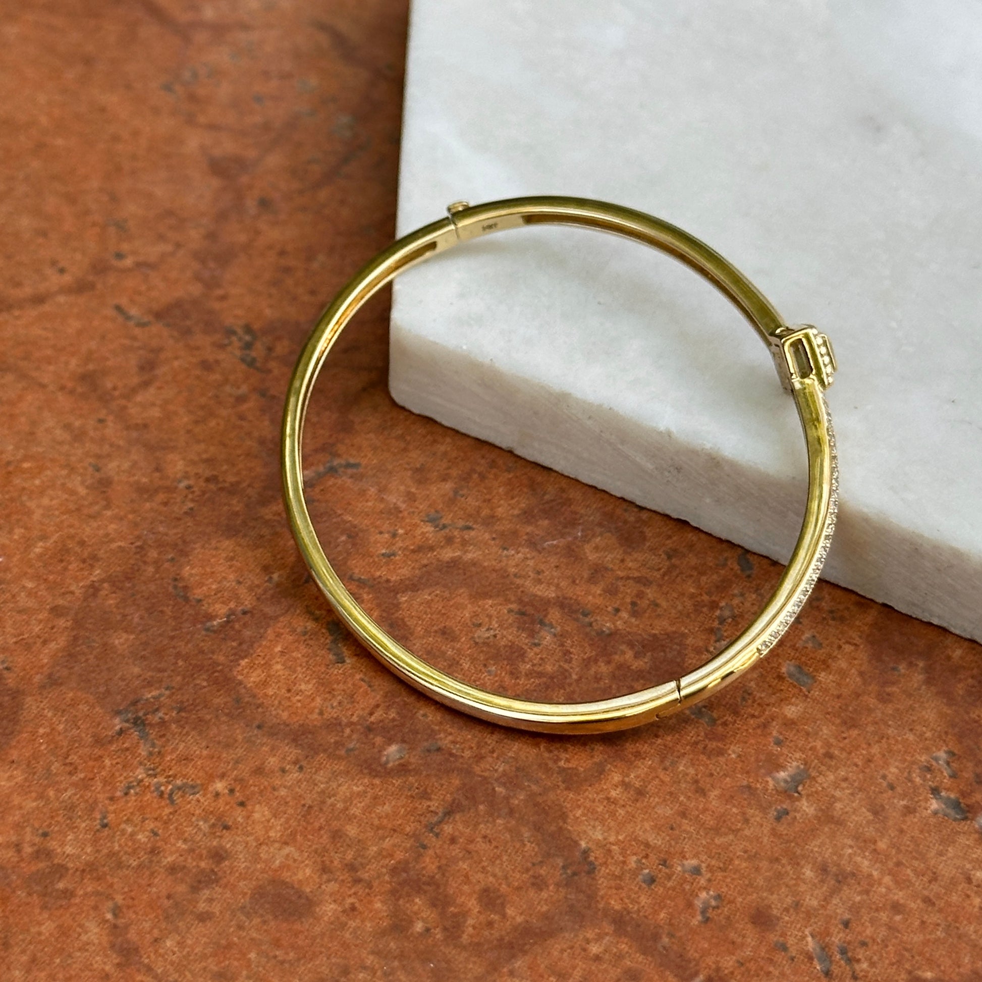 Vintage 14KT Yellow Gold Square Invisible Set Emerald + Diamond Bangle Bracelet