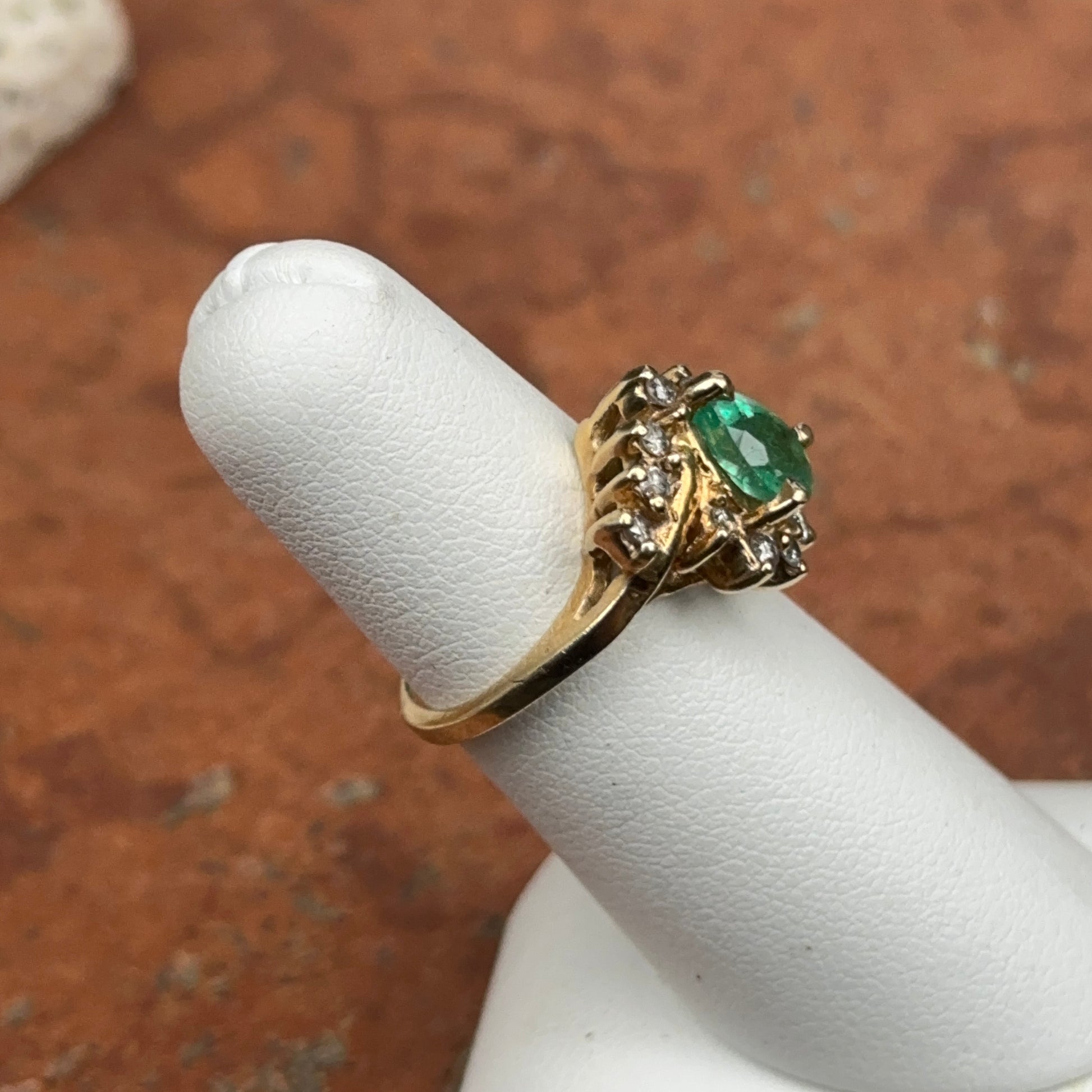 Estate 14KT Yellow Gold Teardrop Colombian Emerald + Diamond Halo Bypass Ring