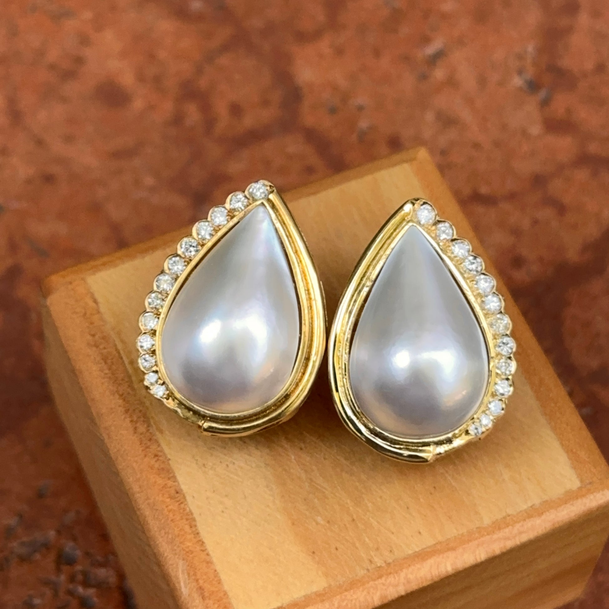 Estate 18KT Yellow Gold Teardrop Mabe Pearl and Bezel Set Diamond Earrings with Omega Clips
