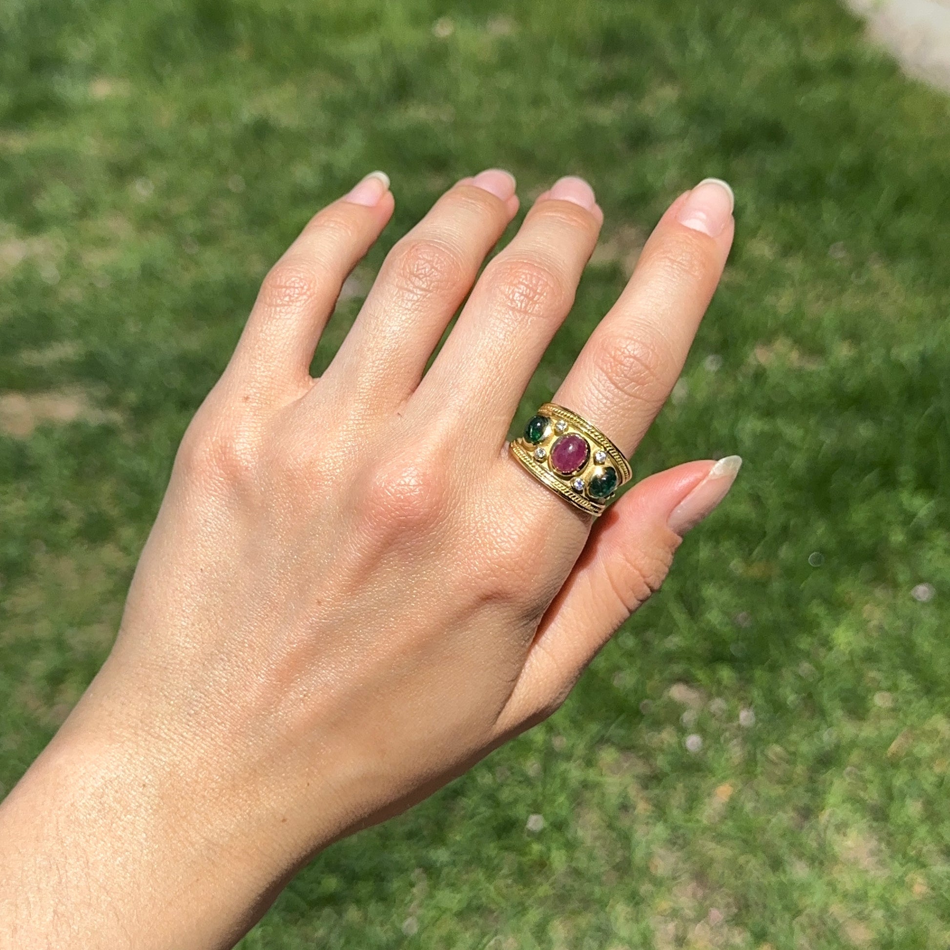 Vintage 18KT Yellow Gold Byzantine/ Etruscan Design Polished + Textured Matte Finish Artistic, Wide Cigar Band Ring with Genuine Emerald and Ruby and Diamond Gemstones