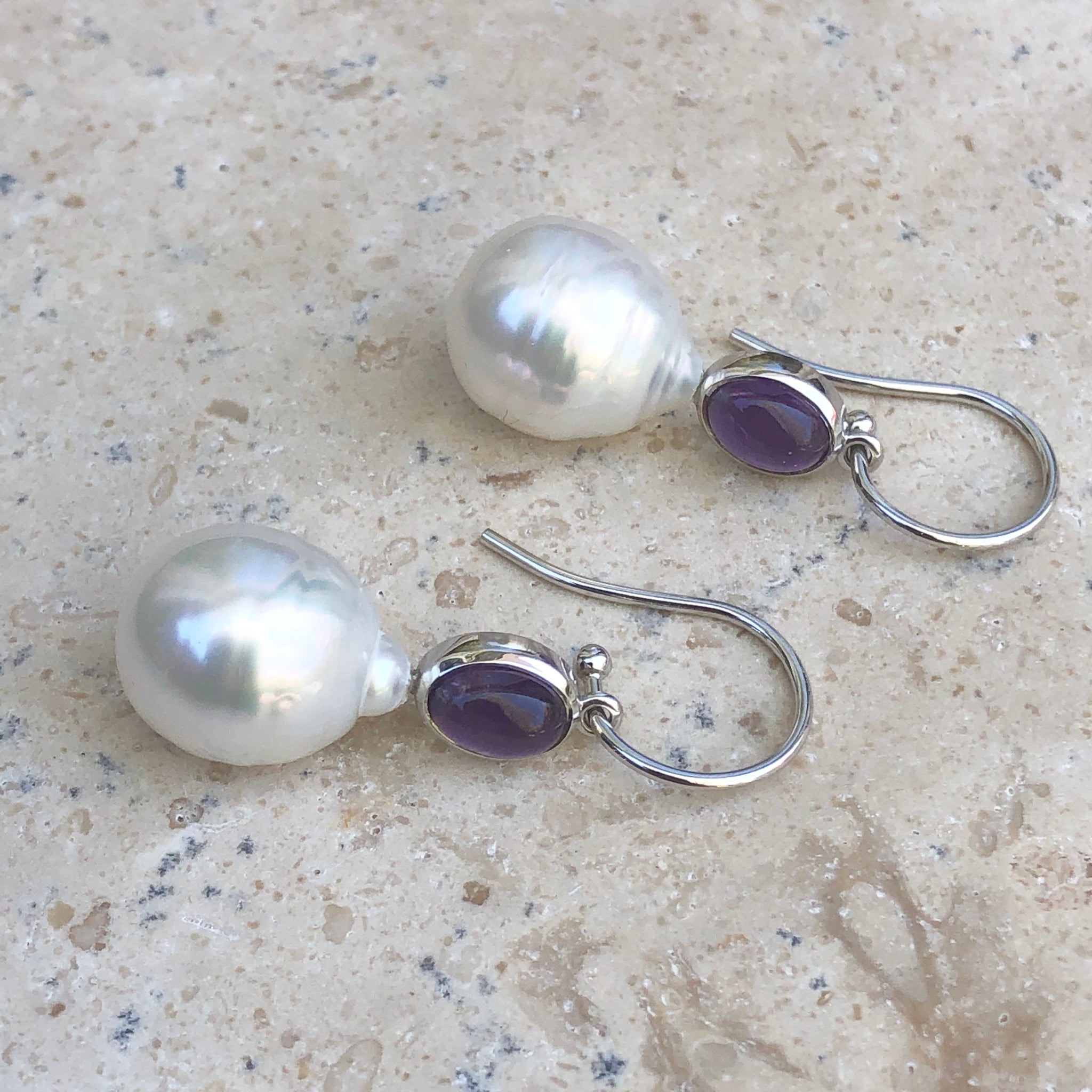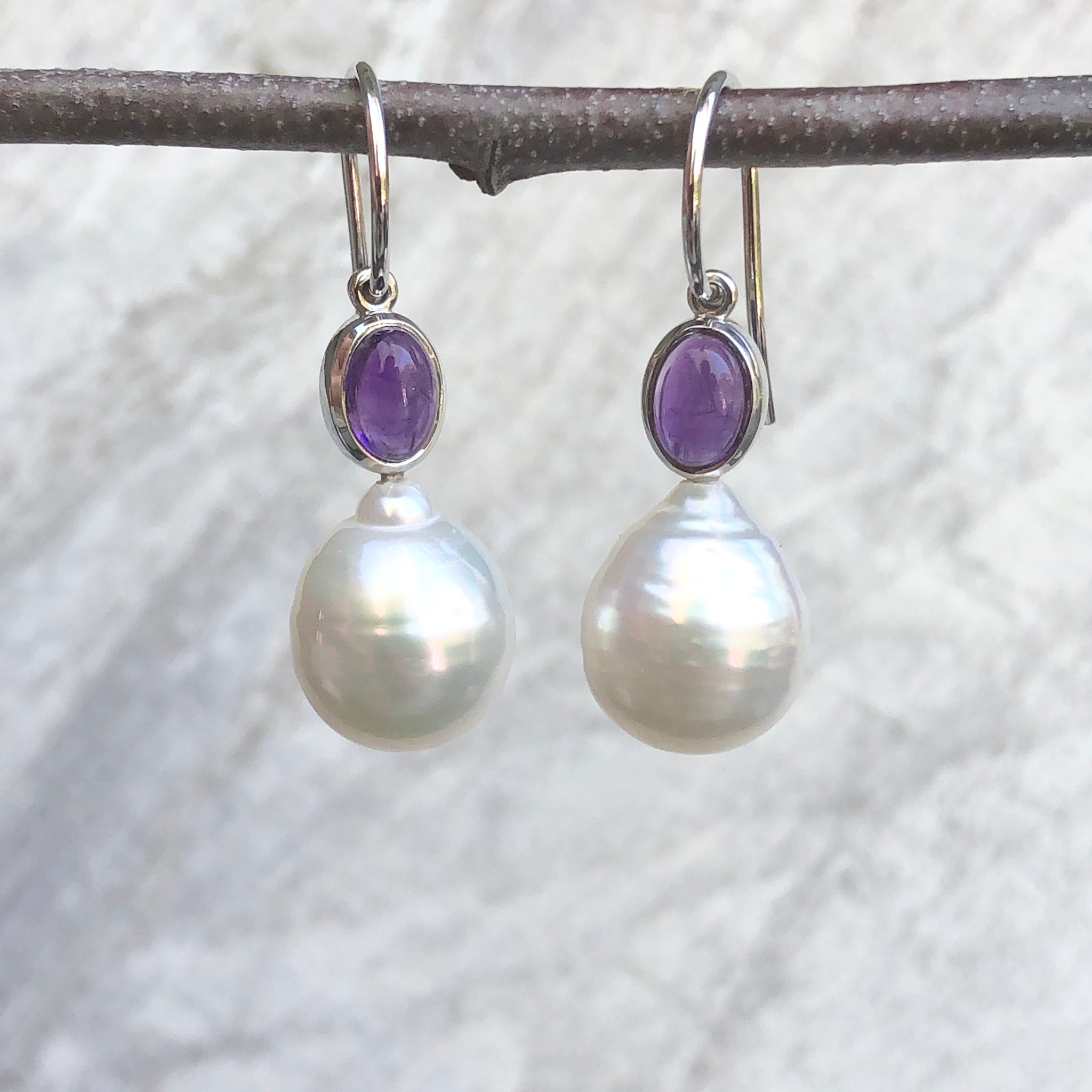 14KT white gold genuine amethyst + genuine, cultured Paspaley South Sea Pearl earrings. Each earring is set with (1) 7mm x 5mm genuine bezel-set, cabochon amethyst + (1) 11mm "Fashion" quality, cultured Paspaley South Sea Pearl.