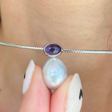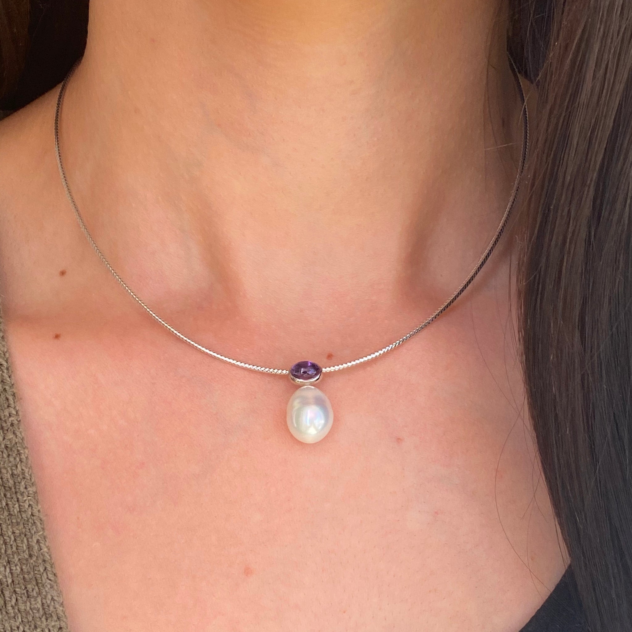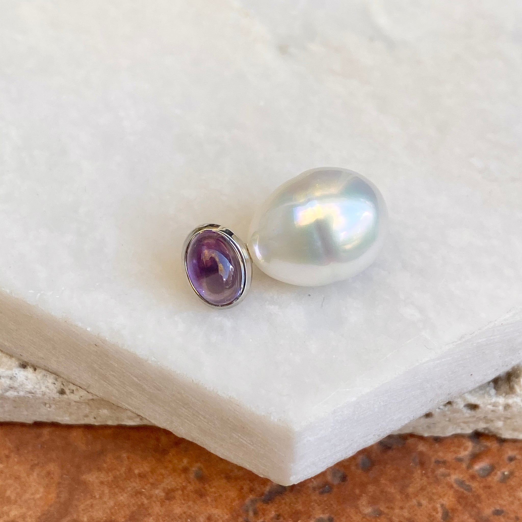 14KT white gold cabochon amethyst + Paspaley South Sea Pearl pendant slide. Bezel Set with (1) 7mm x 5mm oval, genuine amethyst + (1) "Fashion" quality, cultured Paspaley South Sea Pearl.