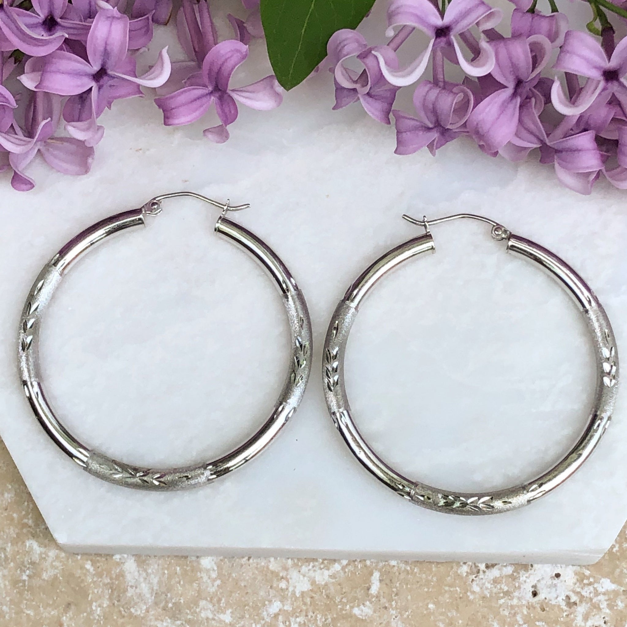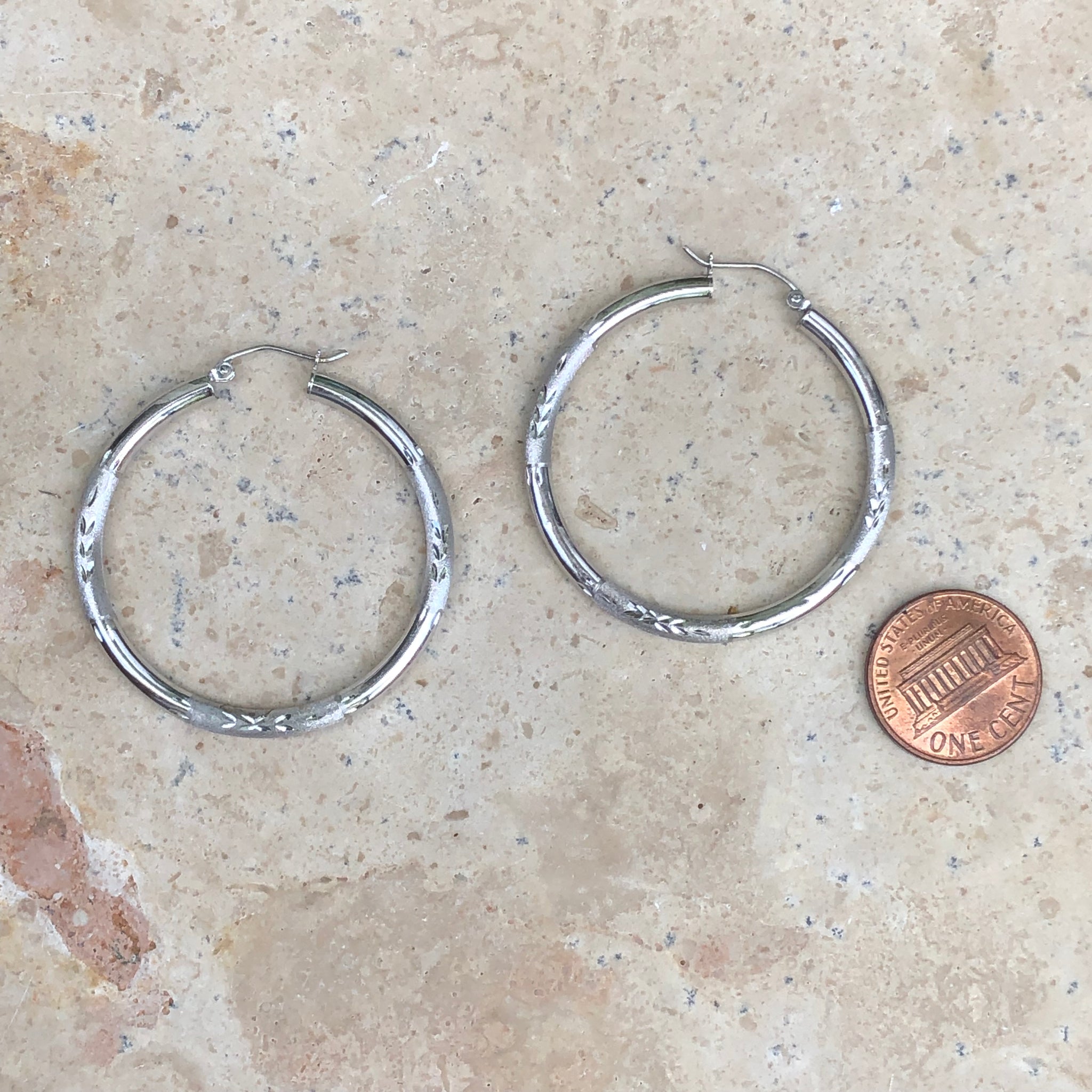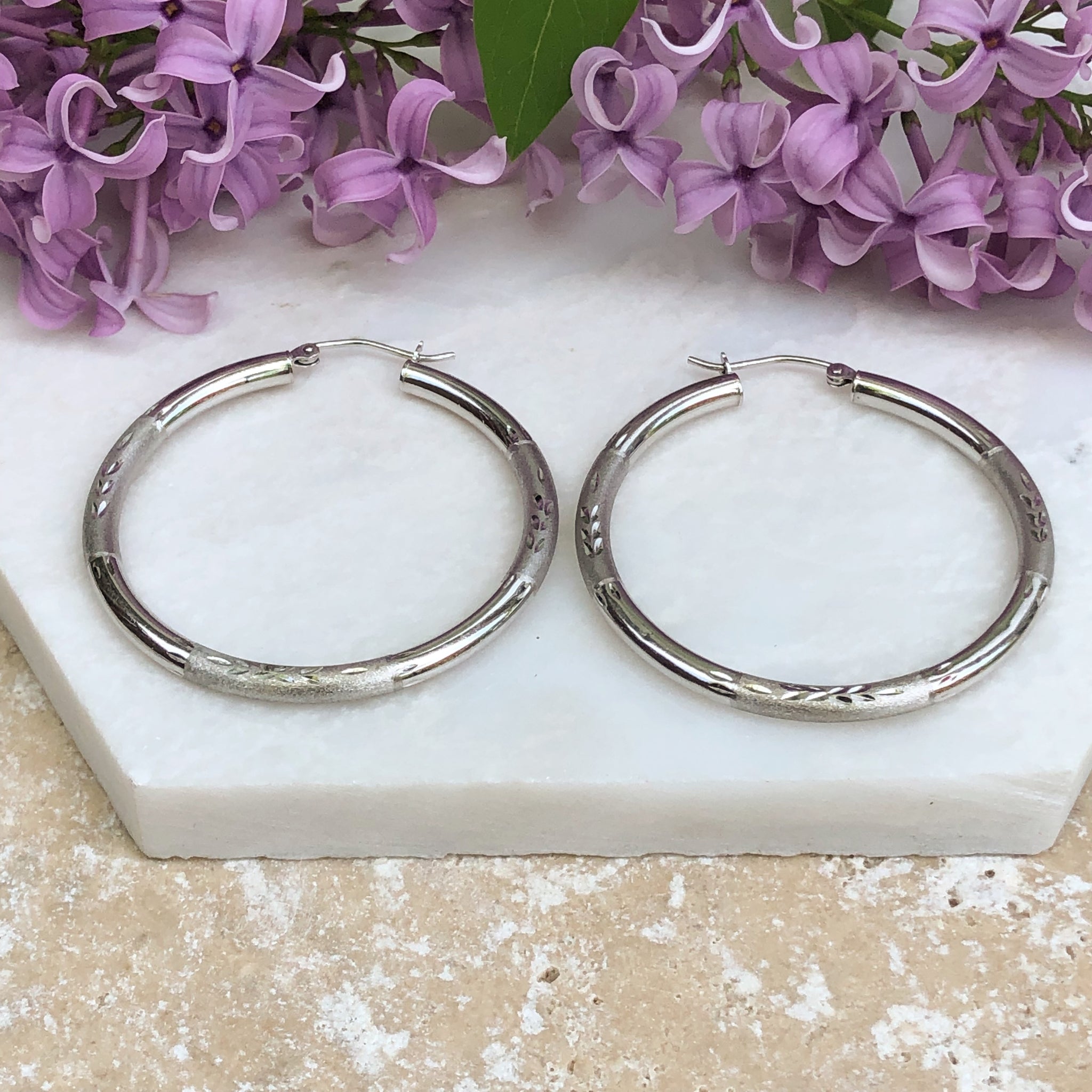 10KT White Gold Diamond-Cut + Satin Hoop Earrings 40mm
