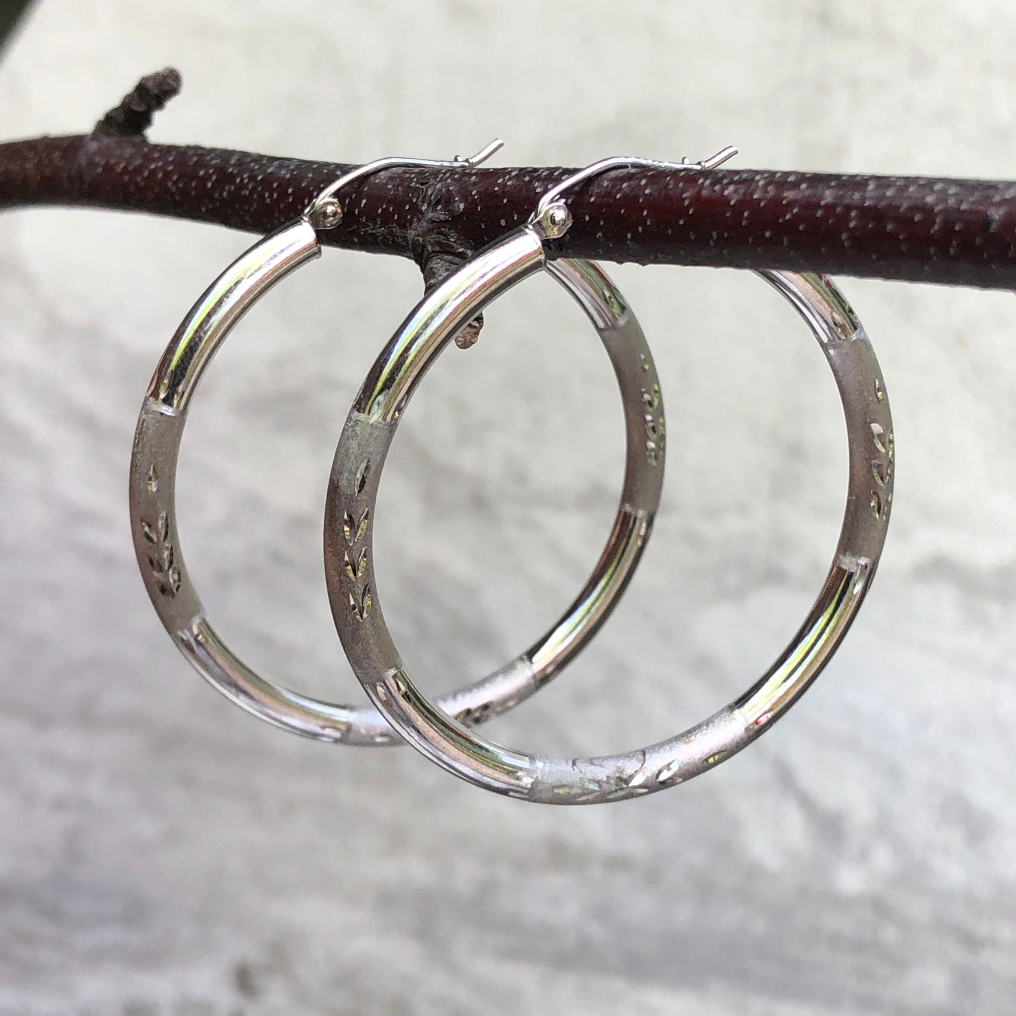 Polished + satin finished 10KT white gold diamond-cut hoop earrings. Great size hoop earrings with a little flair on the finishes.