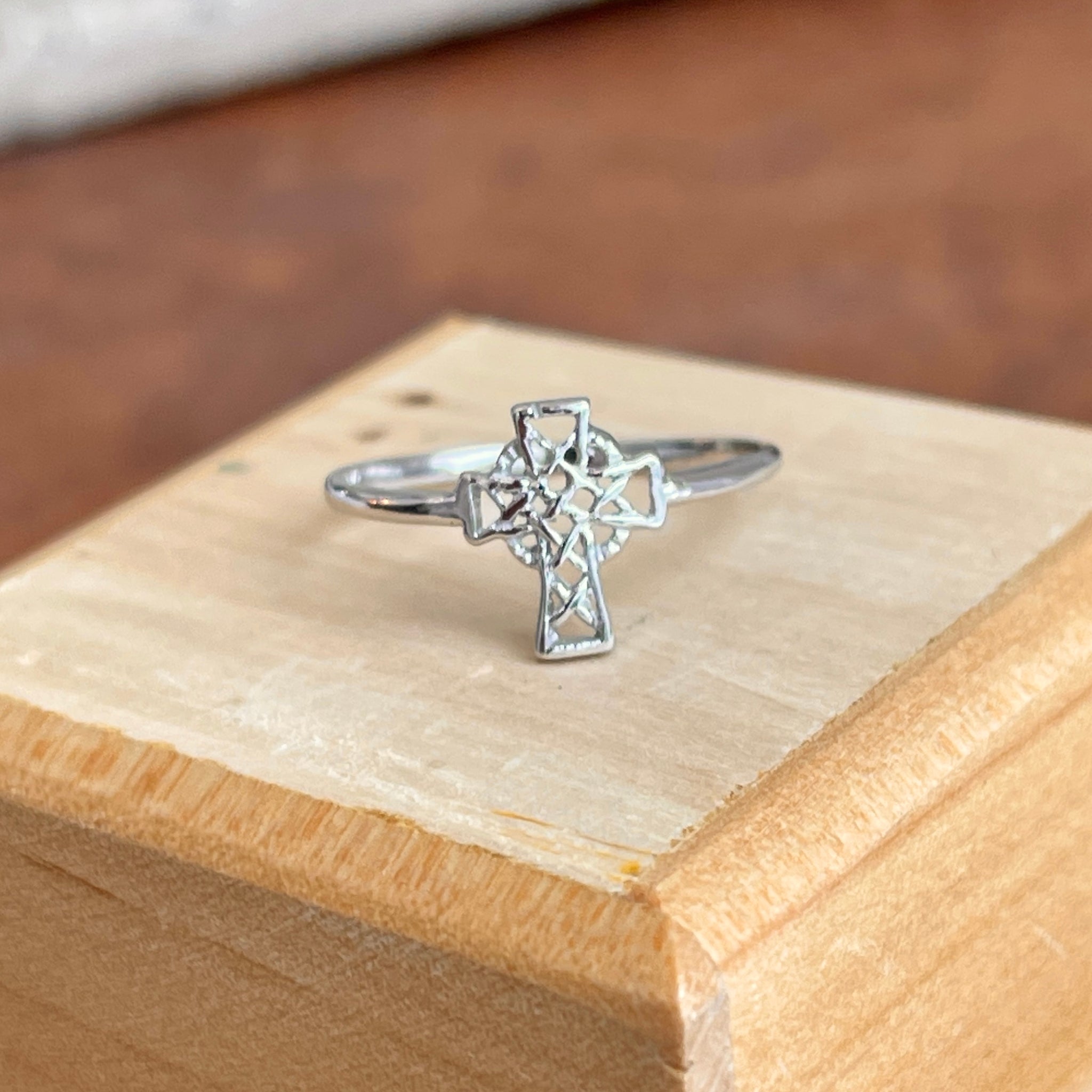 14KT white gold Irish/Scottish Celtic cross ring in open weave.