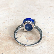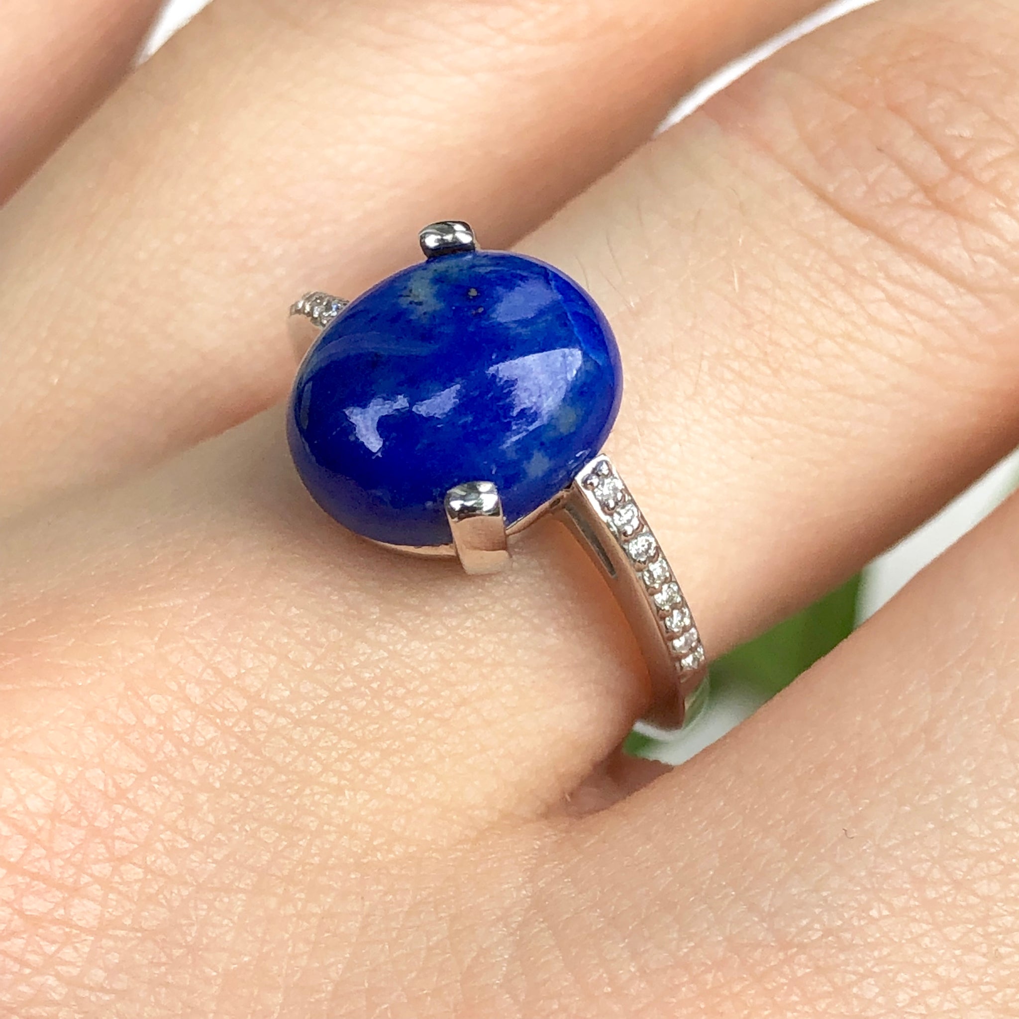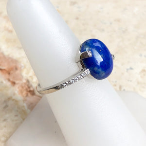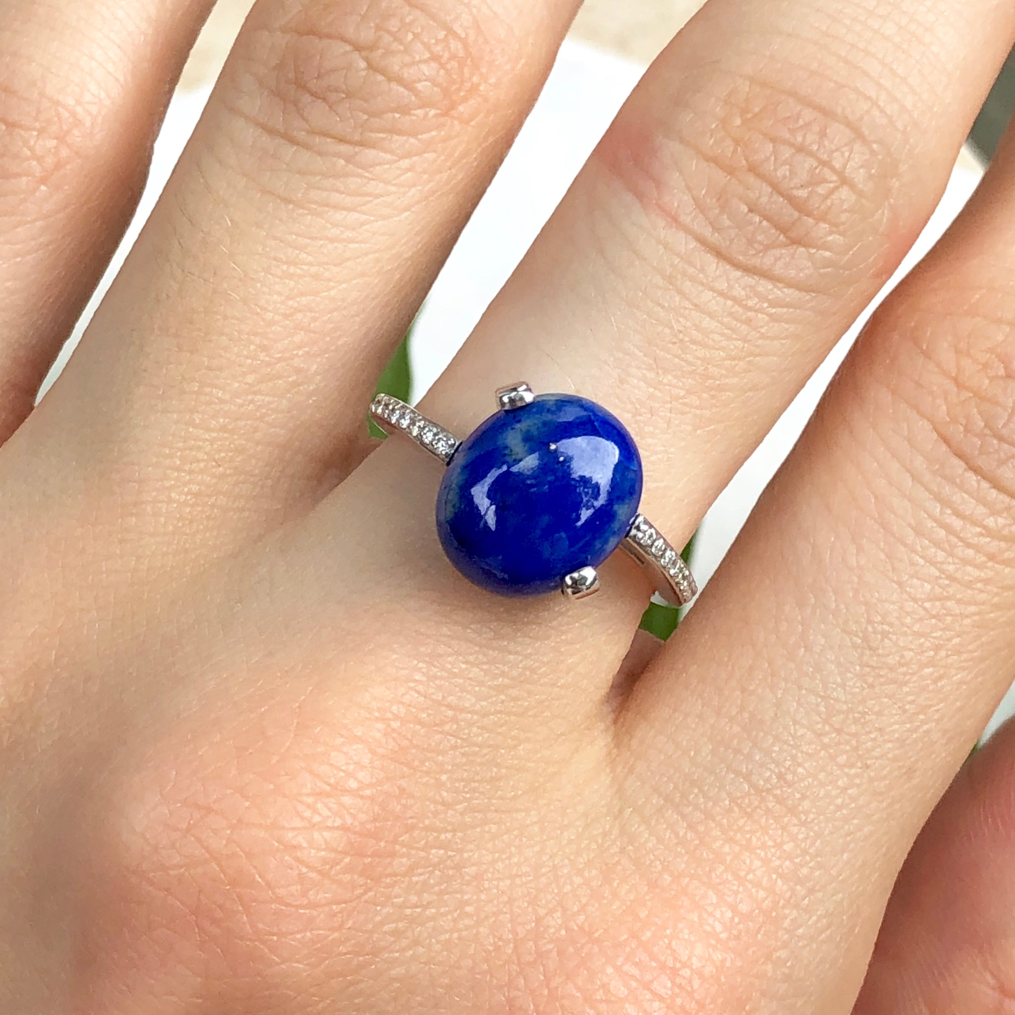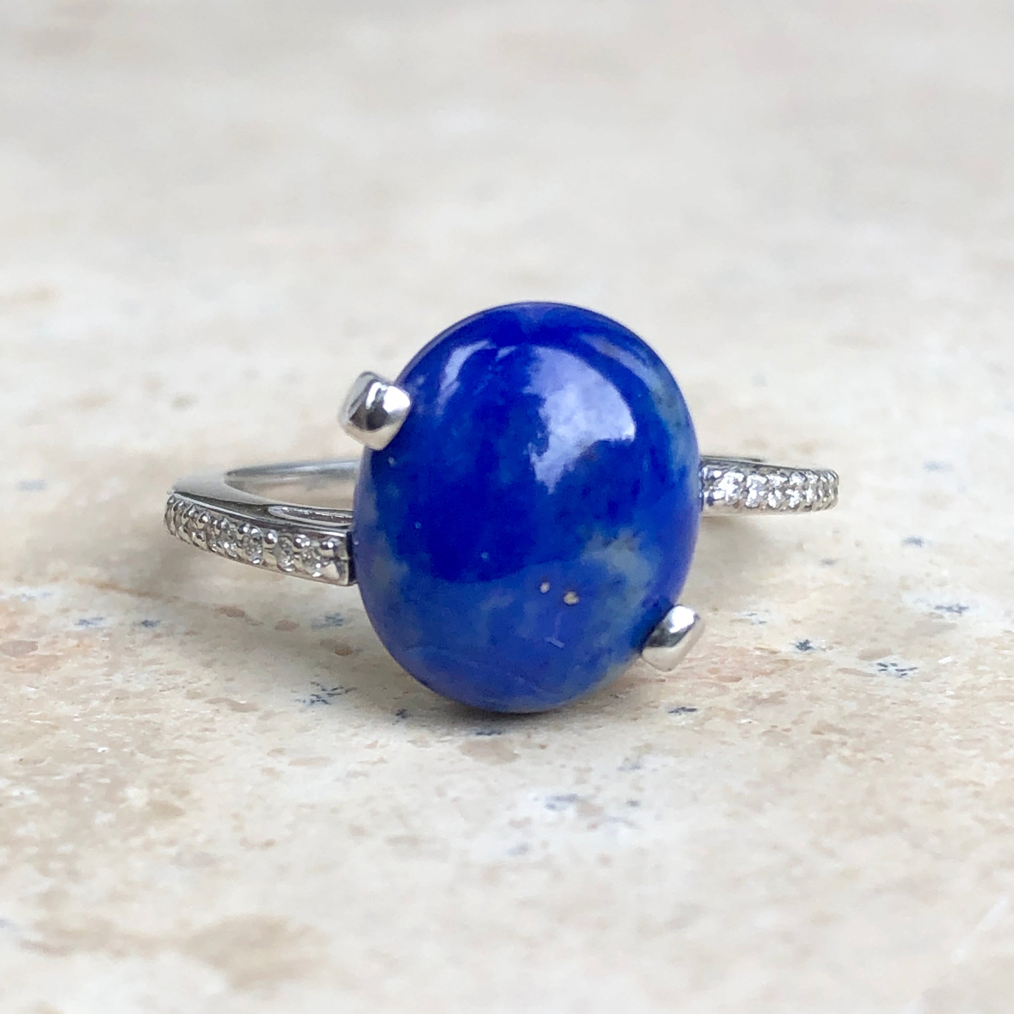 14KT white gold + genuine, cabochon, oval lapis lazuli diamond ring. Lovely royal blue color gemstone with flecks of gold.