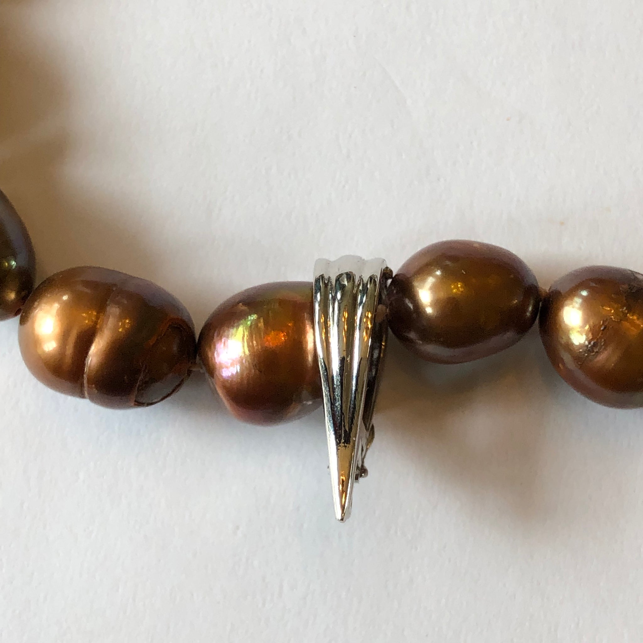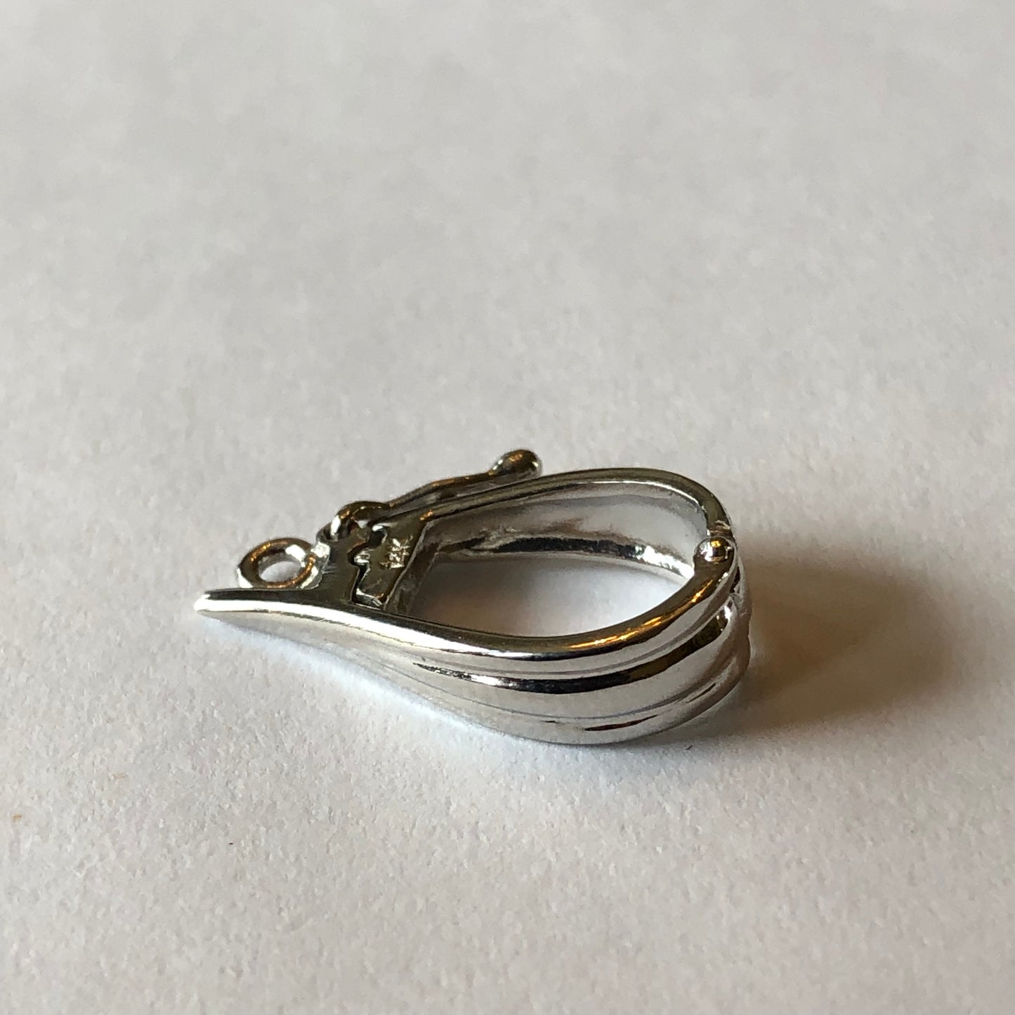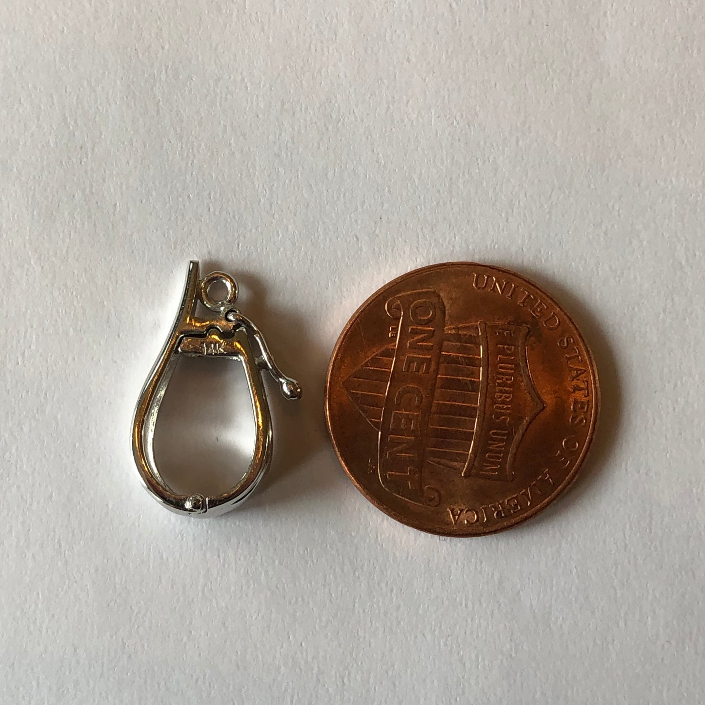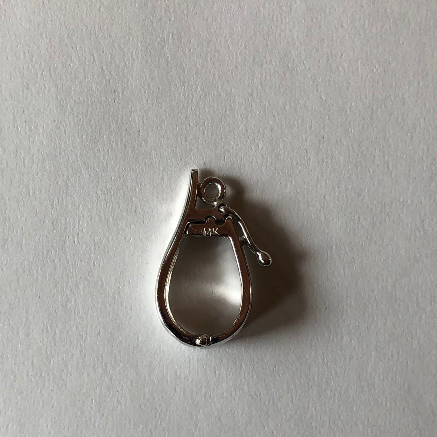 14KT white gold pendant hanger enhancer. This requires a jump/split-ring (one comes with) that is put onto the small hoop + then attached to a pendant. Additional jump rings in various sizes can be purchased separately. This has a locking safety clasp, with a ribbed detailing design. It can snap onto other various widths of necklaces, pearls, beaded style, leather, rubber and any other thick style necklaces without having to fit over large bails.
