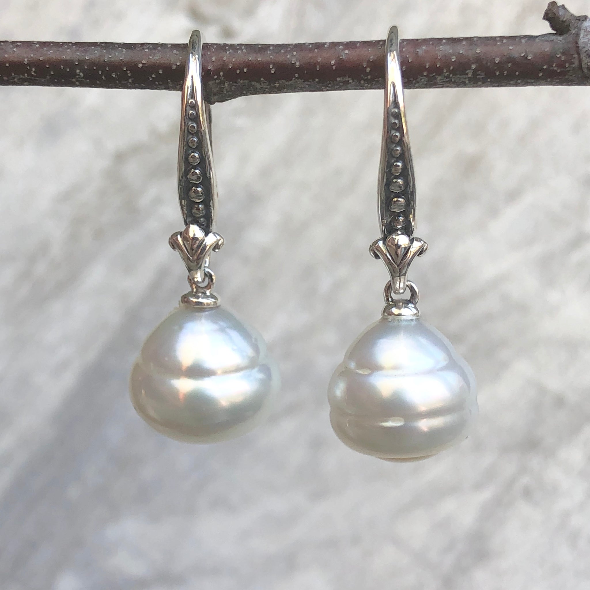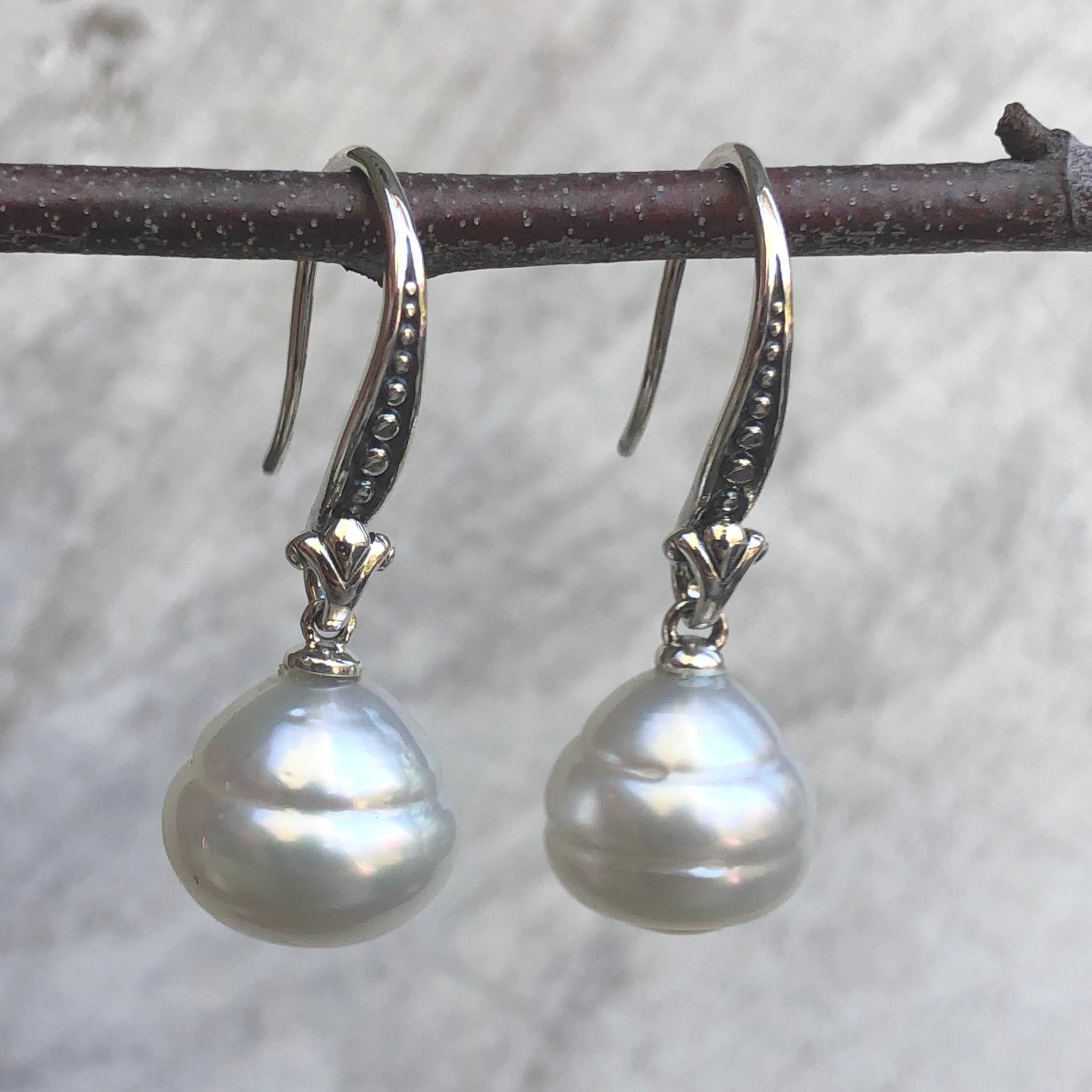 14KT white gold + sterling silver genuine Paspaley Cultured South Sea Pearl dangle/drop euro-wire earrings.