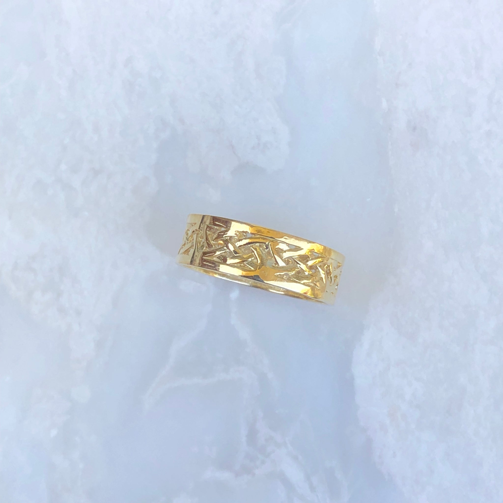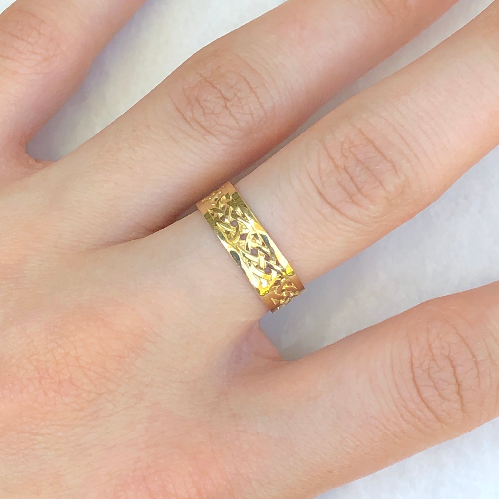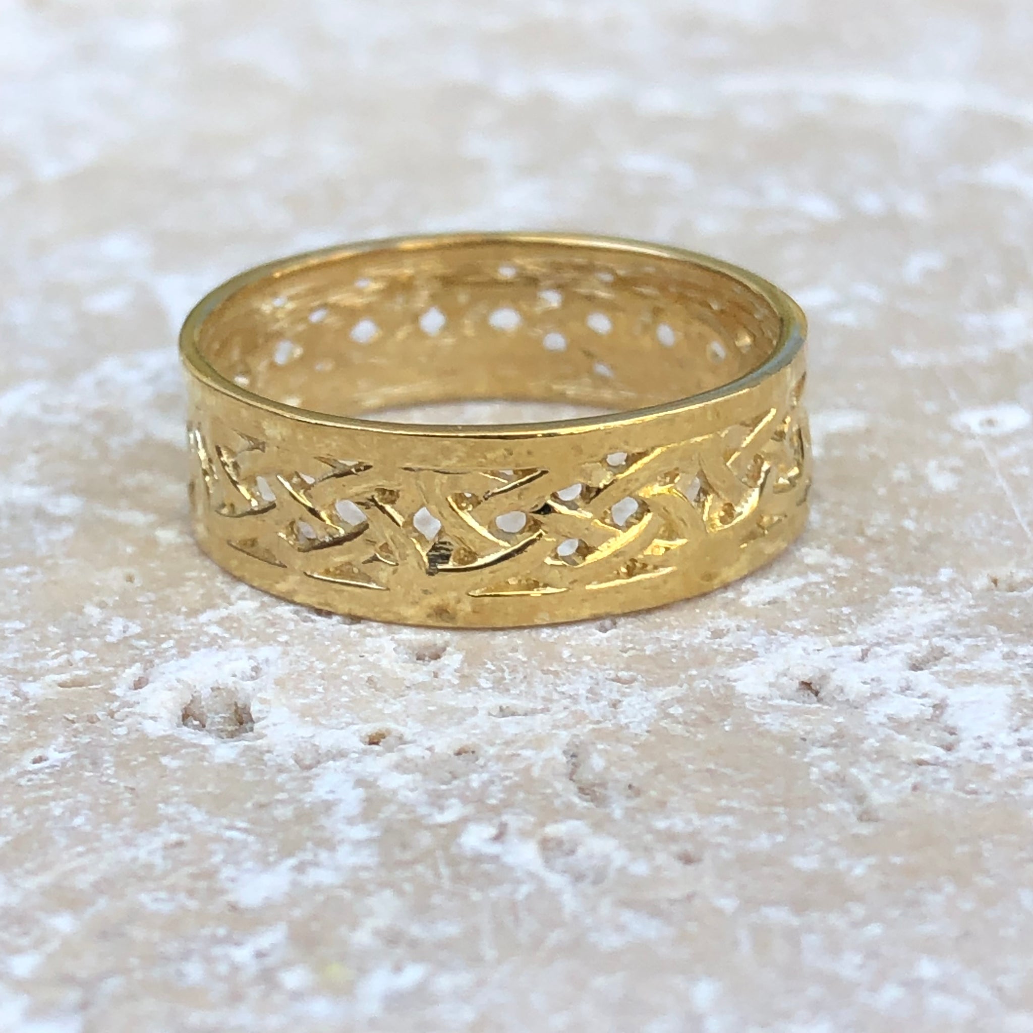 14KT yellow gold Irish/Scottish Celtic open-weave ring. Features great interlocking design that goes completely around the ring.
