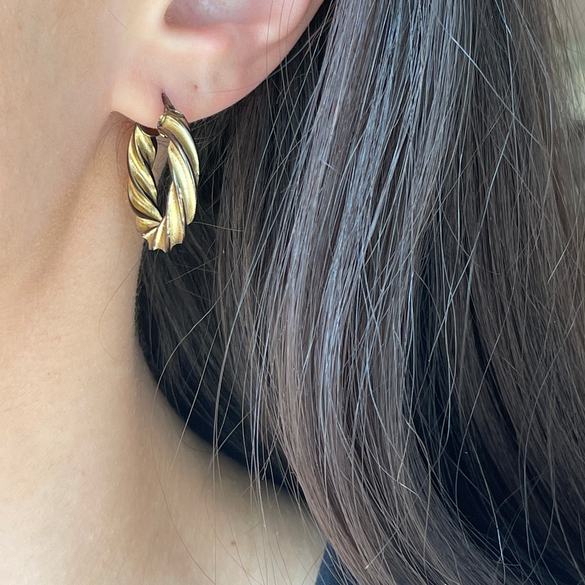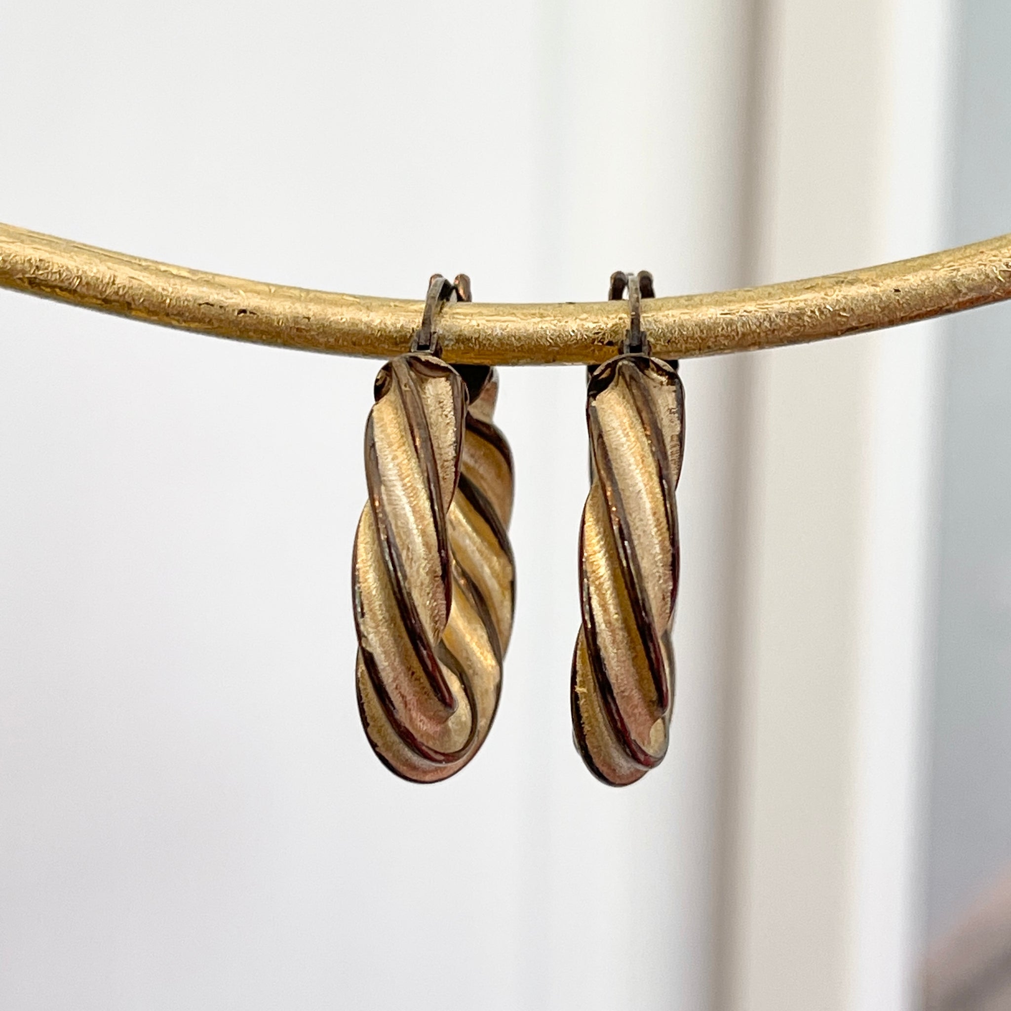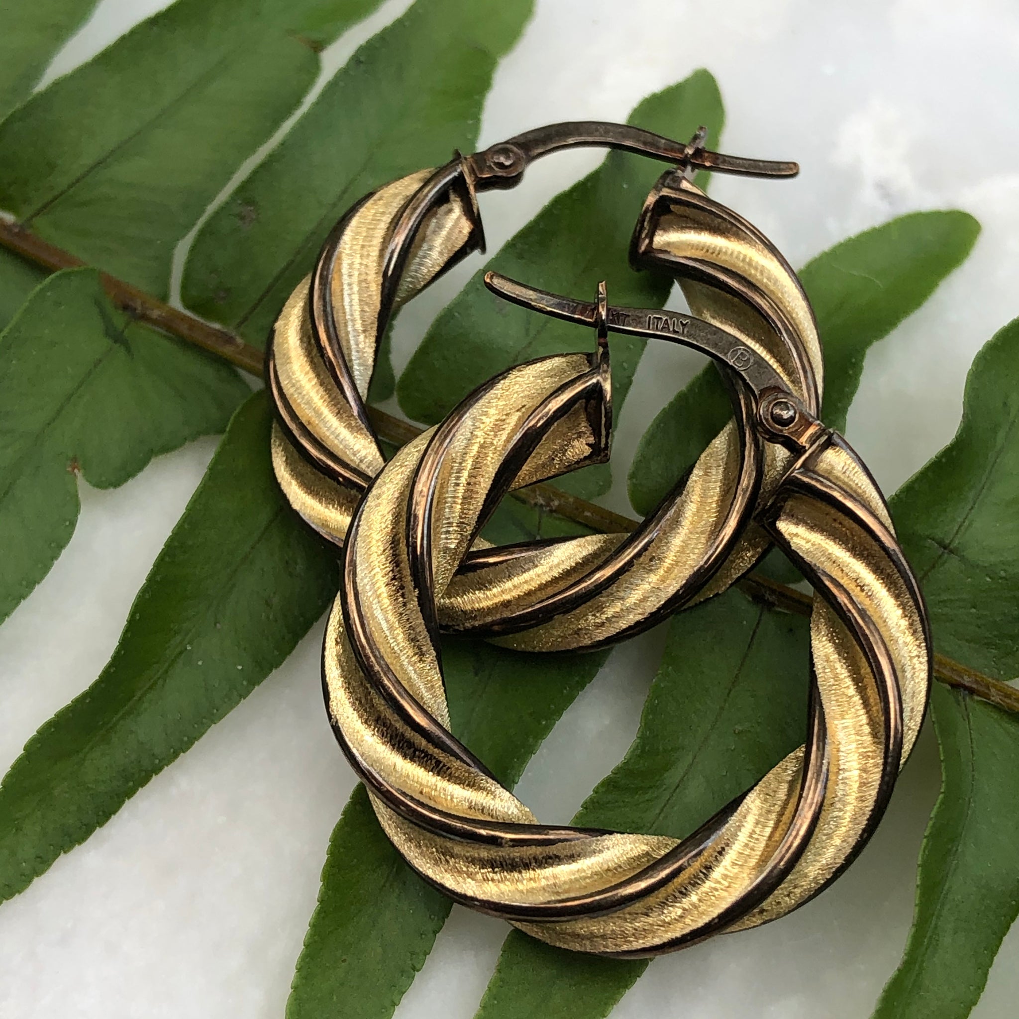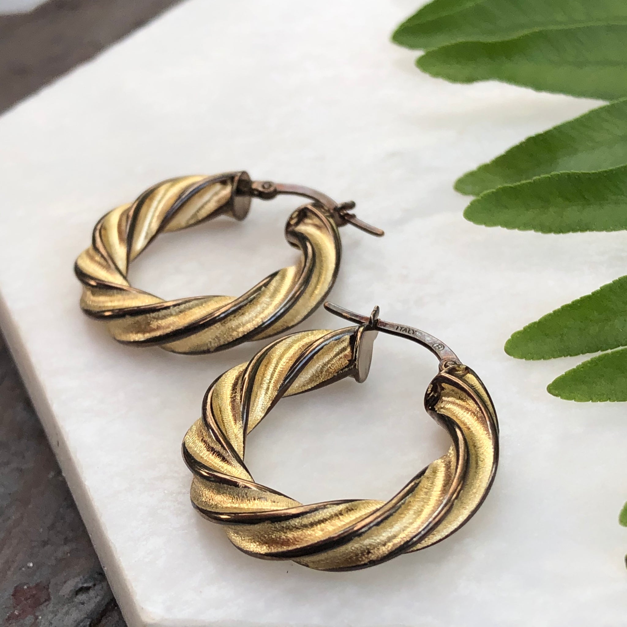14KT yellow gold + chocolate gold polished + matte twist hoop earrings.