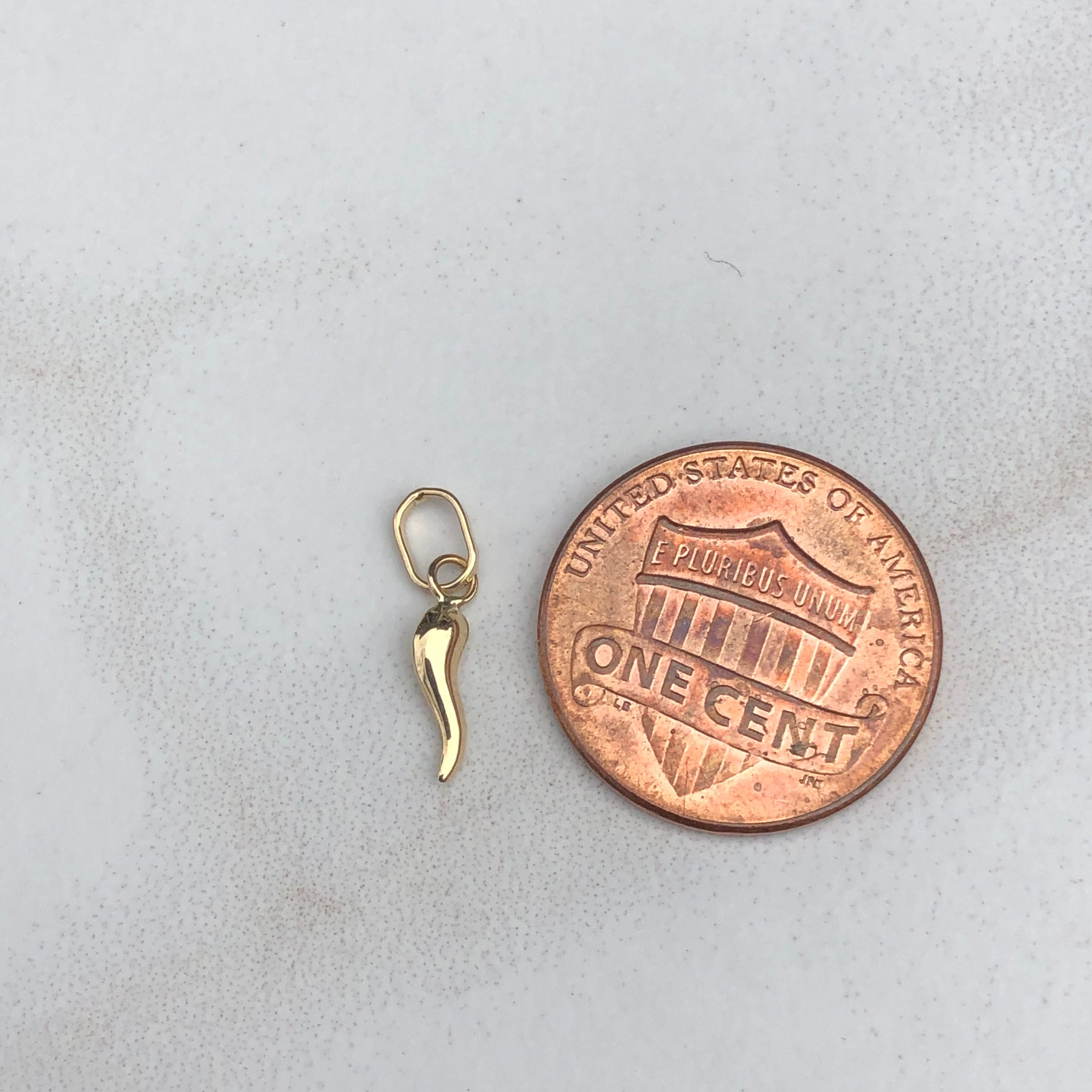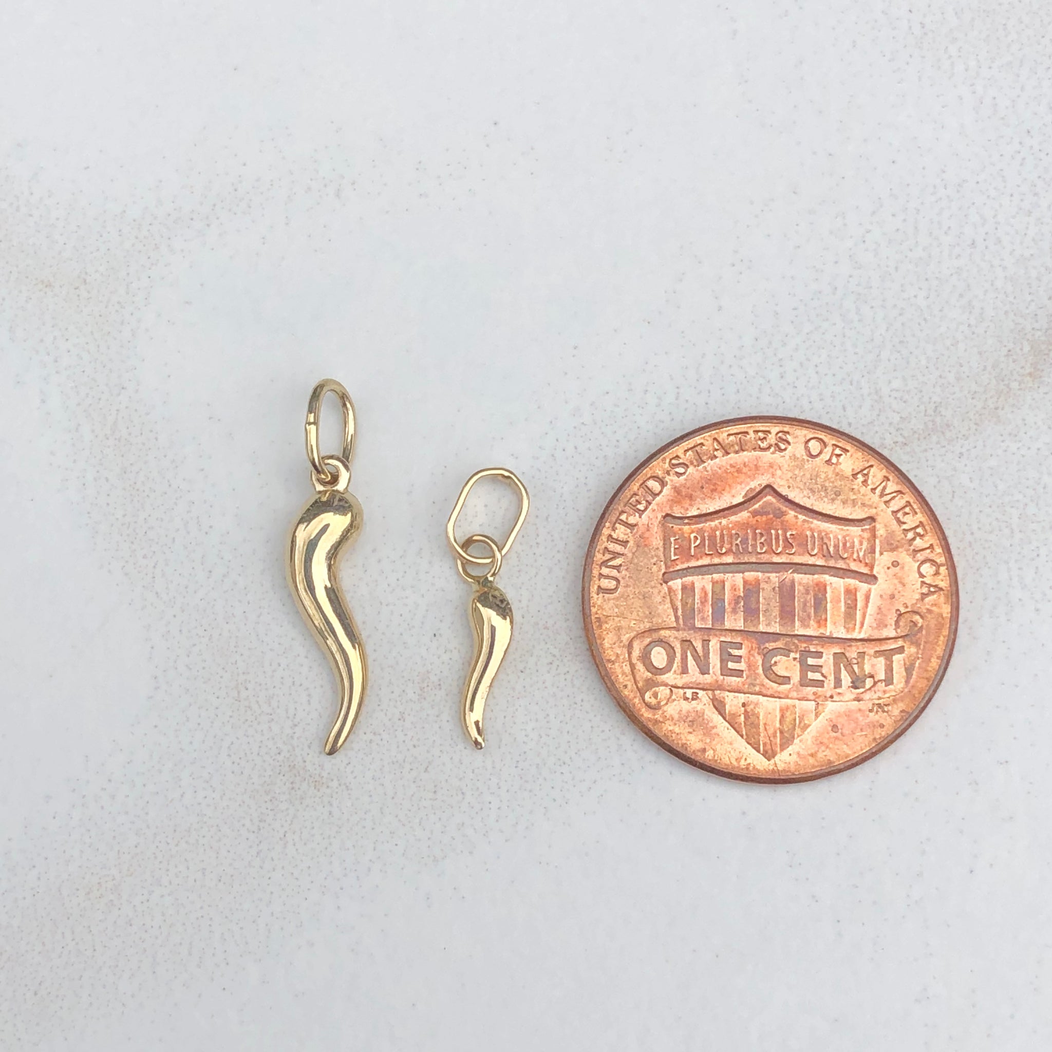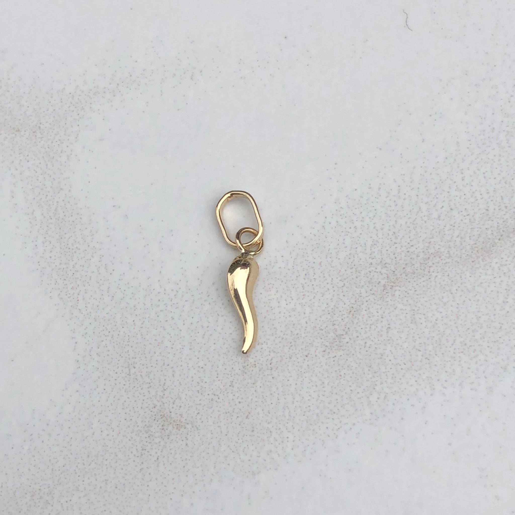 14KT yellow gold "Cornicello" Italian horn pendant charm. Symbol of Italy, "little horn", to protect against evil. Wear this lightweight charm on a charm bracelet or alone on a chain! We carry two sizes of the "Cornicello" charms; this one is the larger of the two sizes. Also available in white gold and rose gold.
