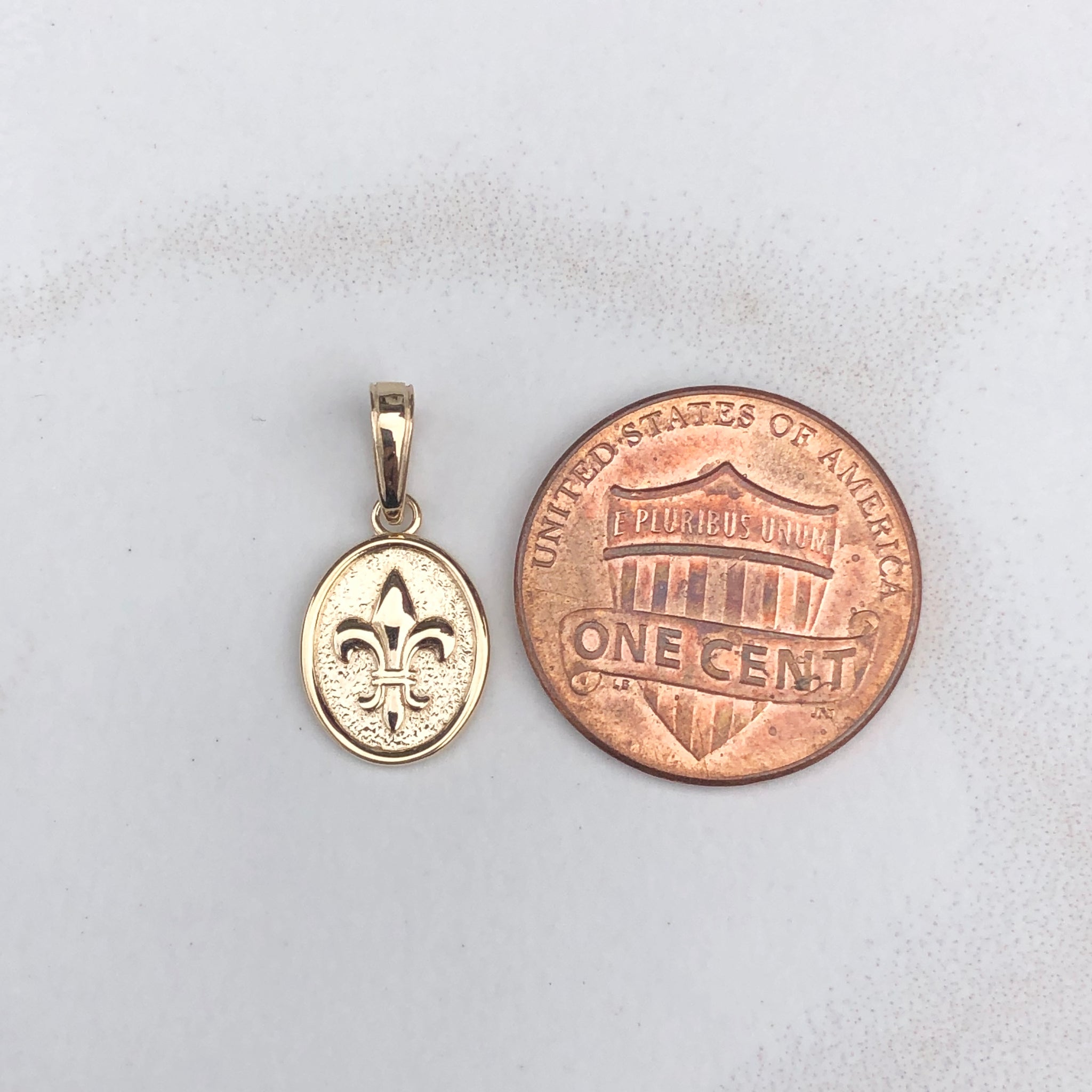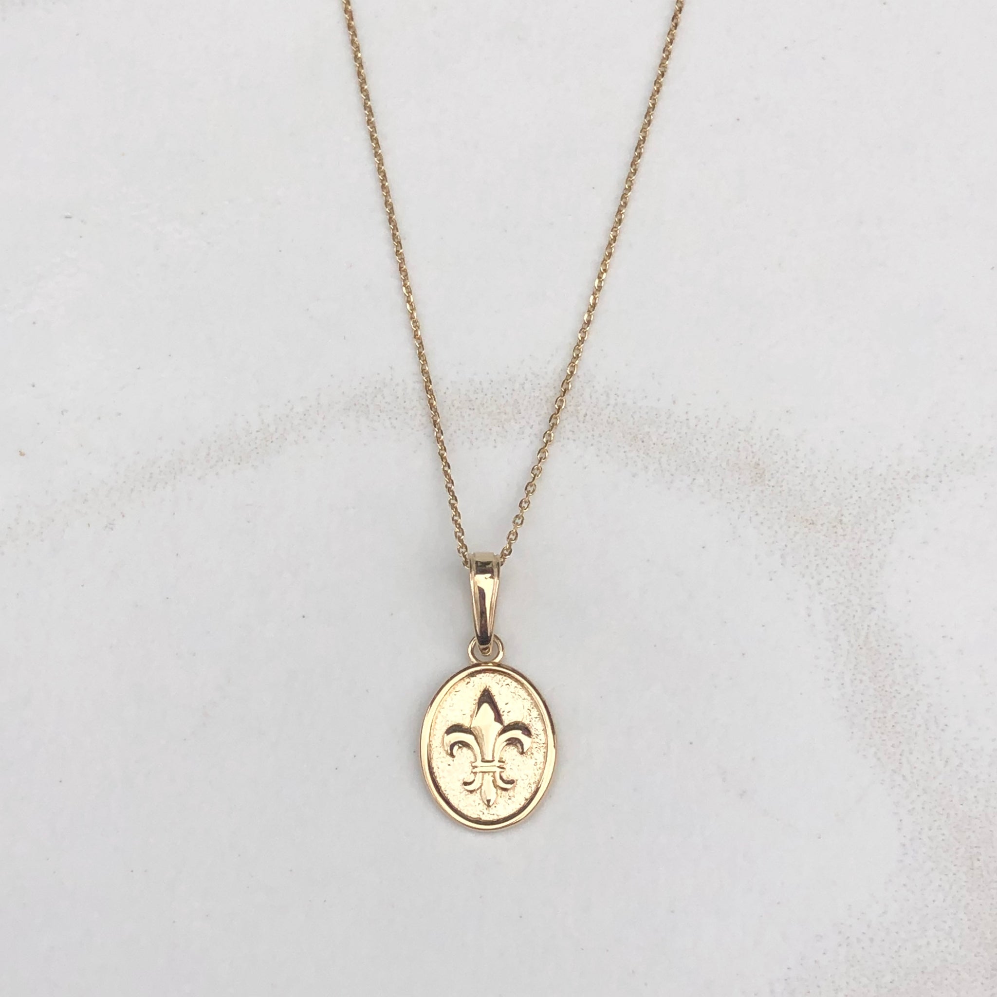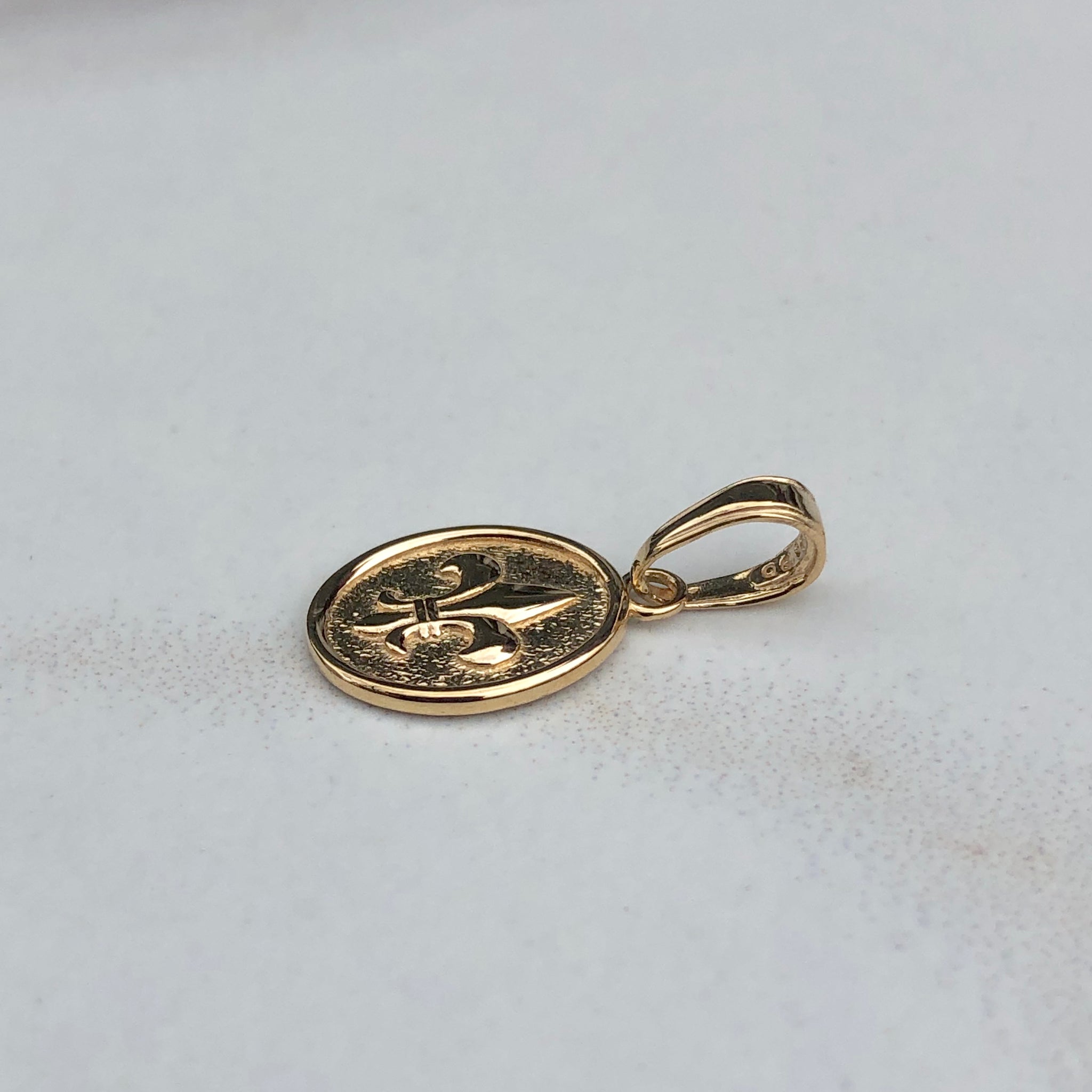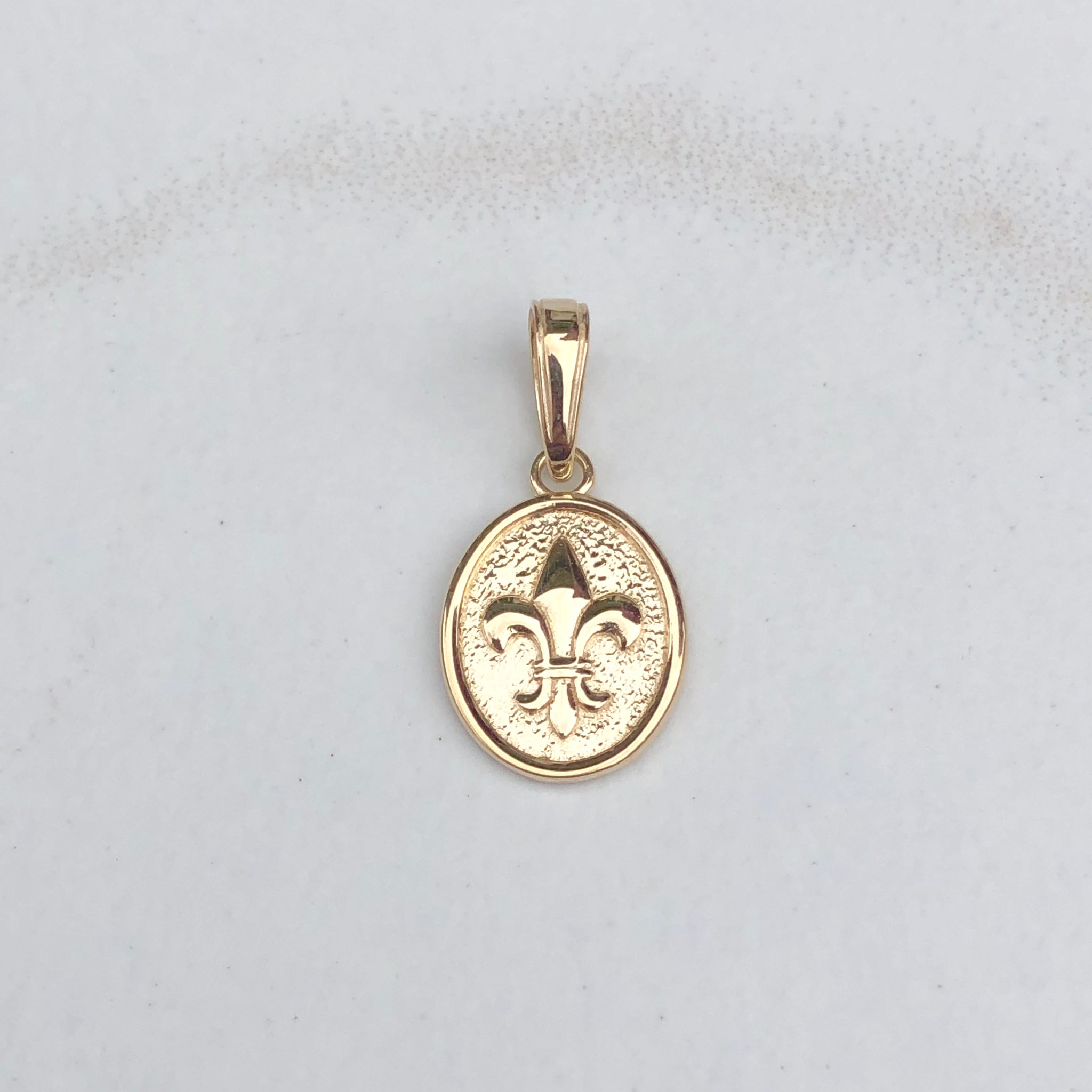 14KT yellow gold oval, raised, detailed Fleur de Lis pendant charm. A small charm perfect for sliding on a thin chain!