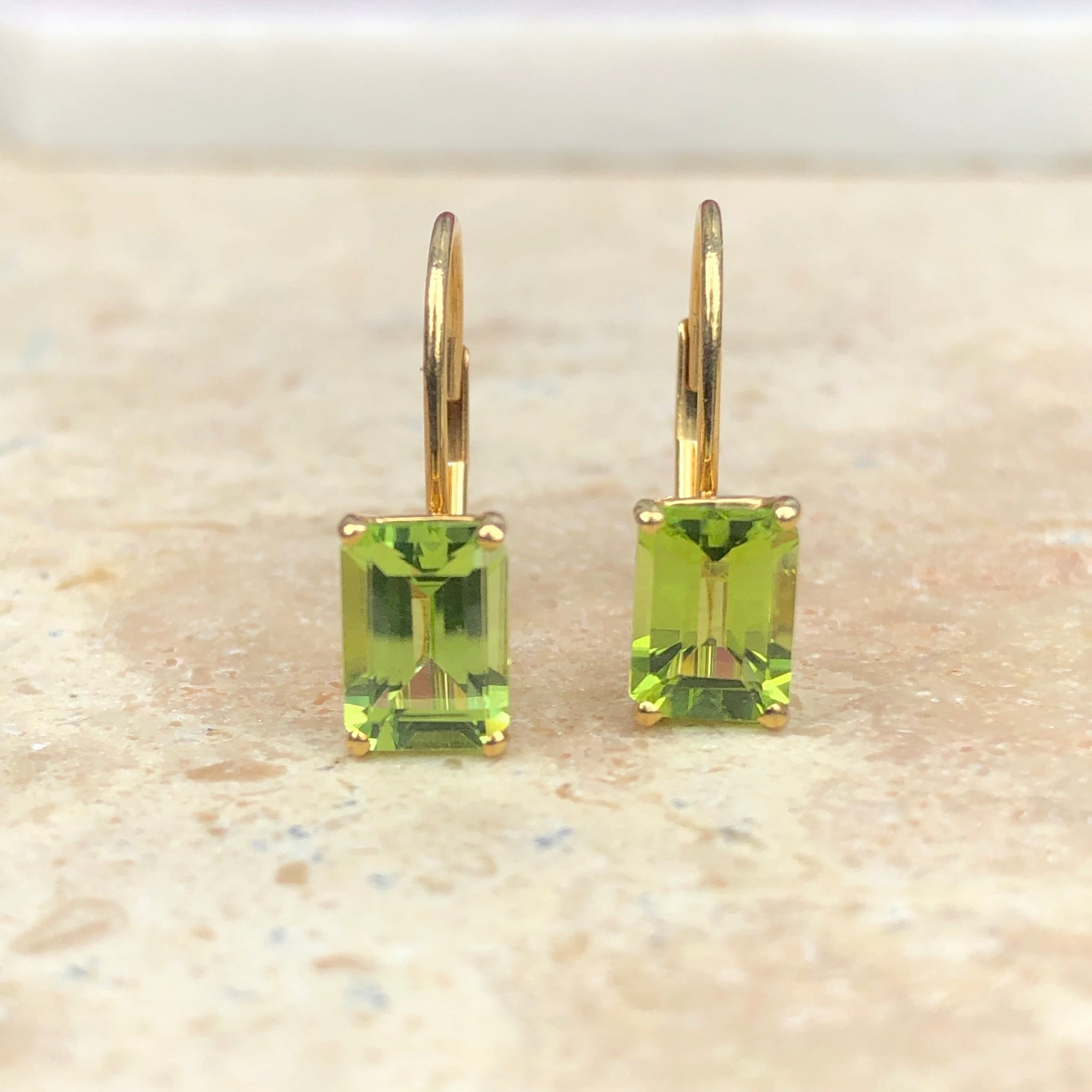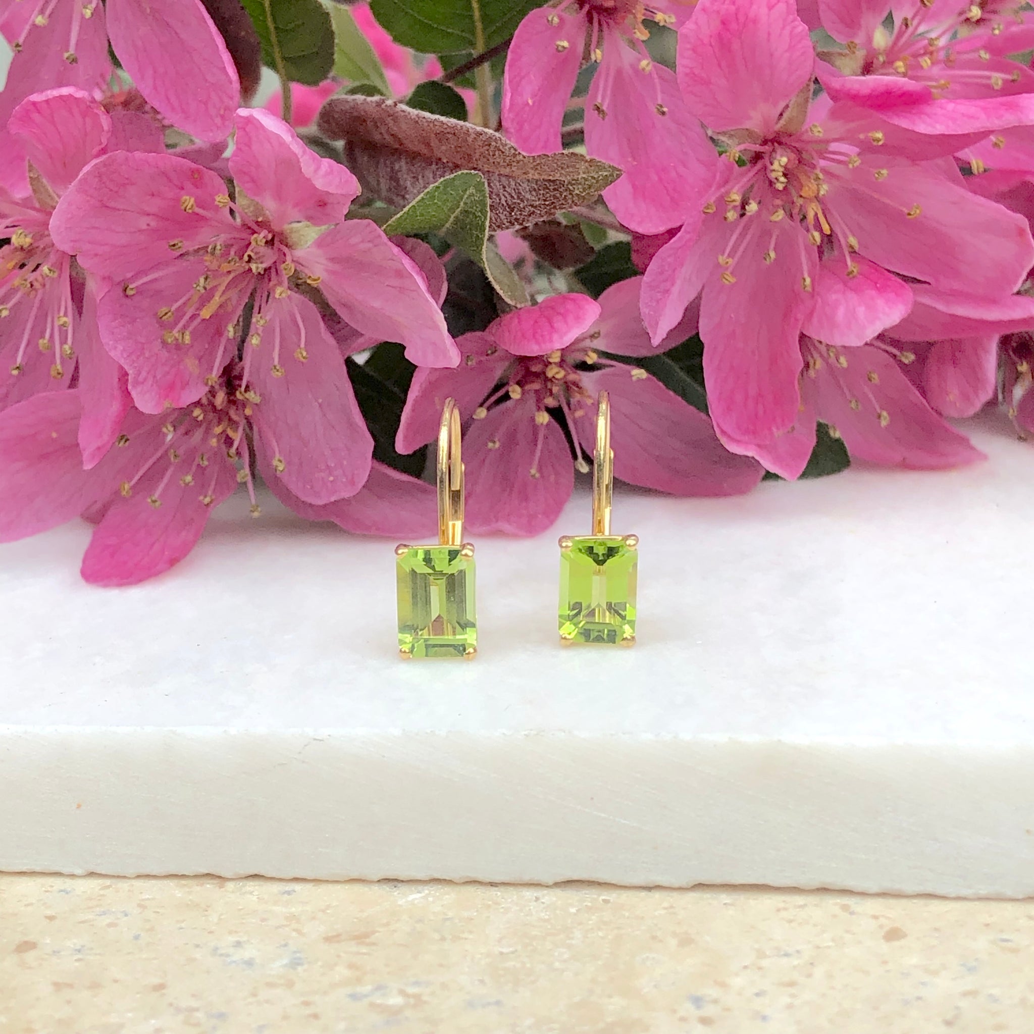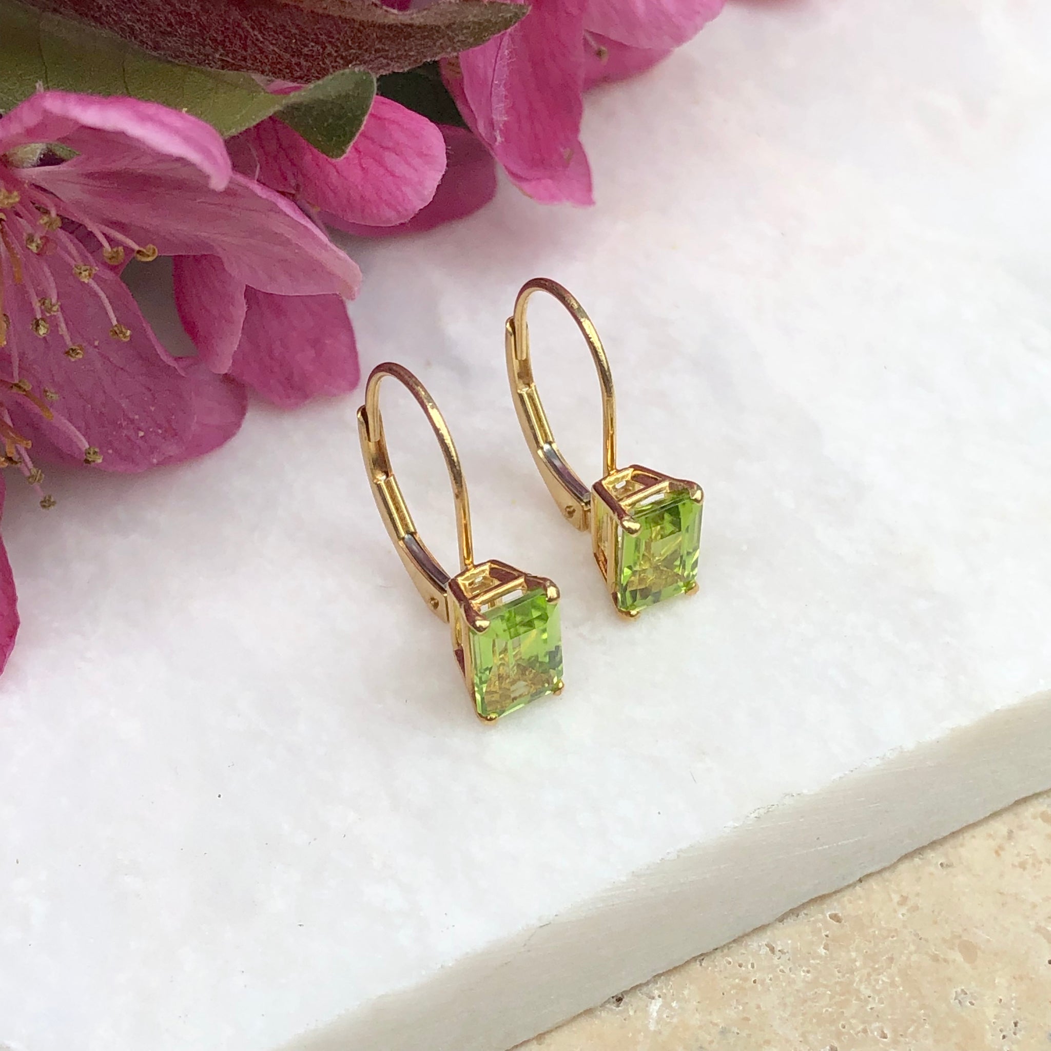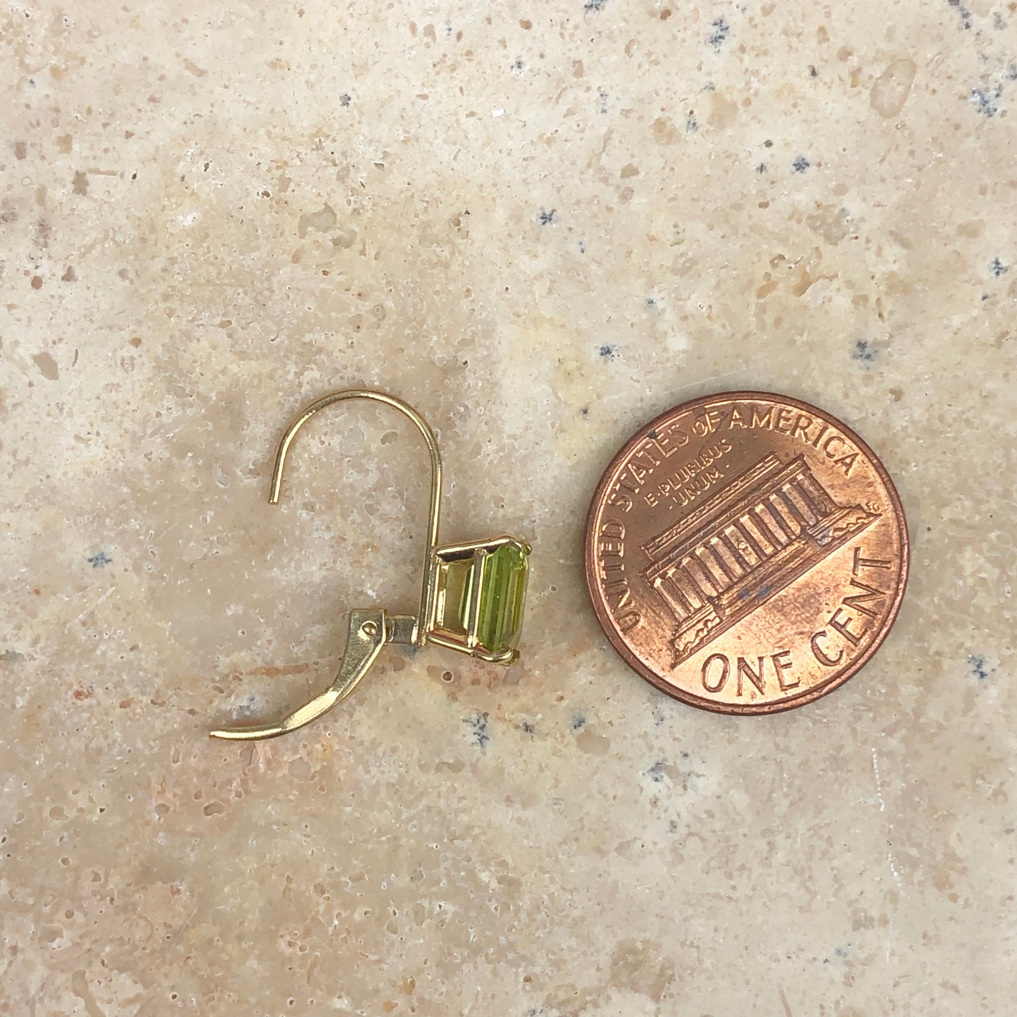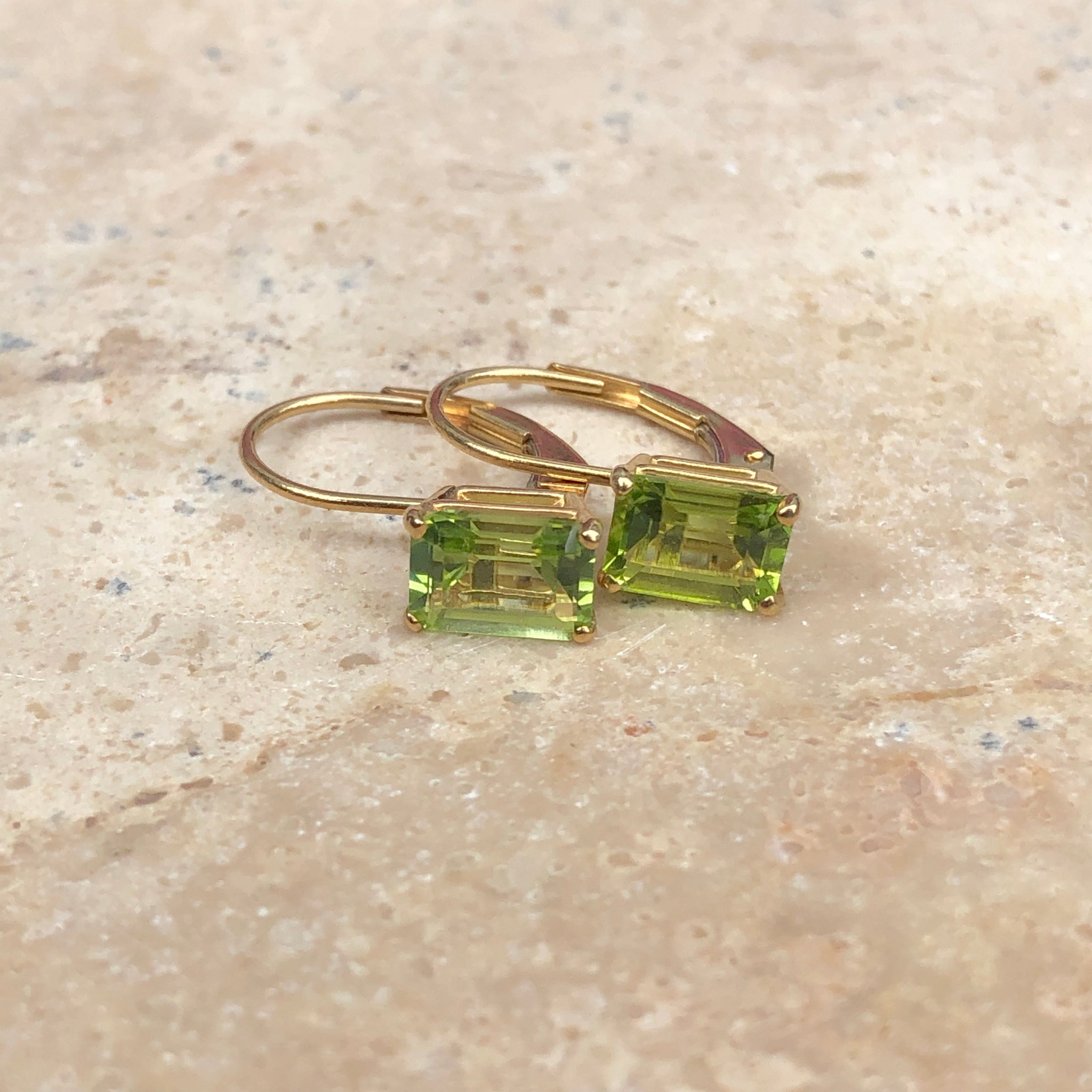 14KT yellow gold genuine, faceted, emerald-cut peridot lever back earrings. Lovely, light apple green color perfect for all seasons! These gemstone beauties are lightweight enough for everyday wear.