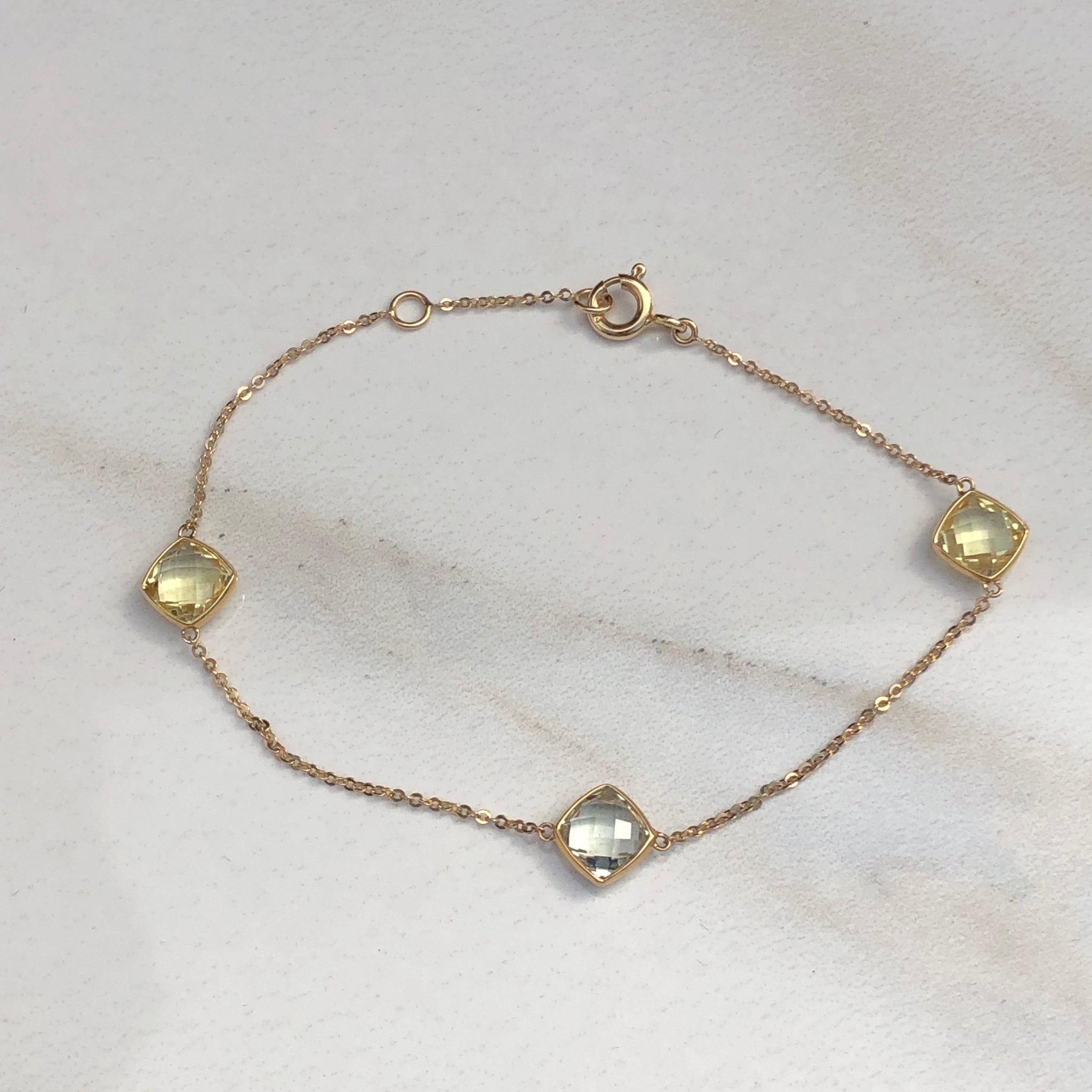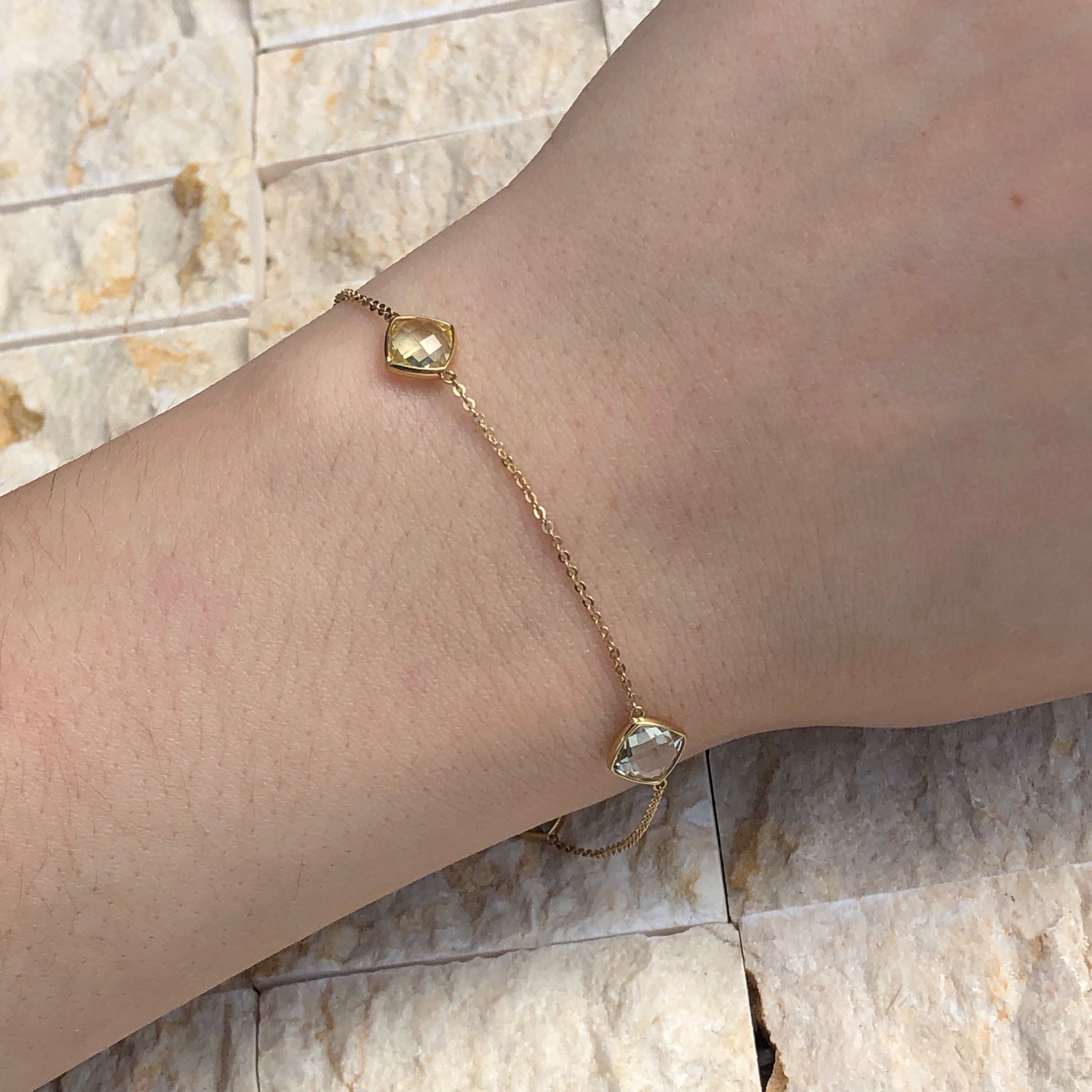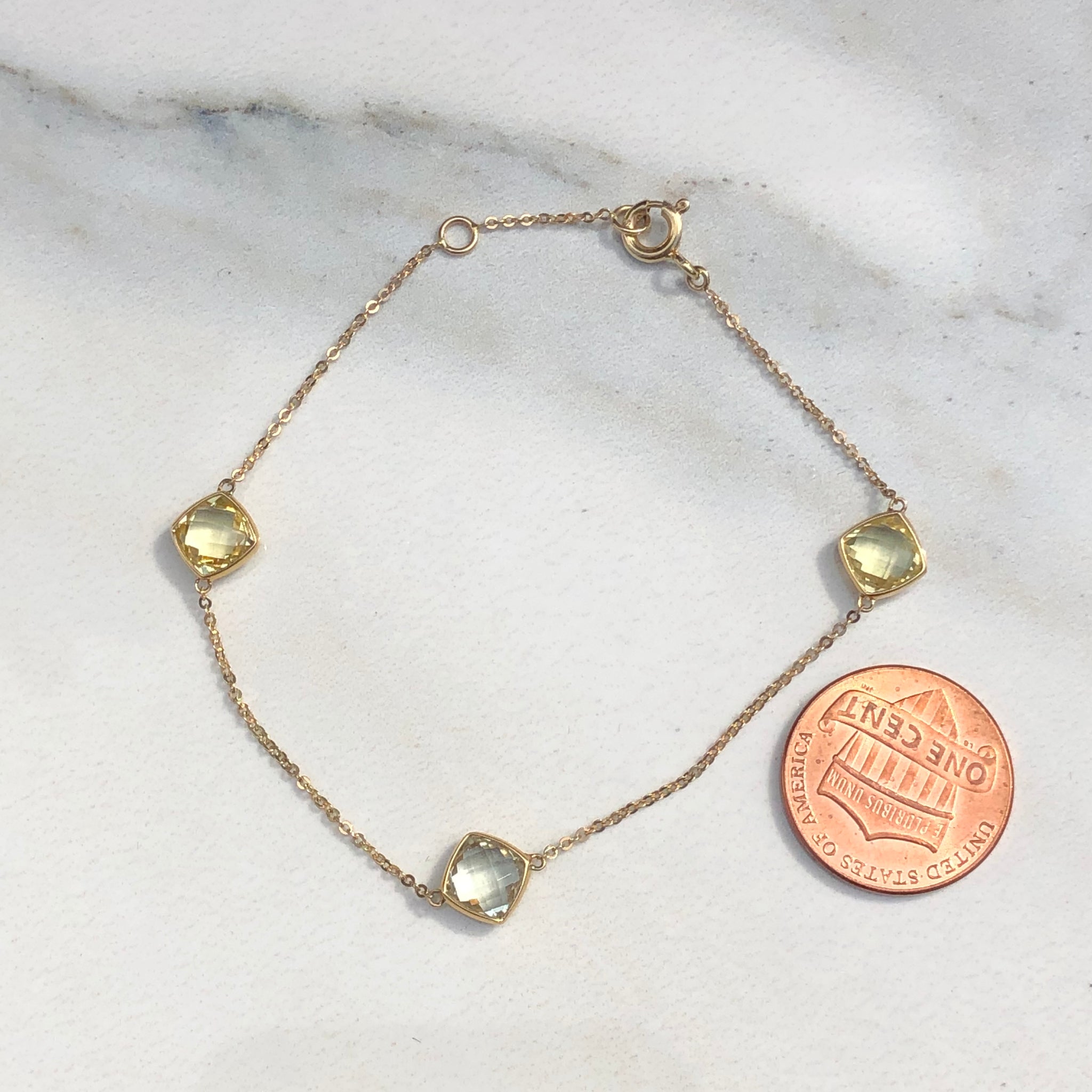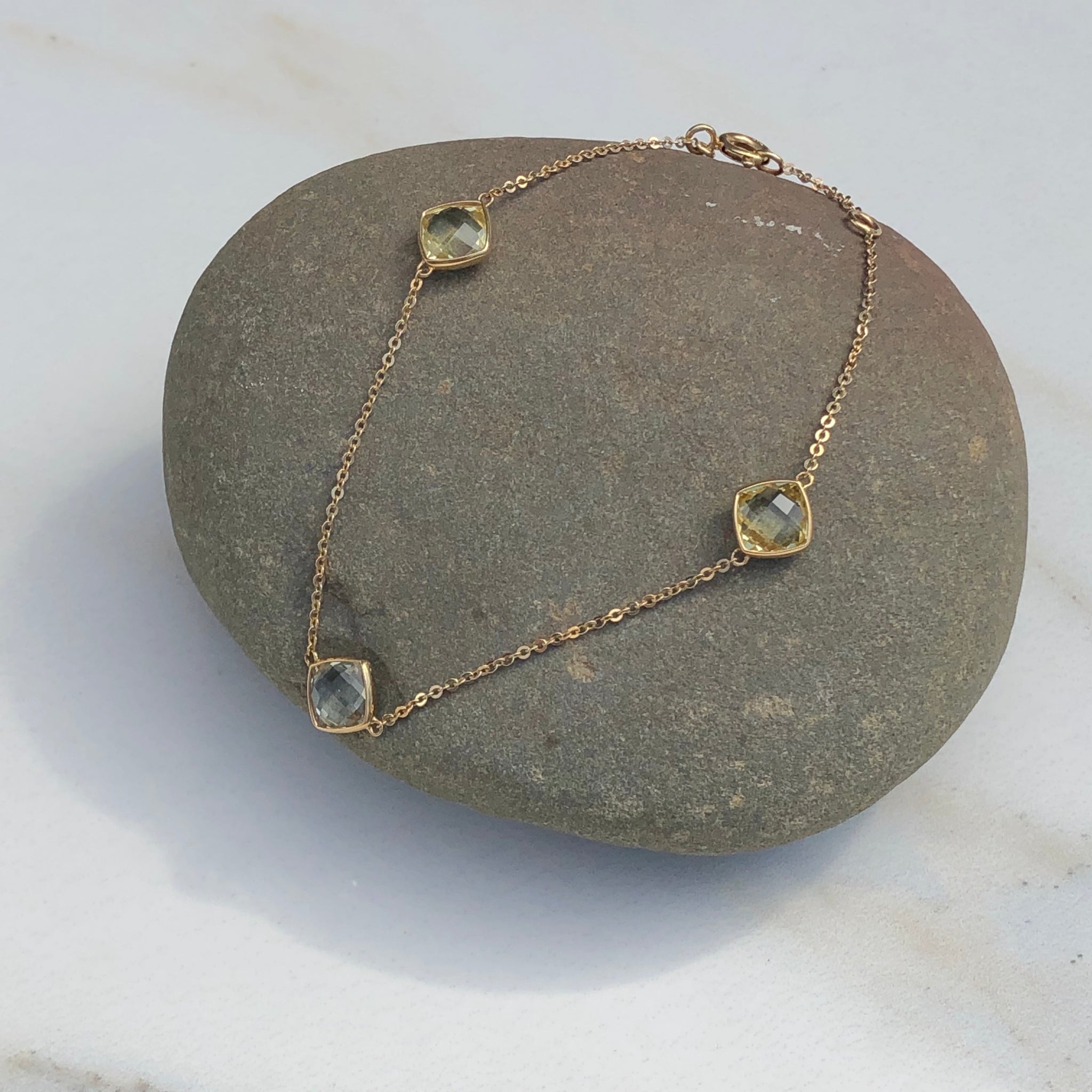 14KT yellow gold chain bracelet with bezel-set lemon quartz + green amethyst gemstones. Features lovely shades of lemon-lime translucent gems.
