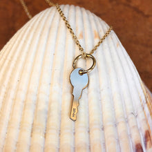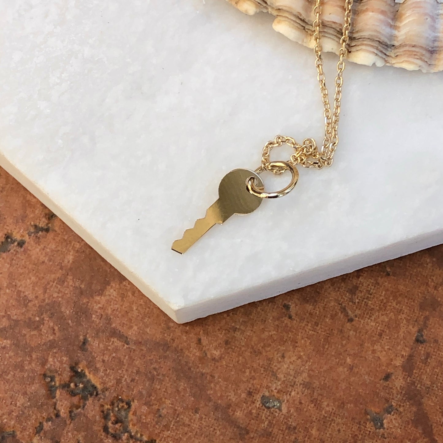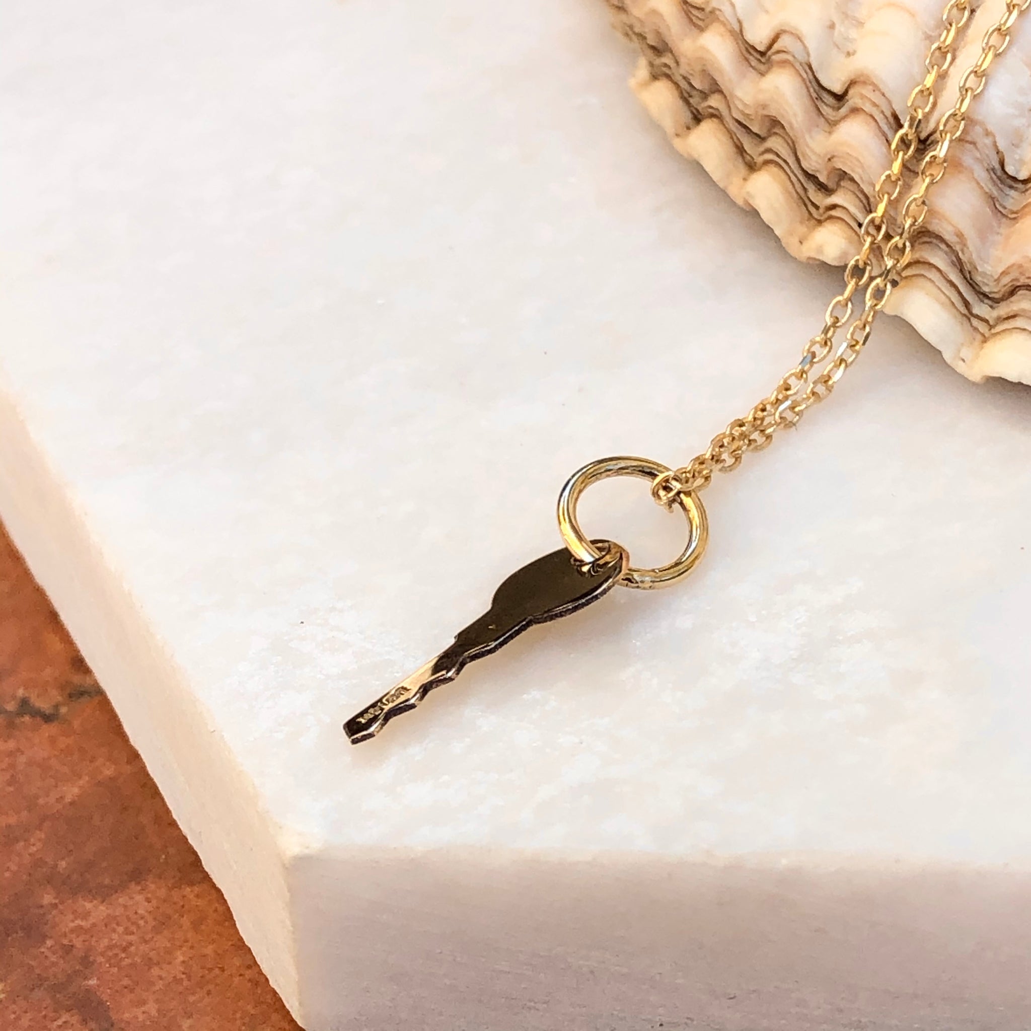14KT yellow gold tiny, baby-sized flat key pendant charm. This pretty charm also would be a great addition to a charm bracelet, on hoop earrings, or worn alone on a light chain.