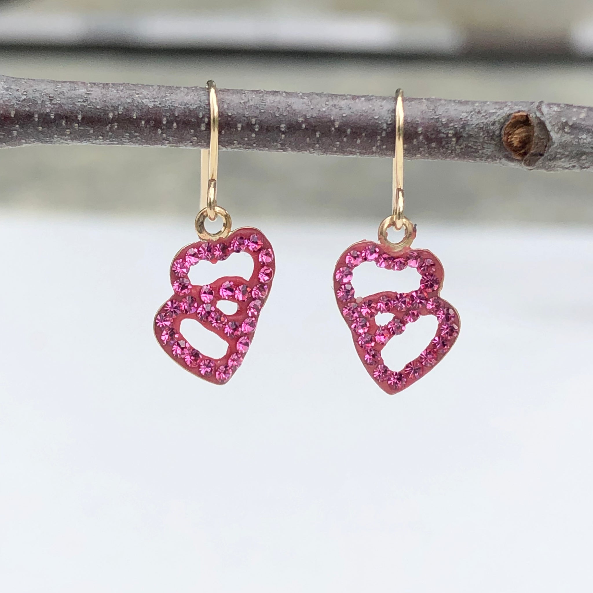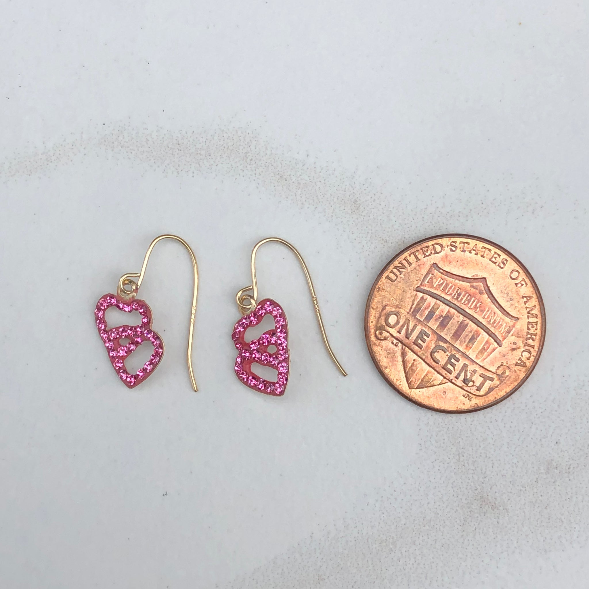 14KT polished yellow gold with pink pave crystal stones on double hearts dangle earrings. Makes the perfect gift for a child or teen!