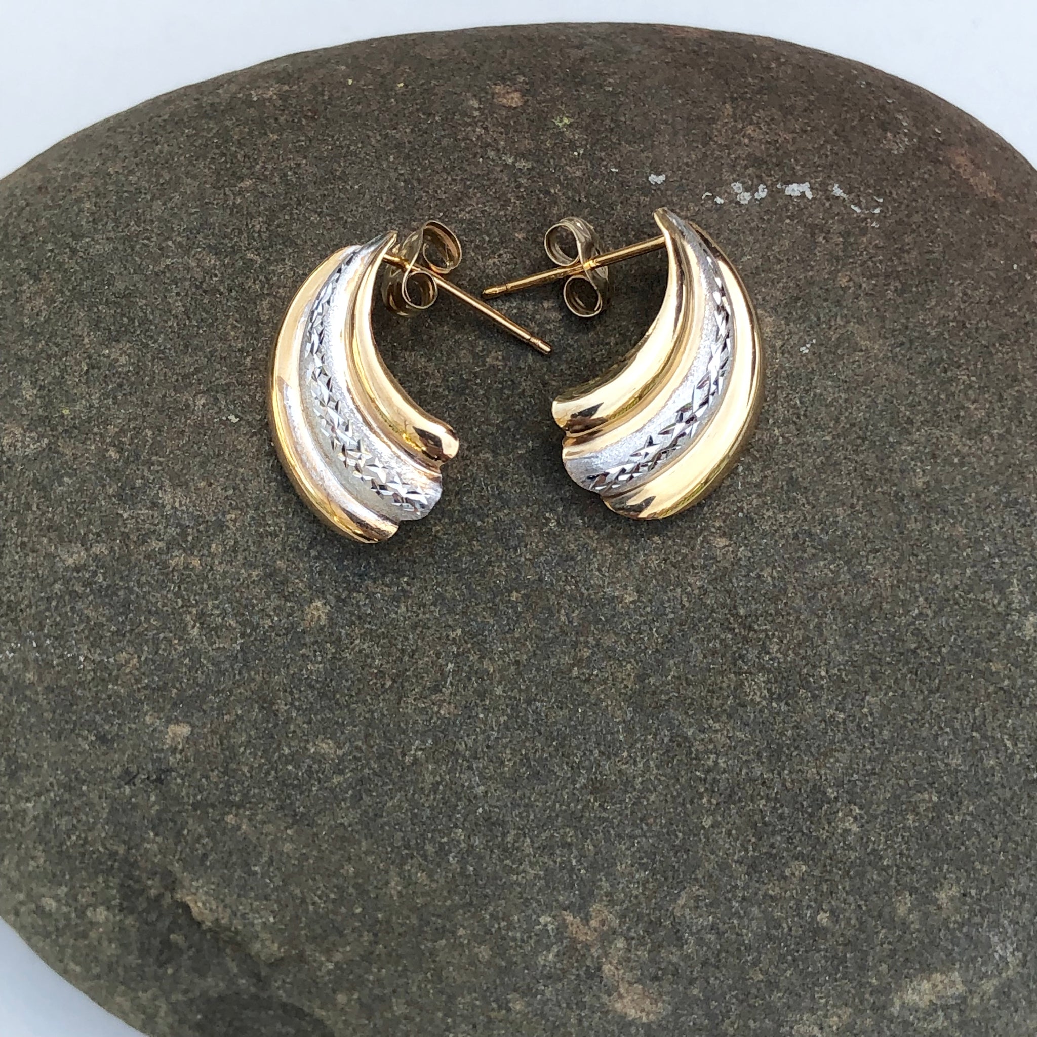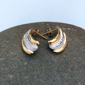 14KT white gold + yellow gold shiny diamond-cut shell post earrings. Beautiful, delicate two tone earrings with one earring for the left ear + one earring for the right.